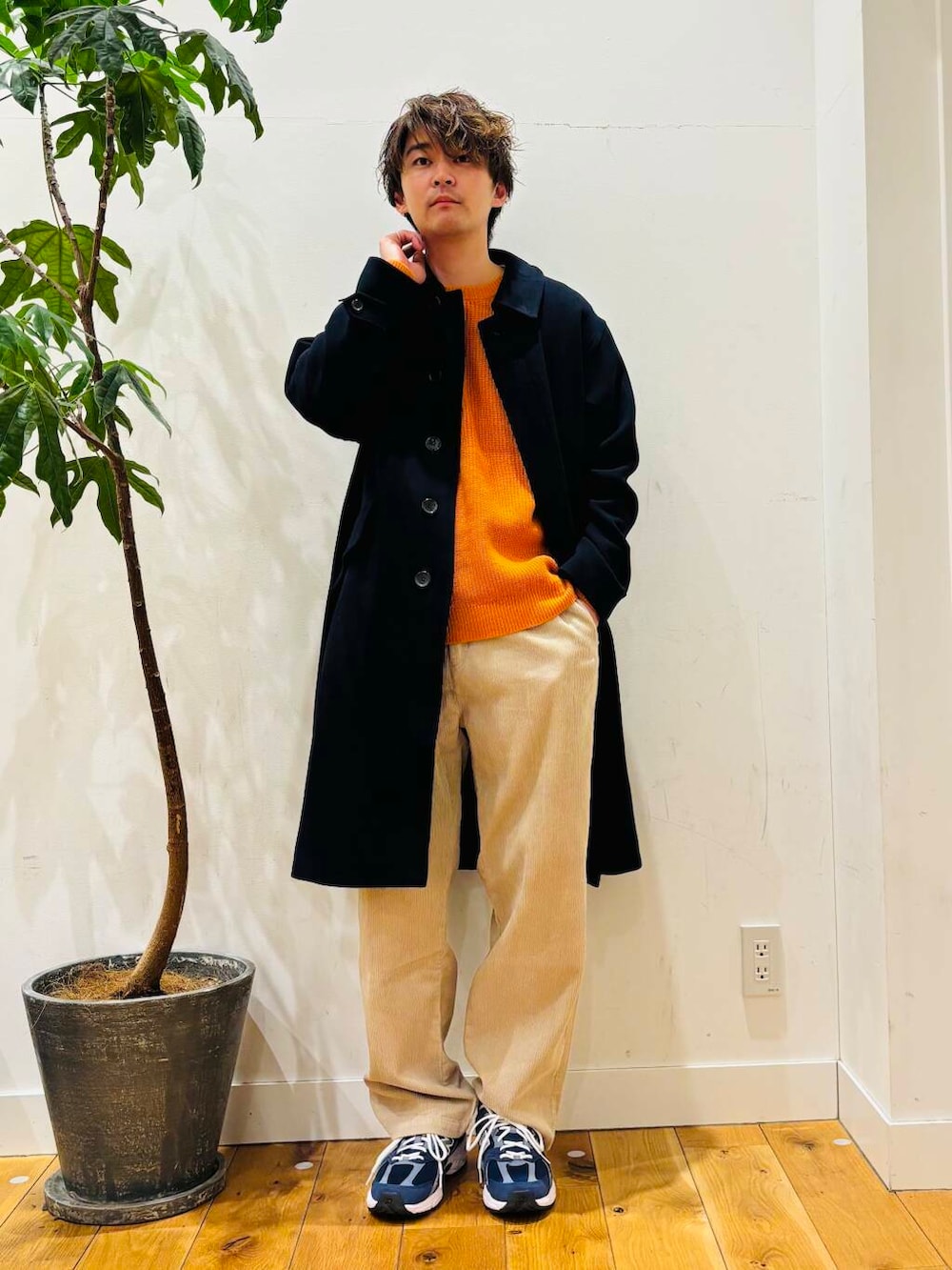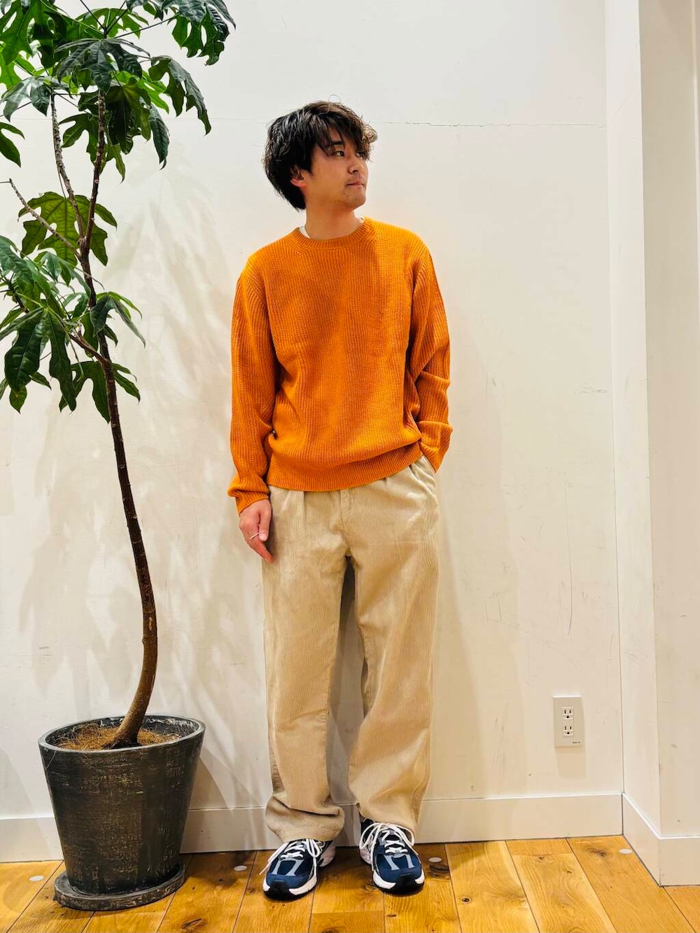 今回は、オレンジカラーのニットを使ったコーディネートを組んでみました。