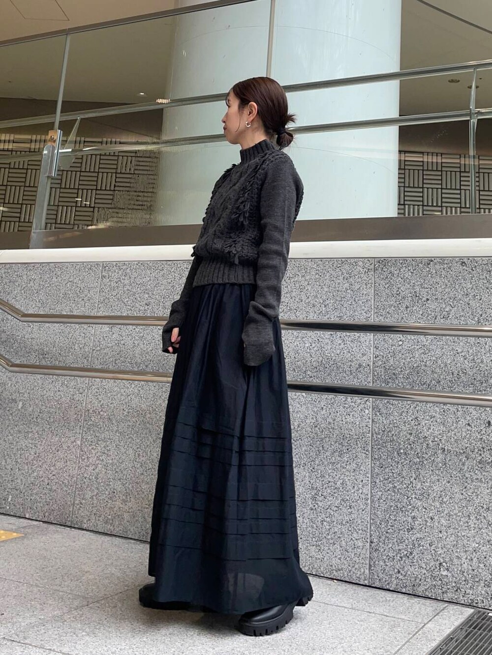 コンパクトなケーブルニットにボリュームのあるスカートで合わせて大人カジュアルコーデにしました。
