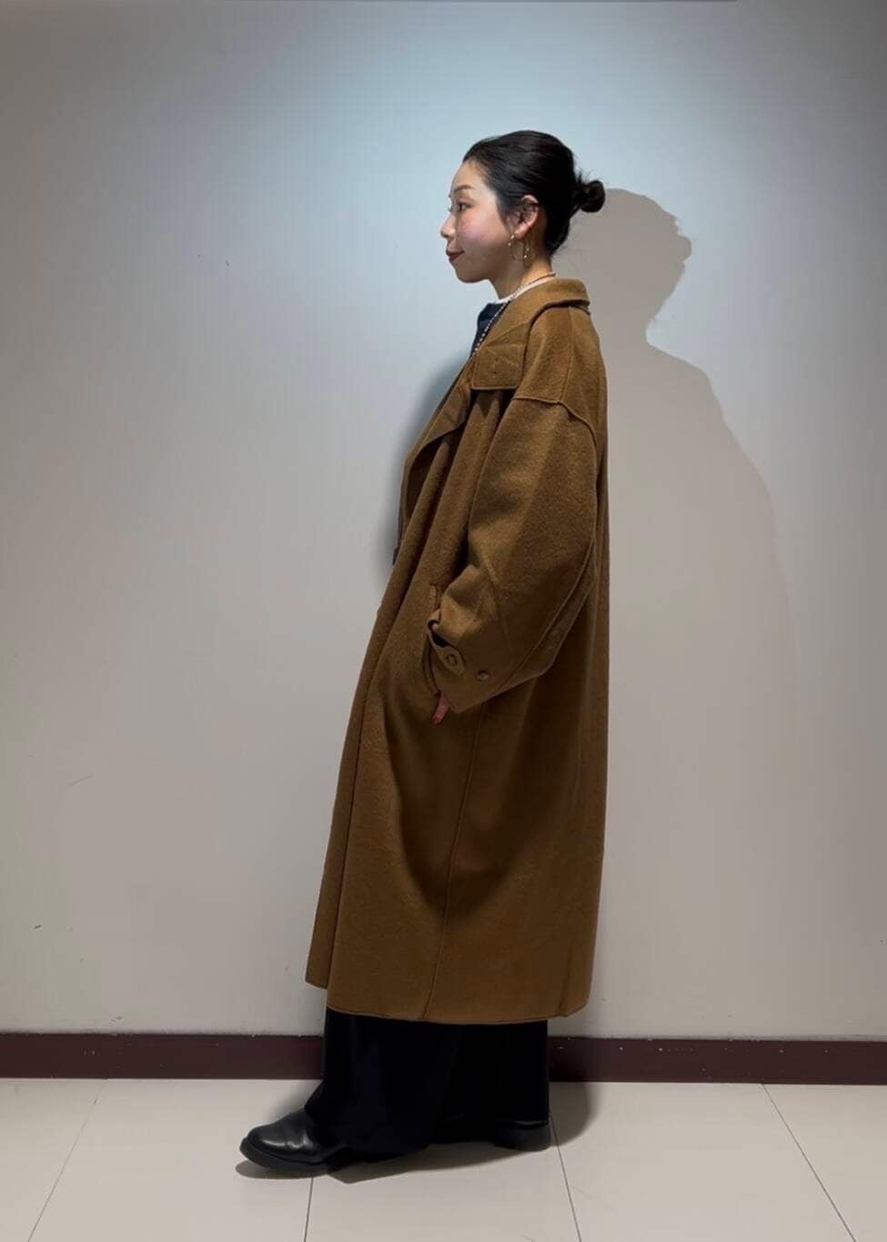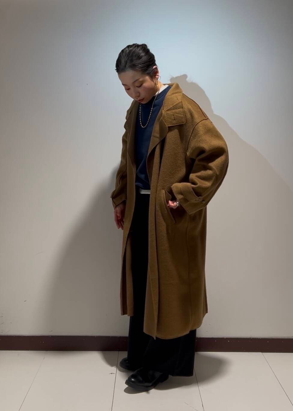 アウターの丈が長く、トップスやボトムスもネイビーとブラックでまとめたので、髪の毛はアップにしてスッキリとさせました♩