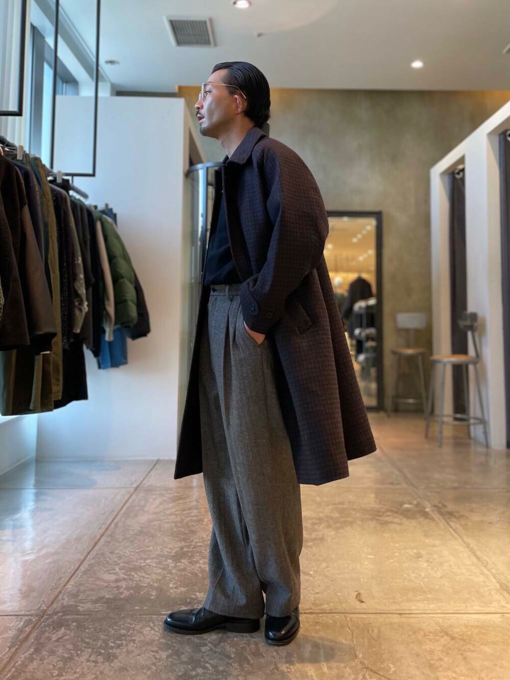 柄×柄の合わせになるが、そこはシンプルな黒のニットと足元の黒のレザーシューズで帳尻を合わせるスタイル。