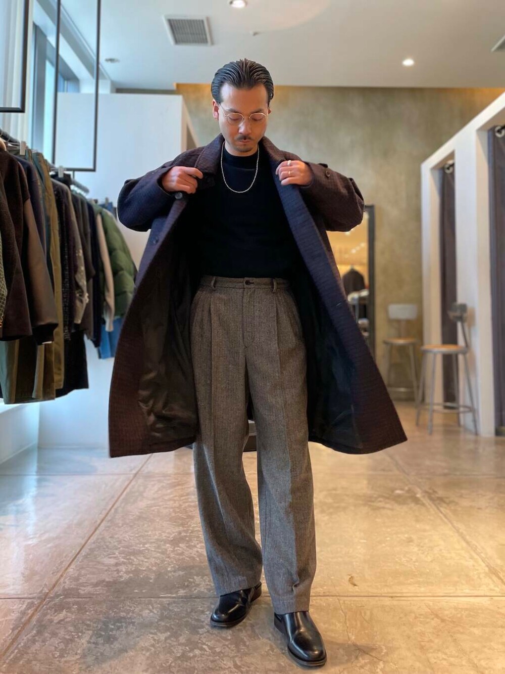 合わせるアイテムはシンプルな黒のニットに今年らしいヘリンボーンのパンツ。