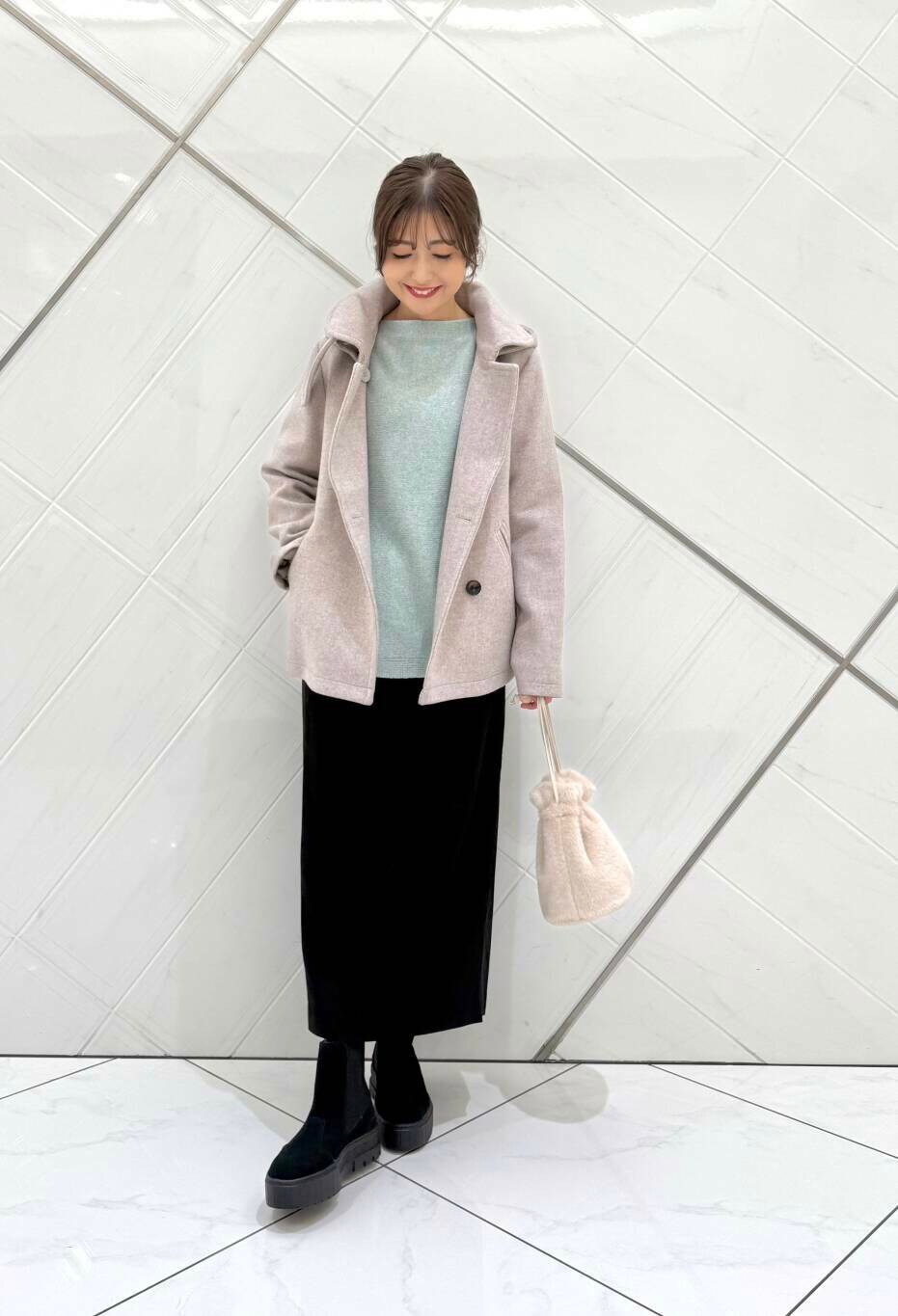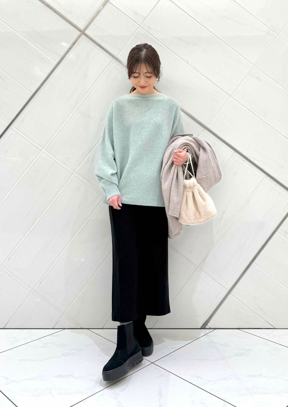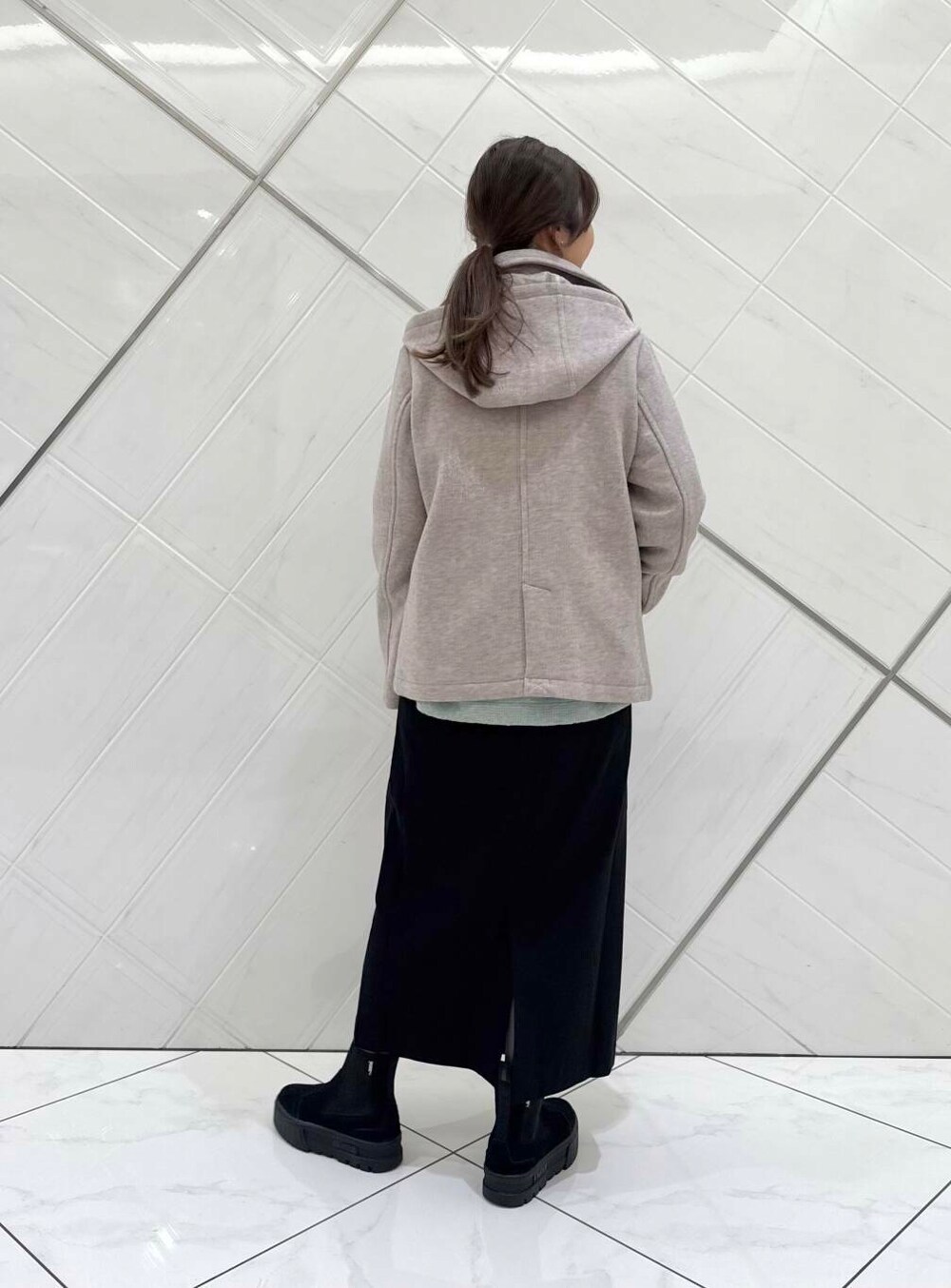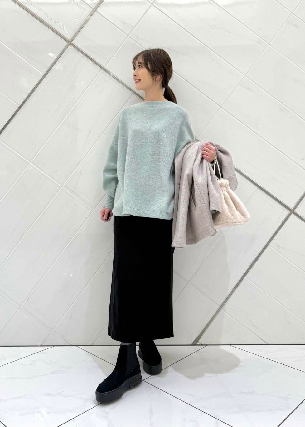 スカートは裏起毛になっているので暖かく、ストレッチも効いているのでタイトなシルエットでも動きやすく、ウエストもリボン調整ができます。