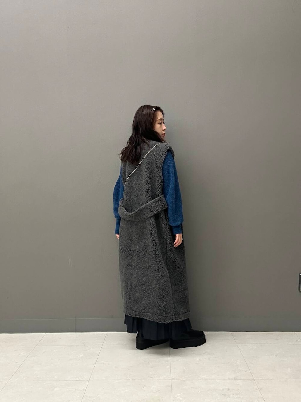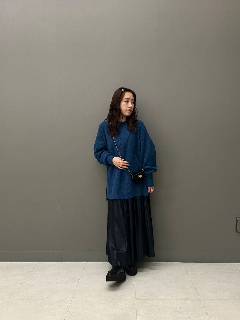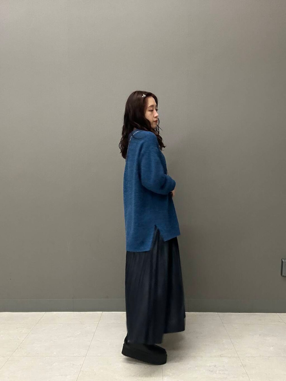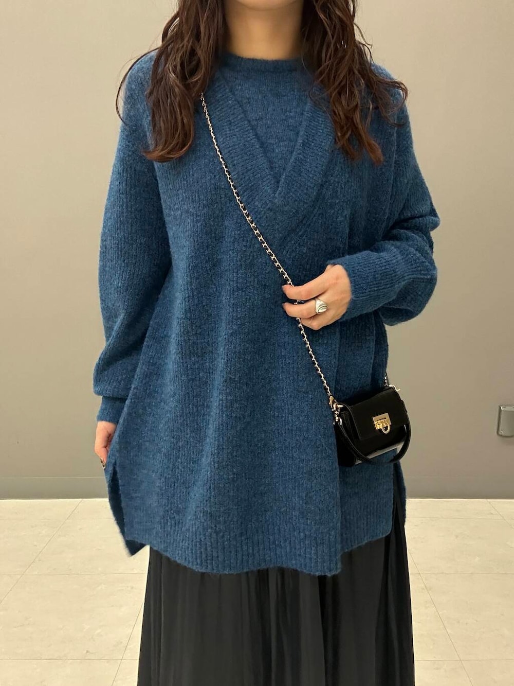 トップスは深いVネックとクルーネックをレイヤードしたようなデザインで周りと差をつけられるニットです