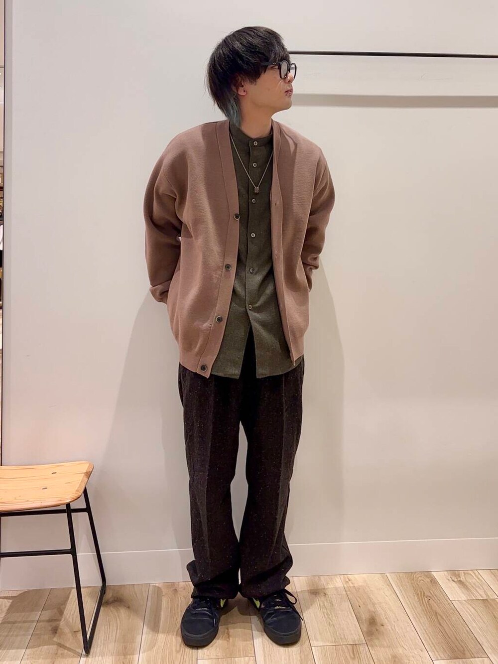 バンドカラーシャツにミラノリブカーディガンを合わせて暖色コーデに☀️