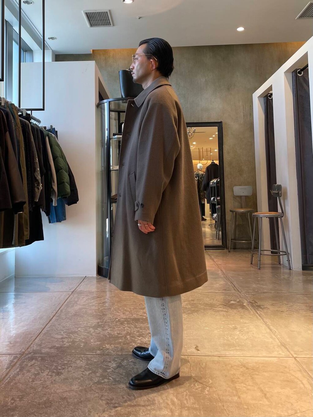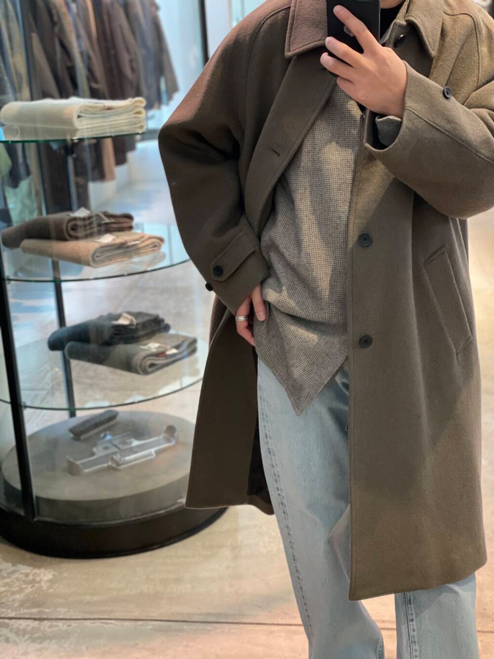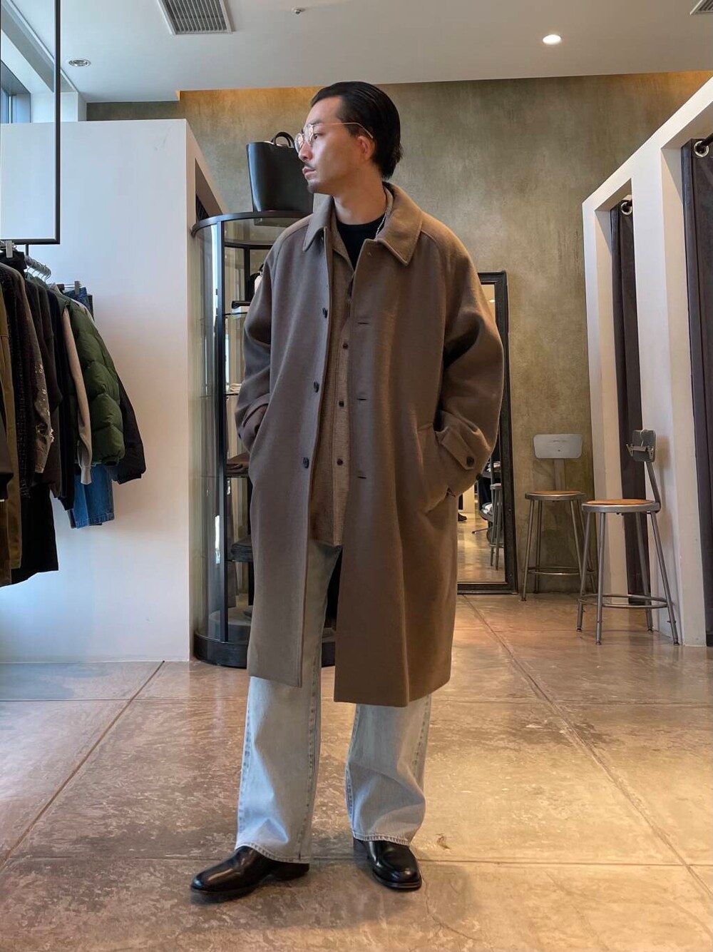 今回のコートはMOCAのカラーだったので全体のトーンは合わせながら、チェックシャツとアイスブルーのデニムで大人の休日スタイリングです。