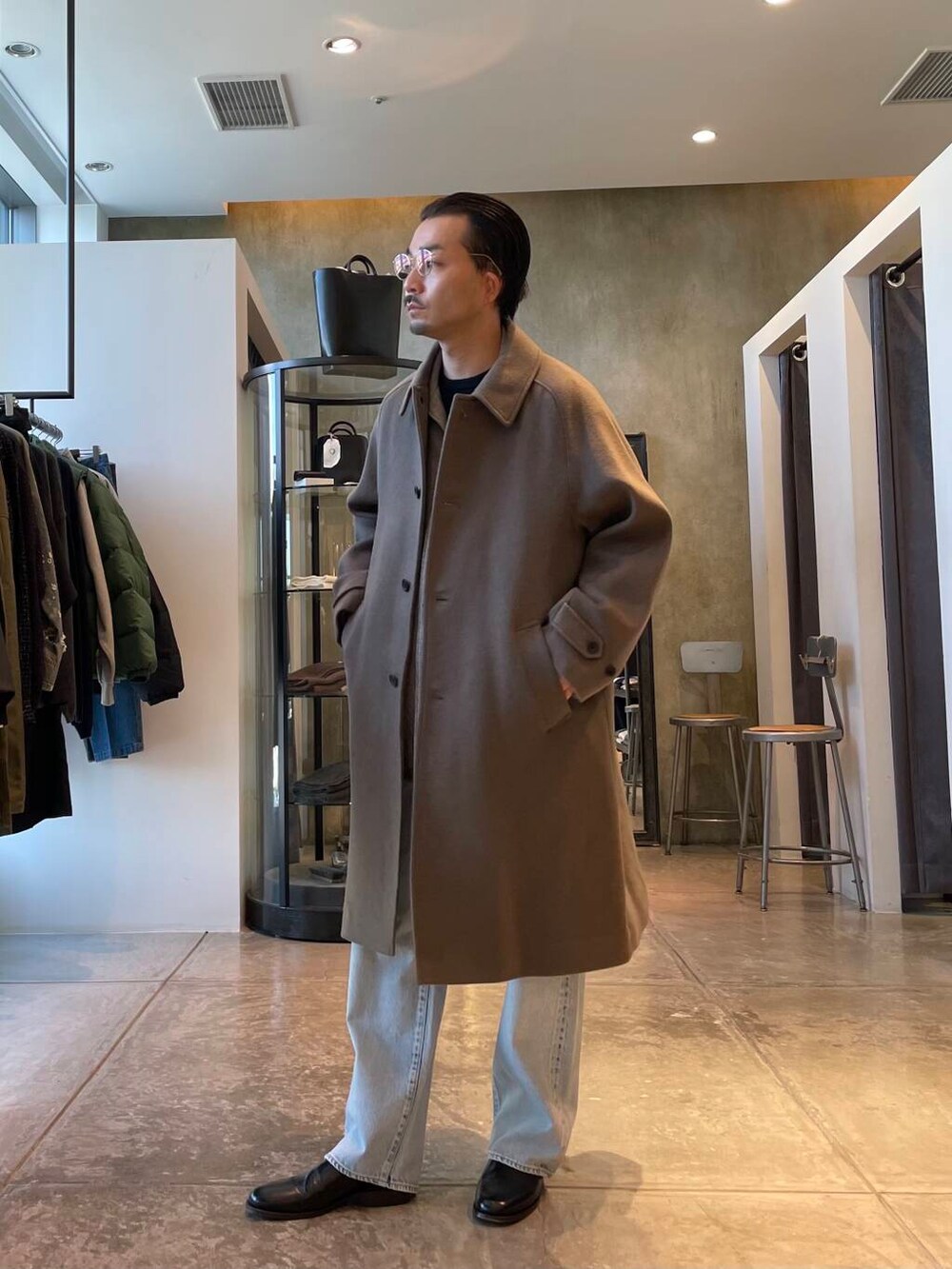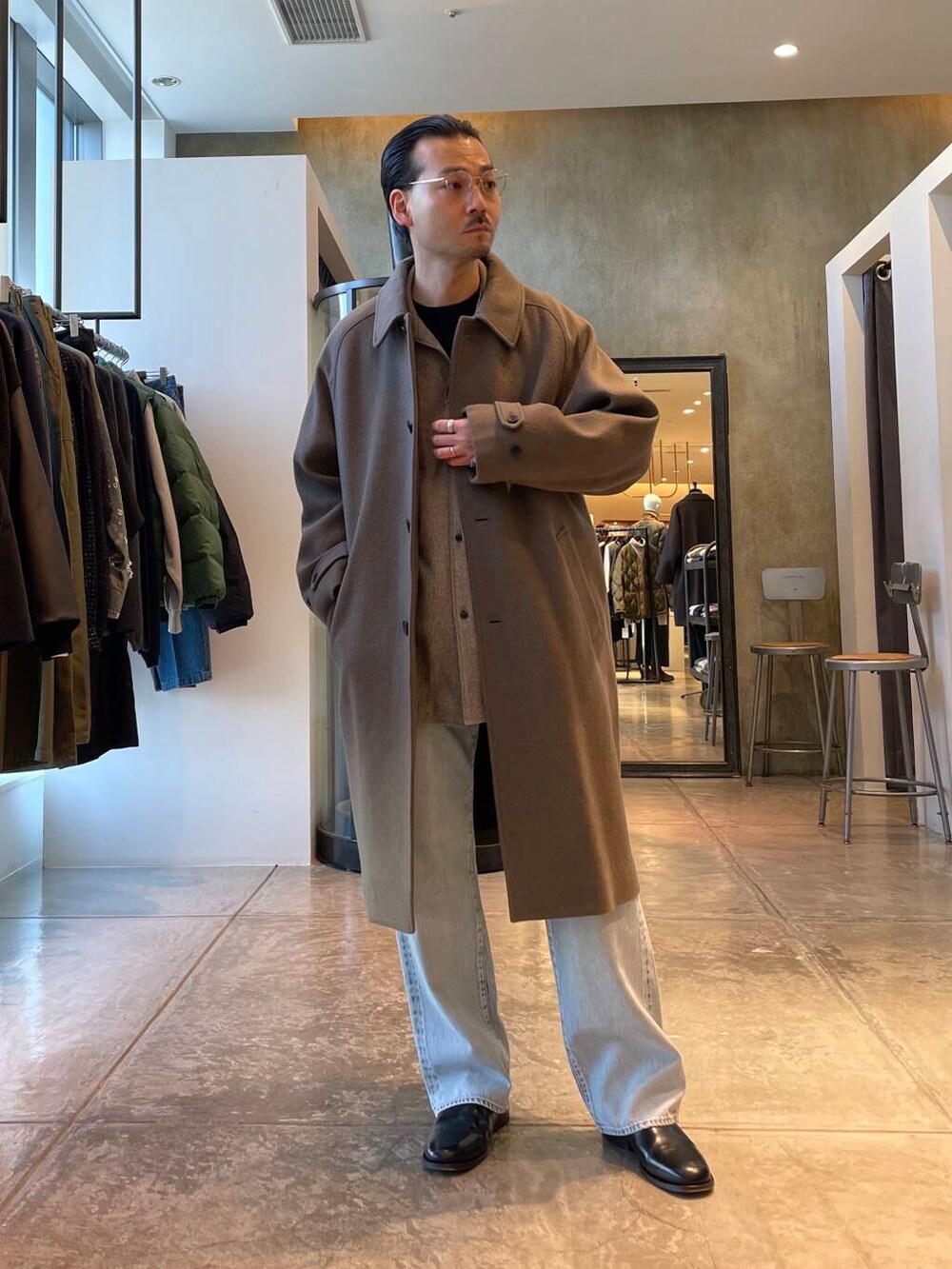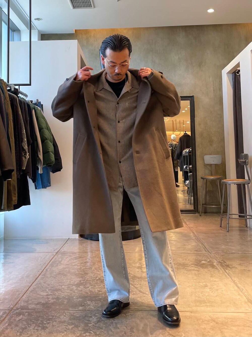 コートを脱いだ際も決まる様に、オーバーサイズのチェックシャツにデニムはストレートデニムでスッキリとまとめております。