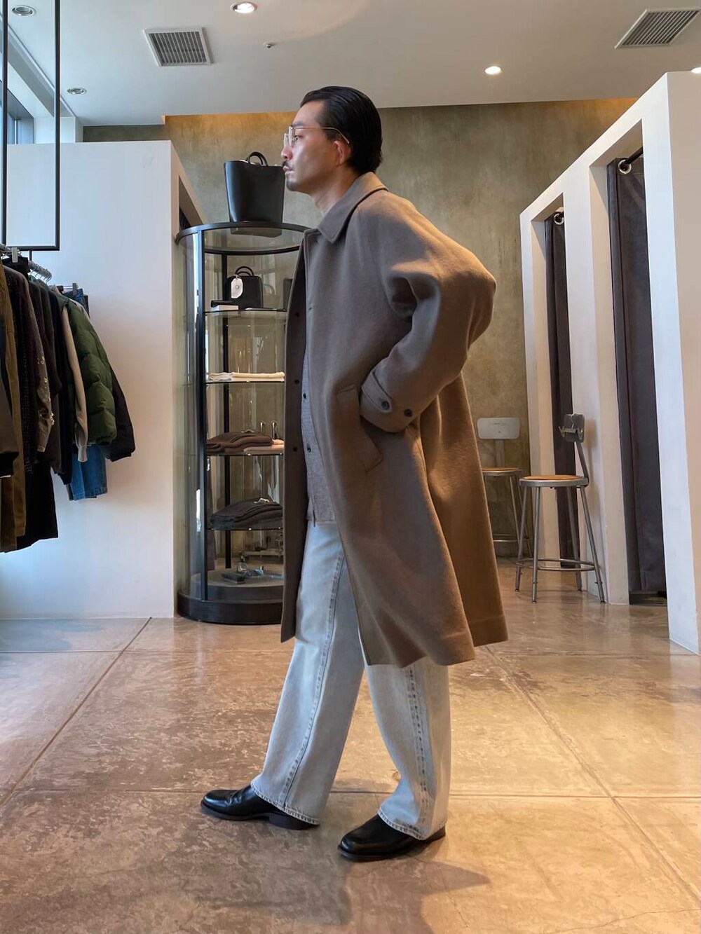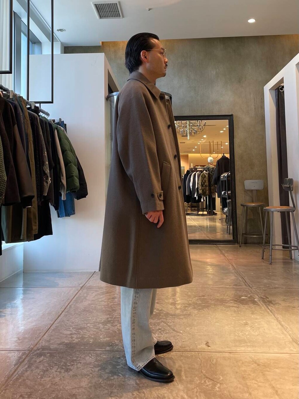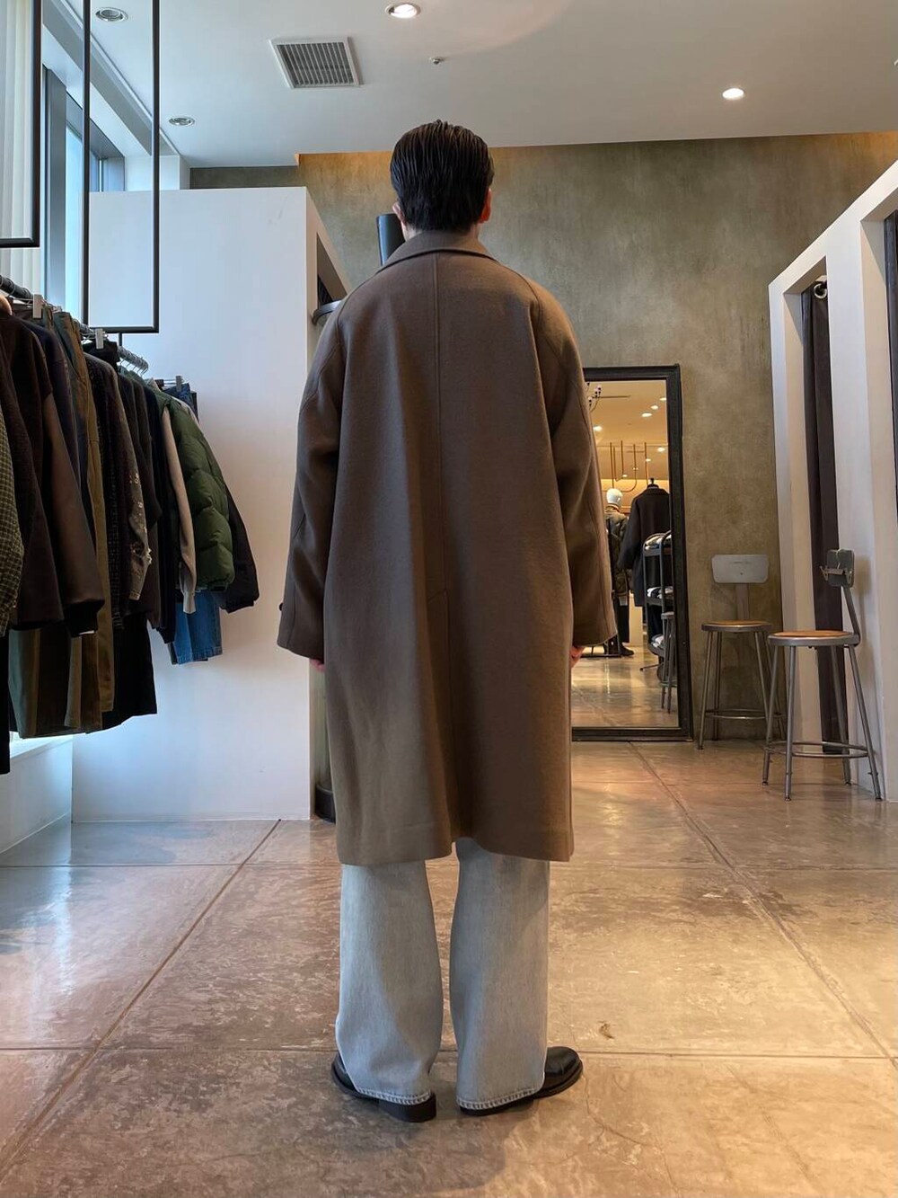 コートを脱いだ際も決まる様に、オーバーサイズのチェックシャツにデニムはストレートデニムでスッキリとまとめております。