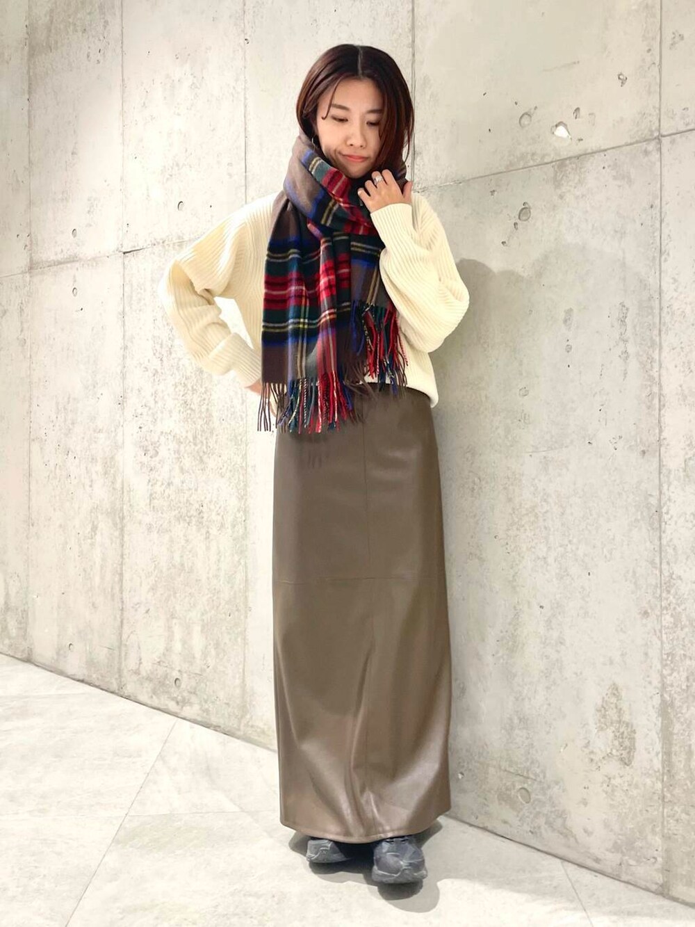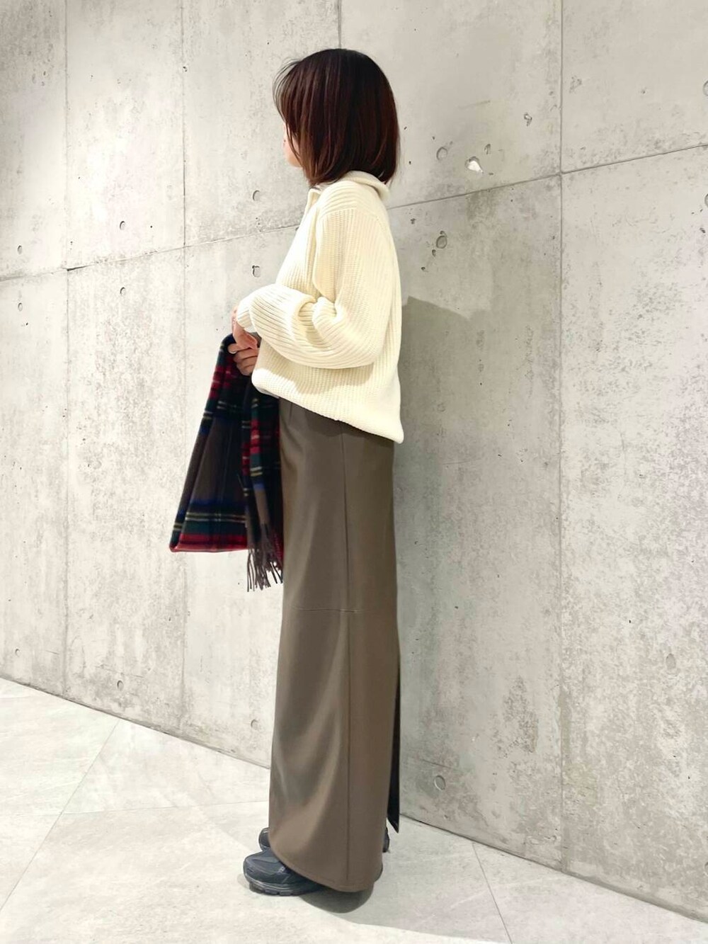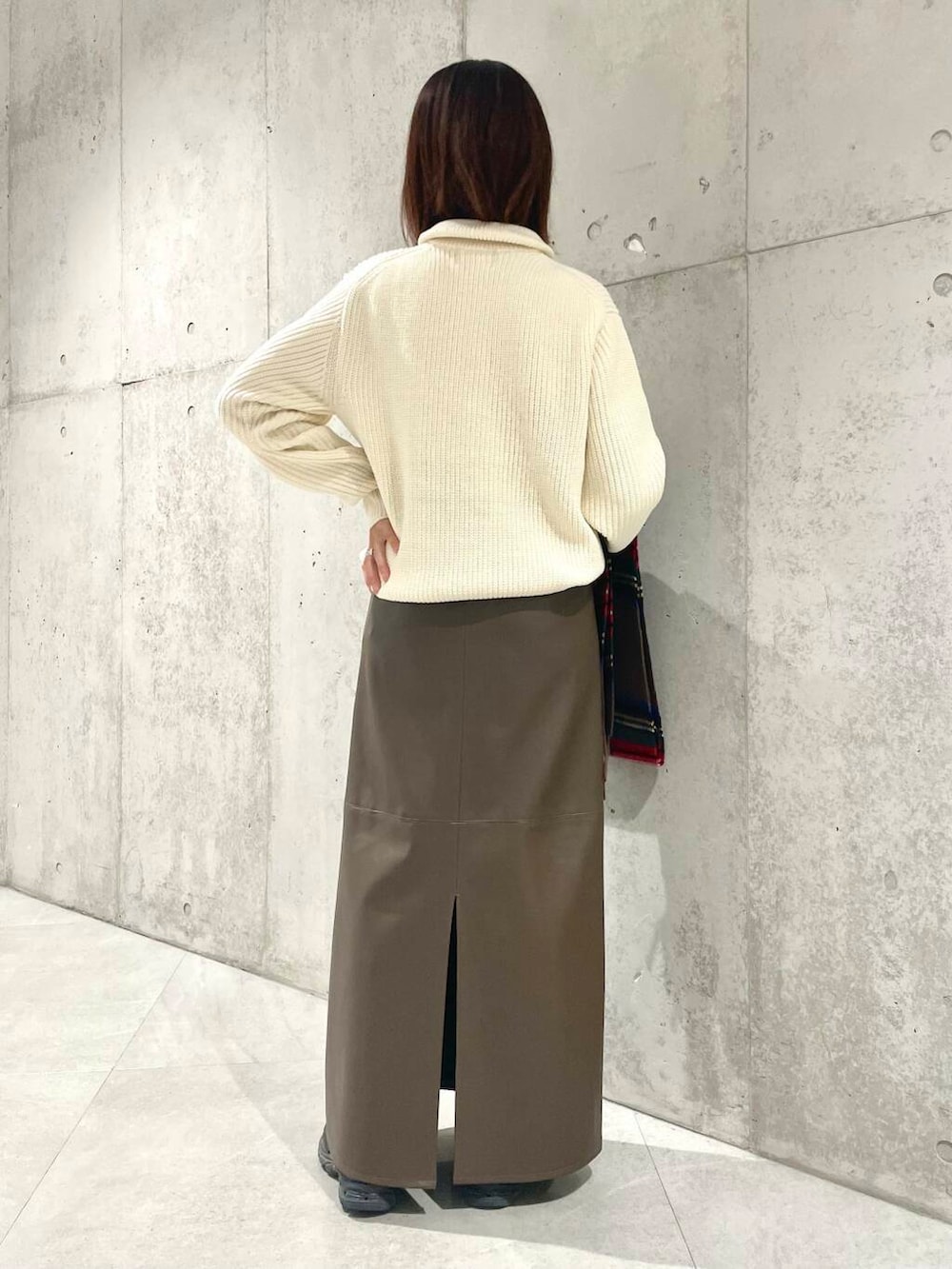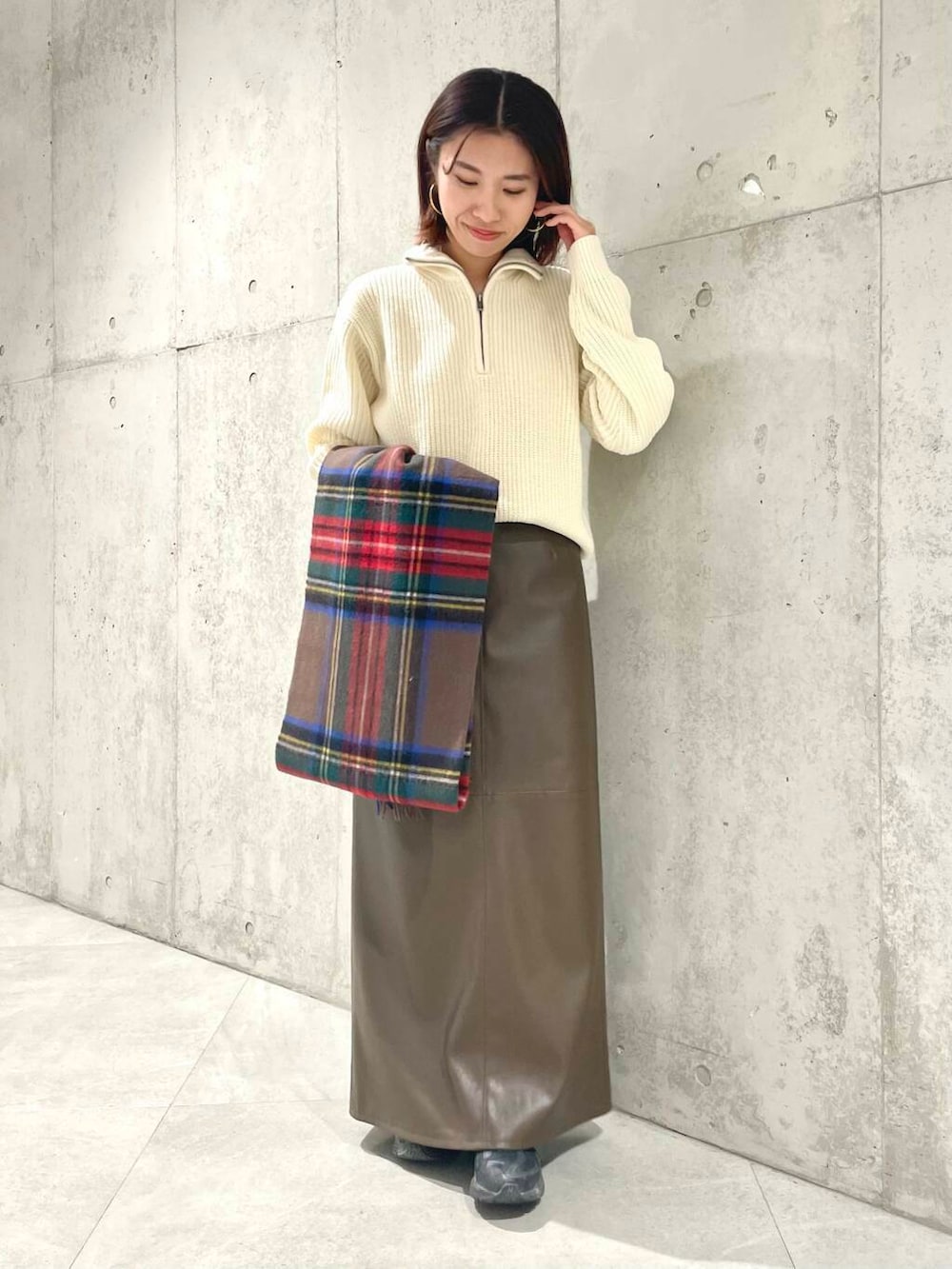 着用コーデは、マルチサイズハーフジップニットプルオーバーに、URのフェイクレザーのスカートを合わせた大人かわいいスタイルです。