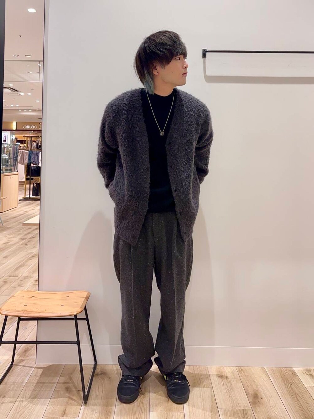 ヘアリーニットカーディガンにウールブレンドのワンタックパンツを使ってモノトーンコーデ🐼
