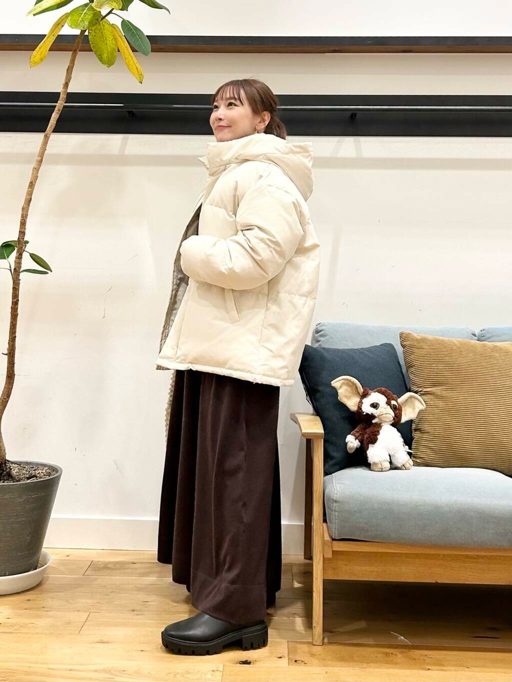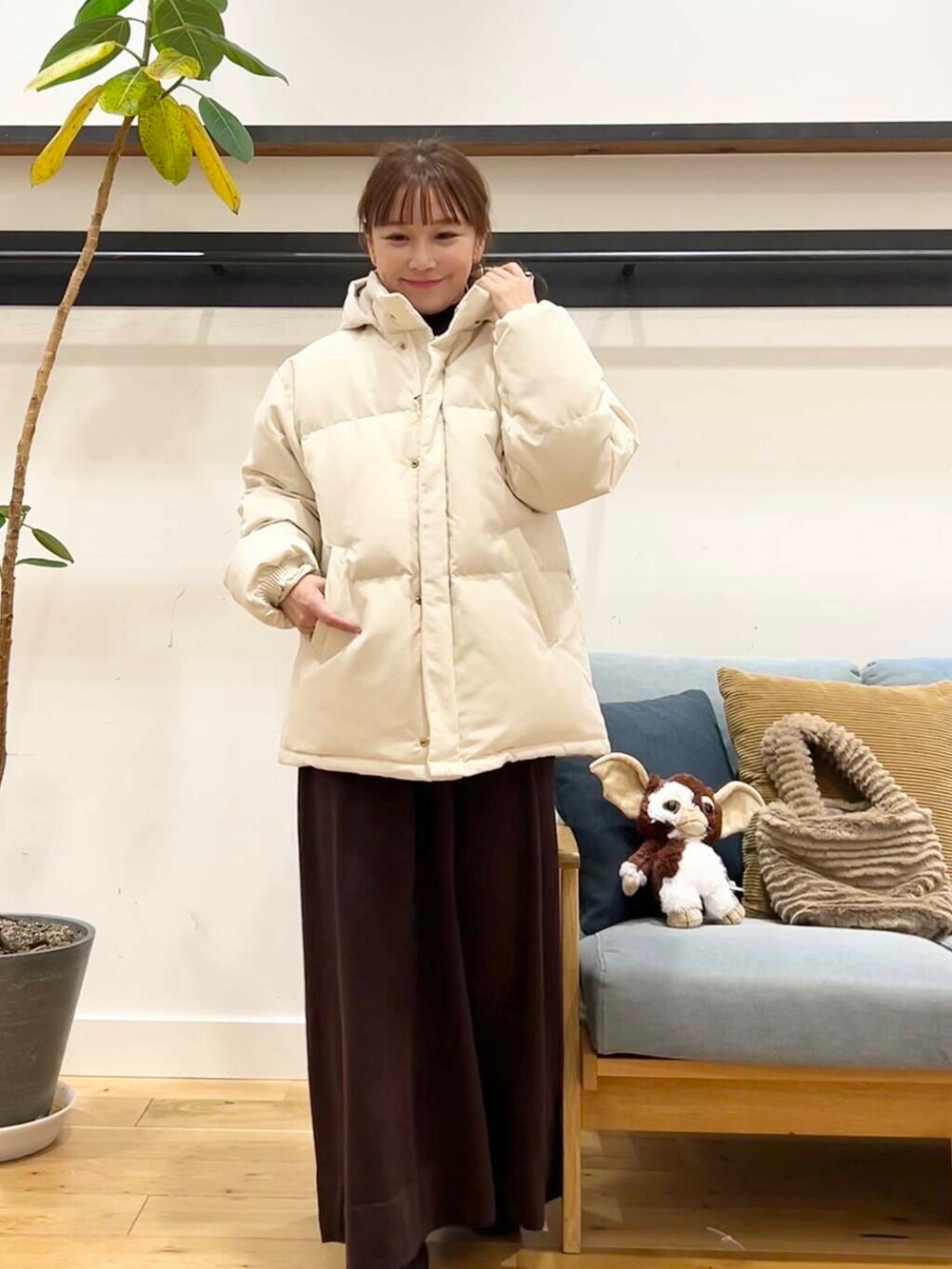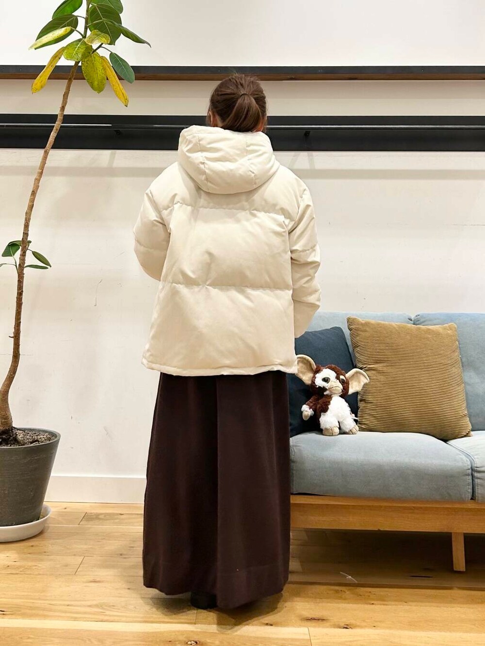 アウターにはグリーンダウンミドルジャケットを着てます。
