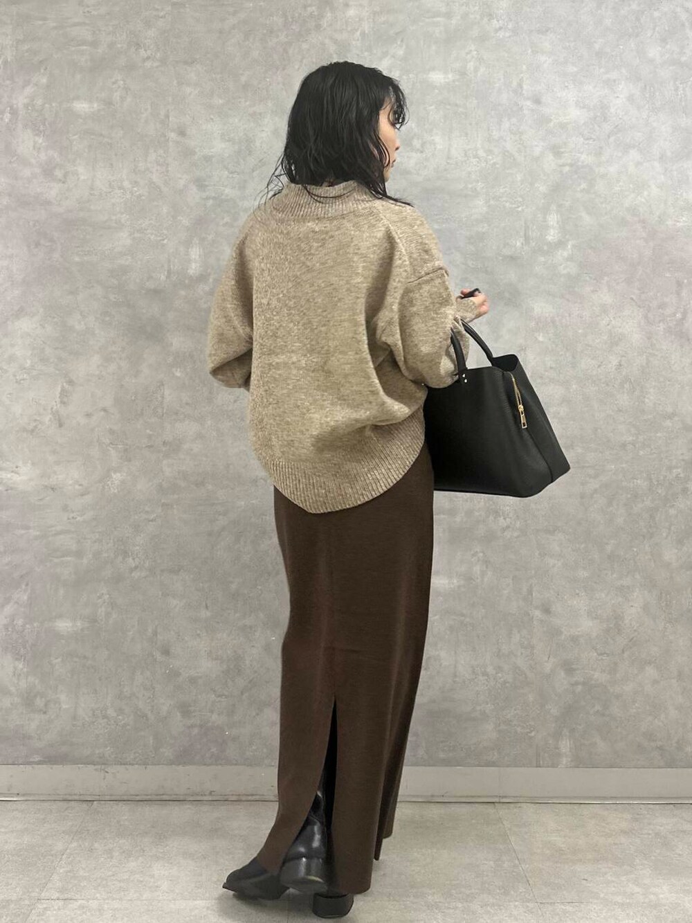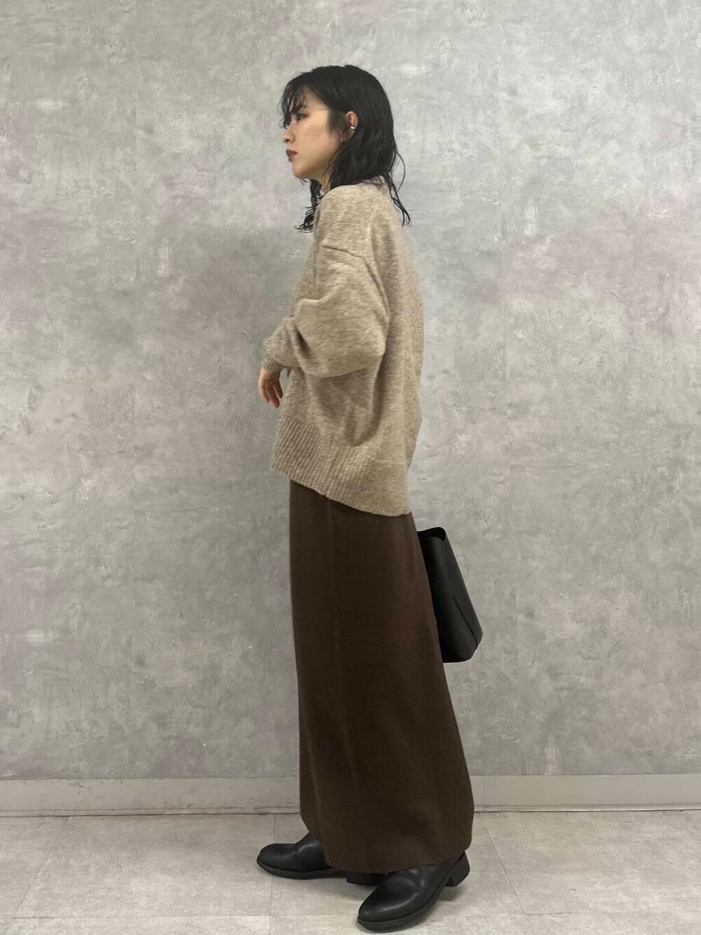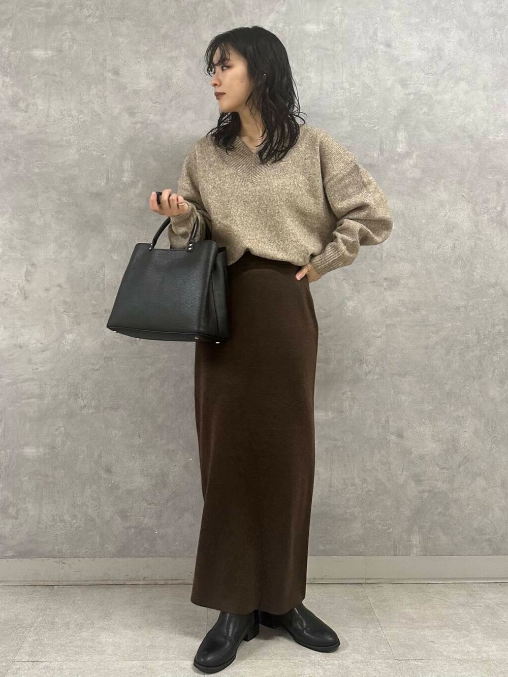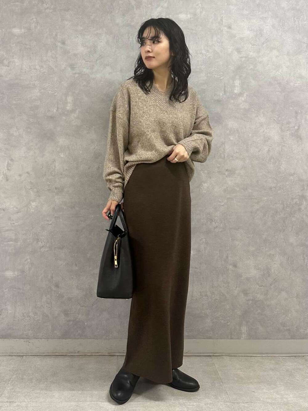 今回はベージュ×ブラウンのヌーディなカラーコーデに。ほっこりしたカラーバランスもVネックデザインのおかげですっきりとした着こなしに仕上がります。