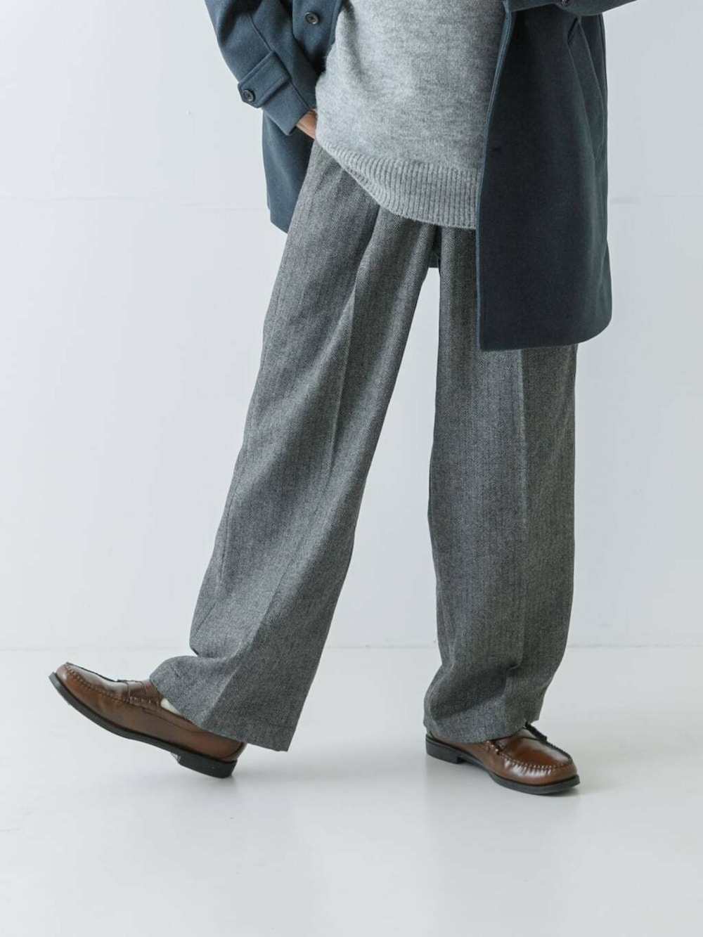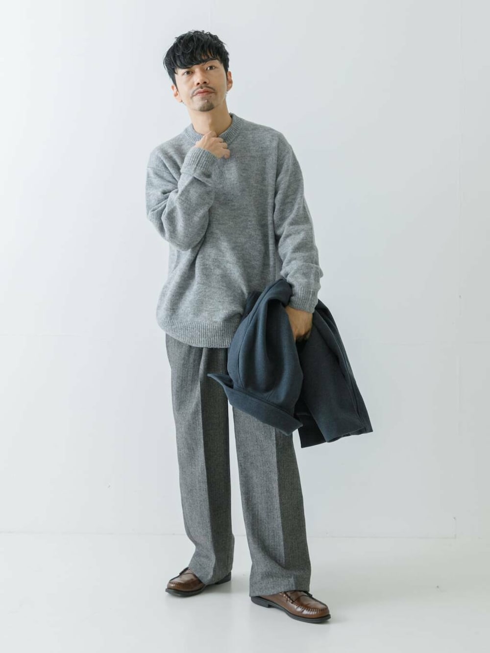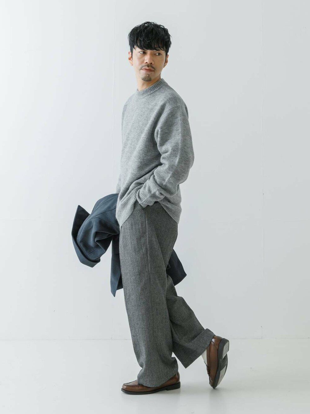 ニットとパンツはワイドなシルエットしましたが革靴できれいめな印象に。