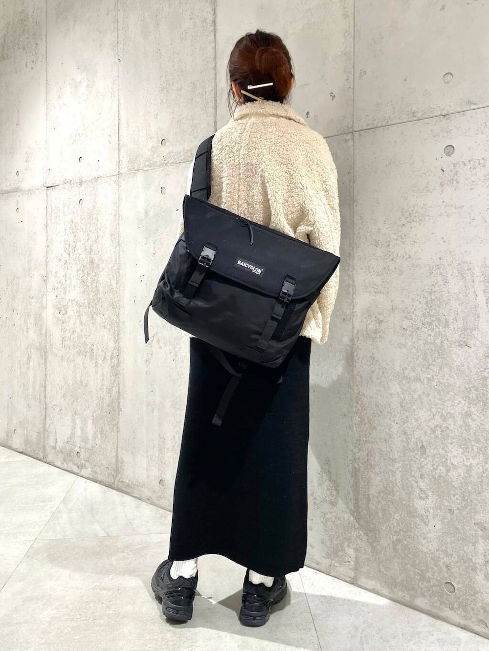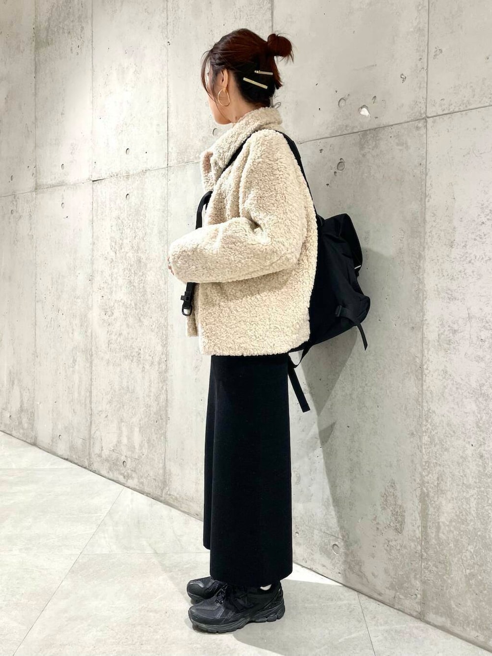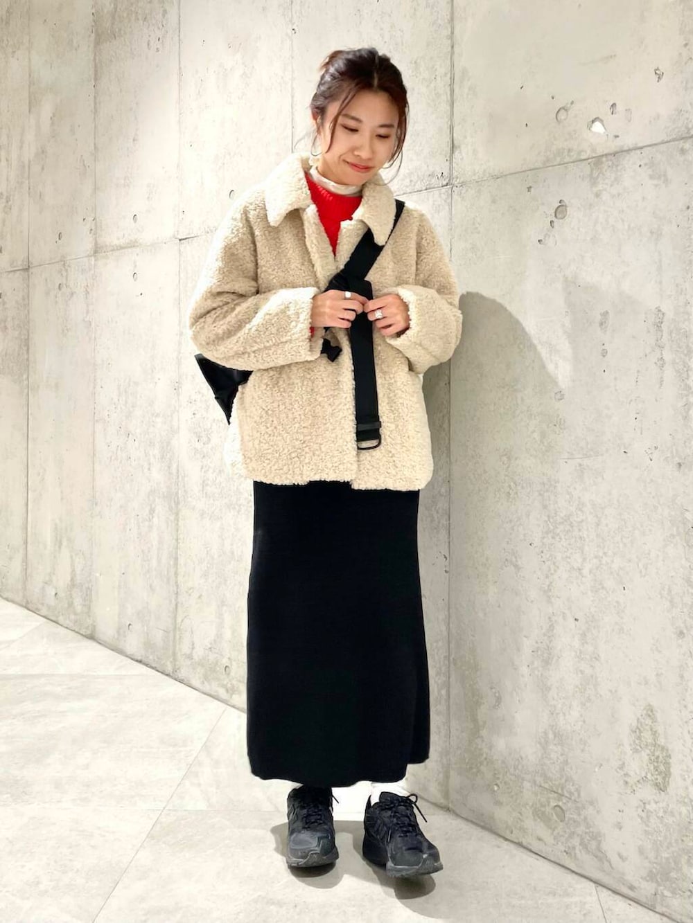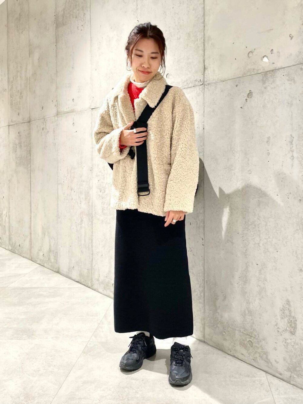 スカートは短めなので、ごつめなハイテクスニーカーや、ショートブーツ合わせもおすすめですよ。