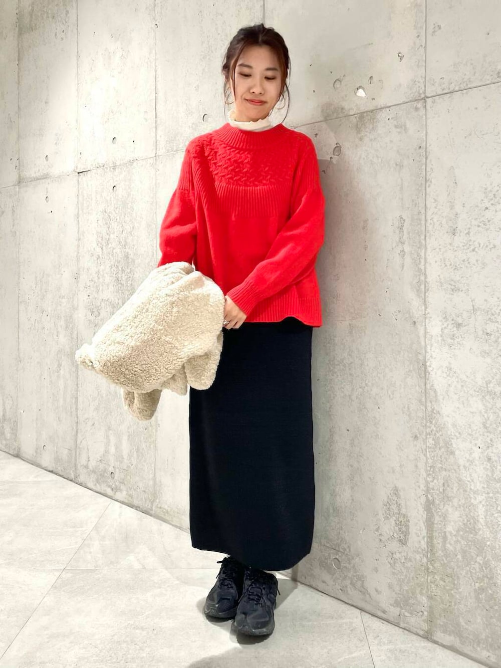着用コーデは、パキッと赤の求心ニットに、上品なラメのスカートを合わせてボアジャケットをON。