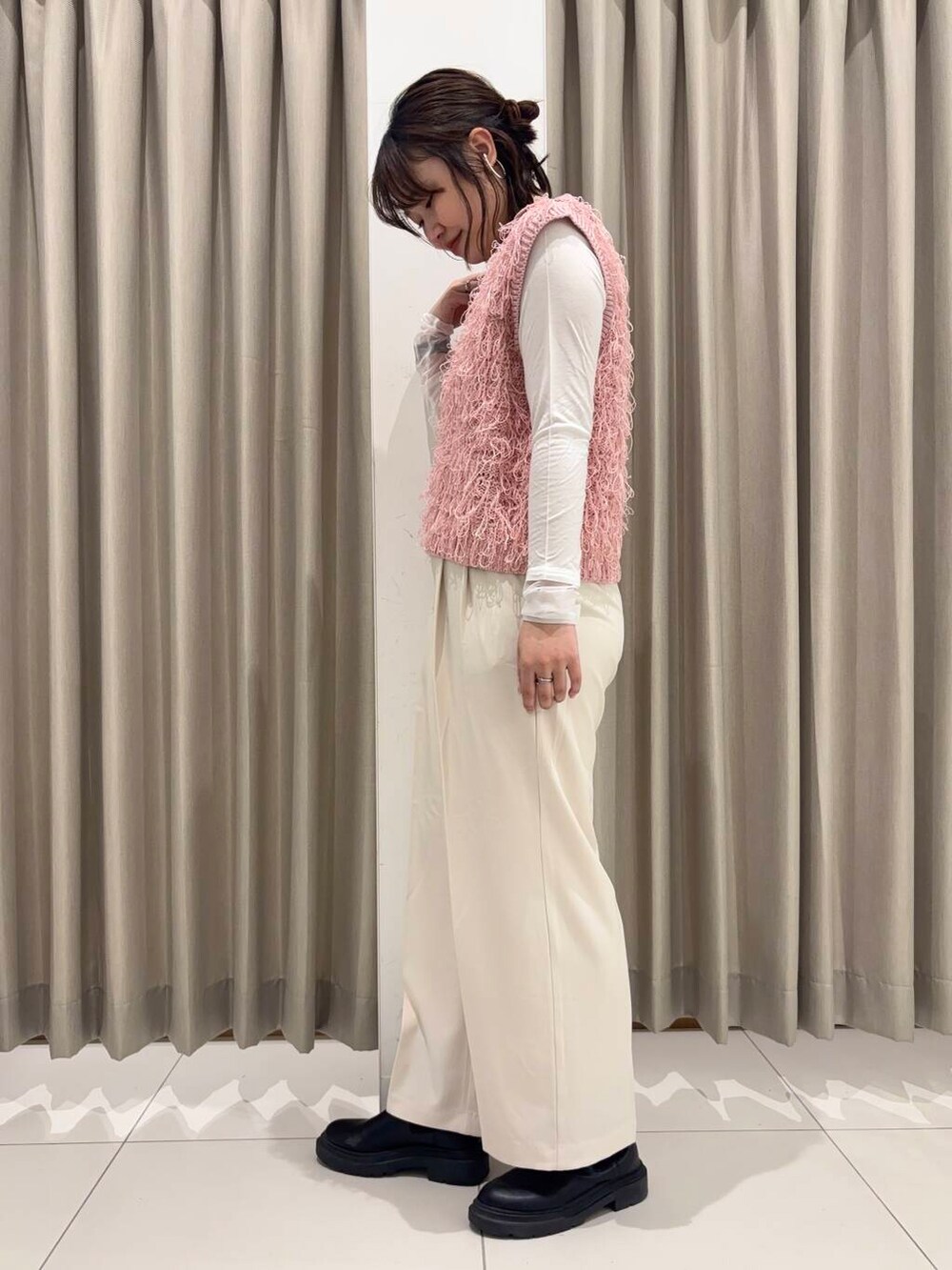 ピンクのニットベストをメインにキレイめコーデを組みました!