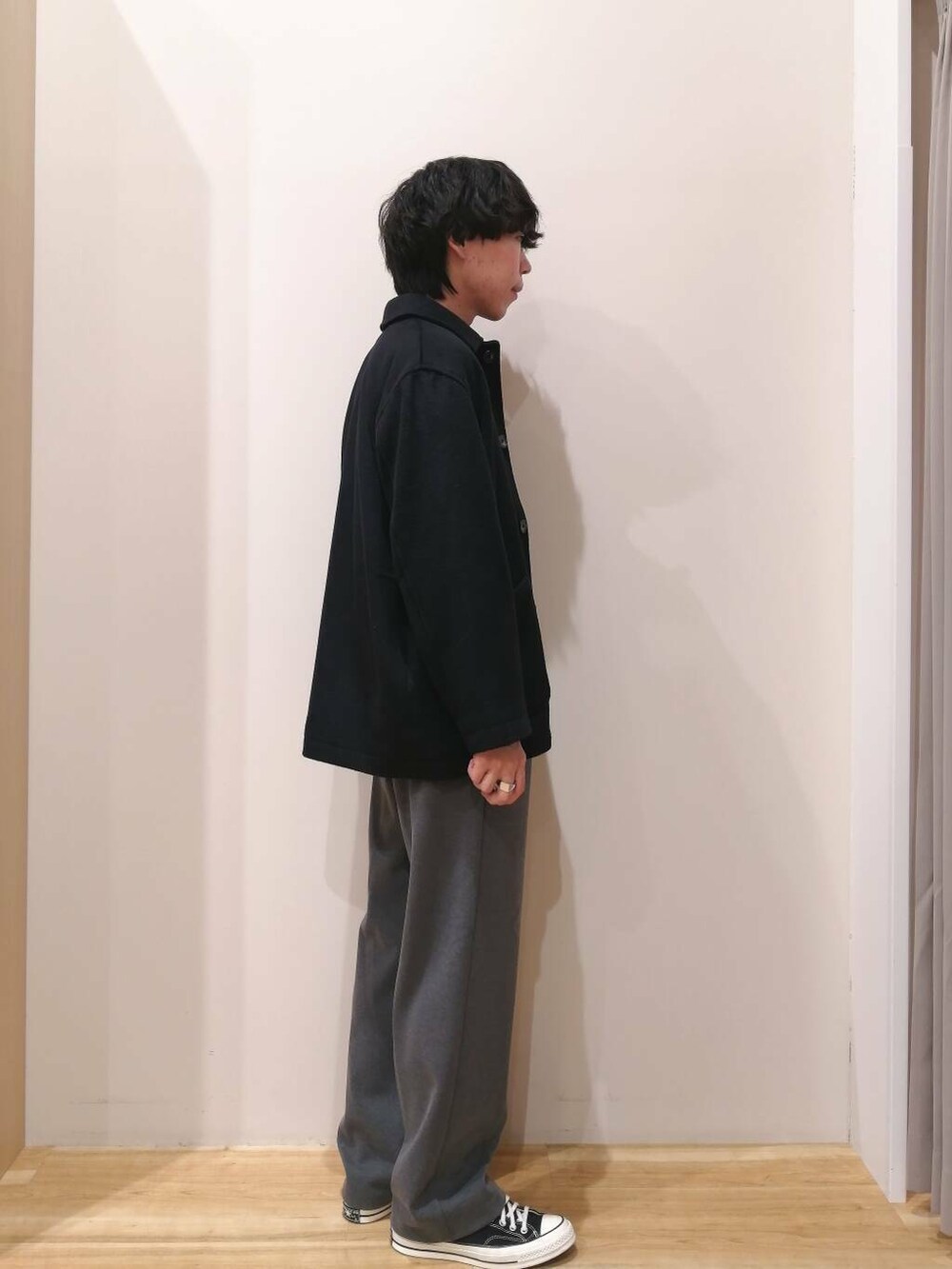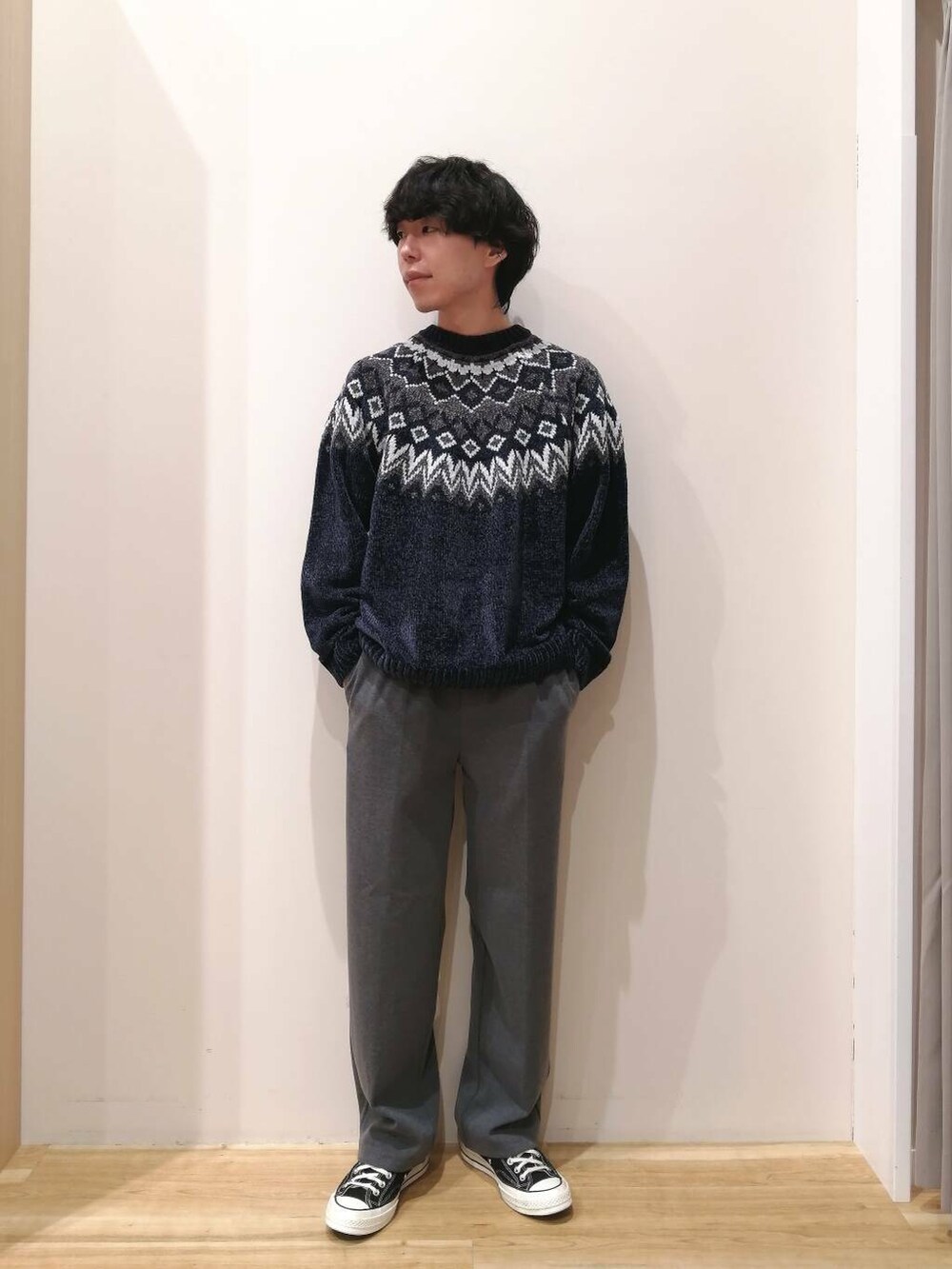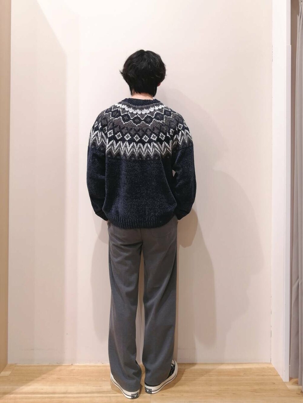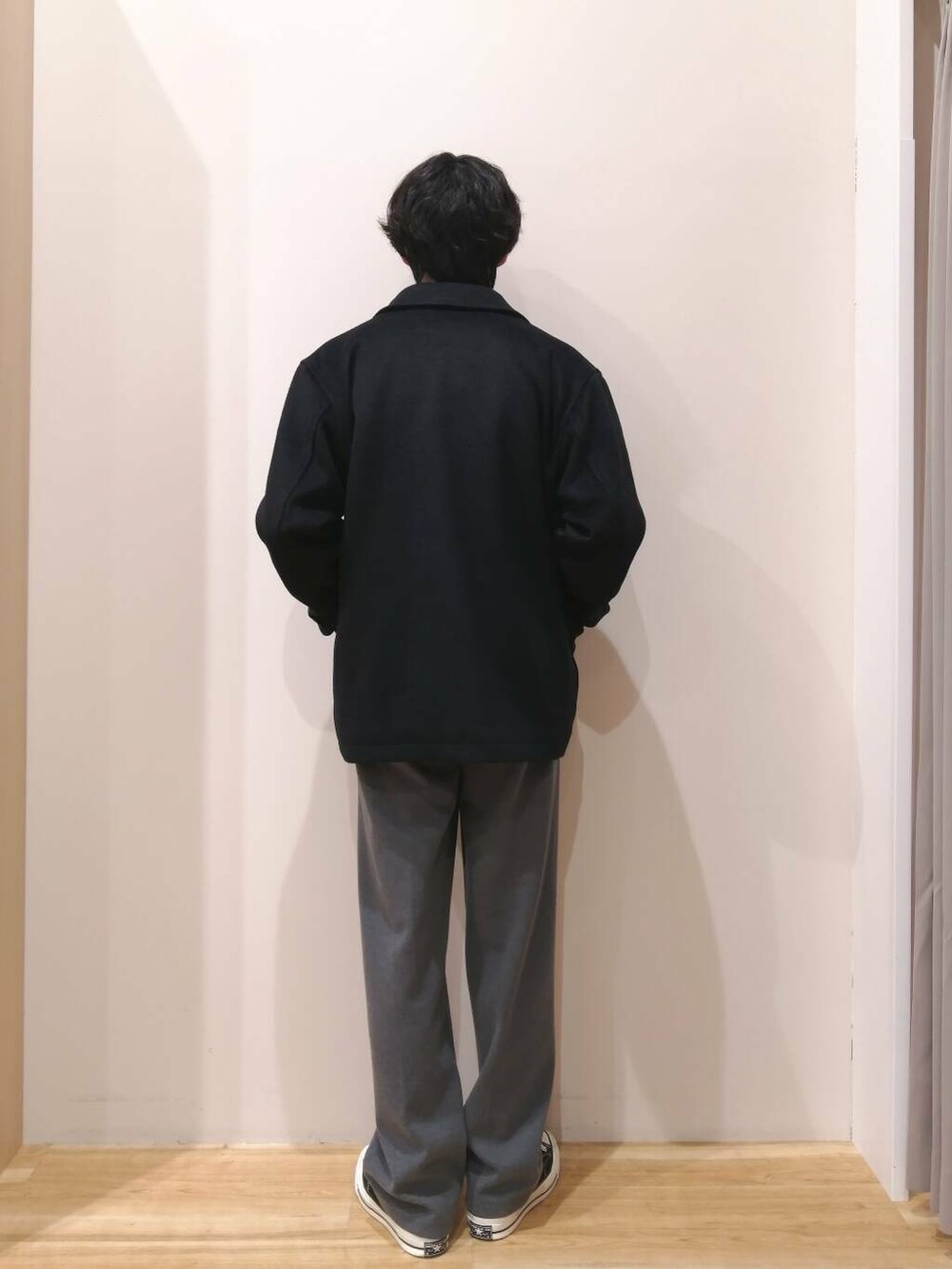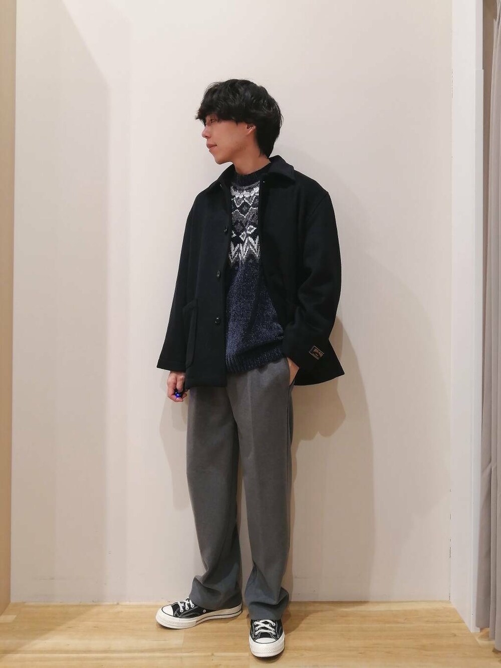 アウター、ニット、パンツすべてMサイズを着用しております。