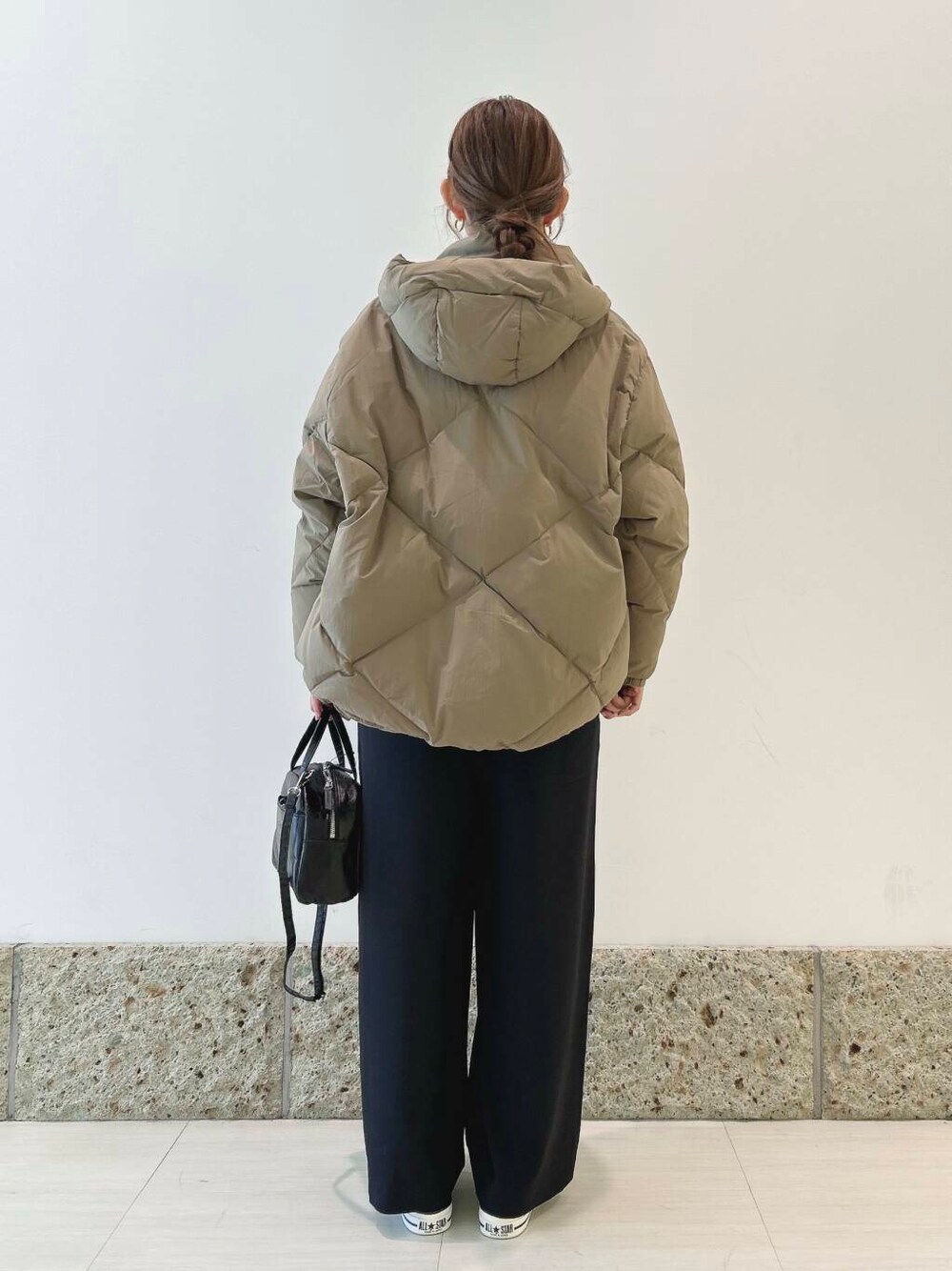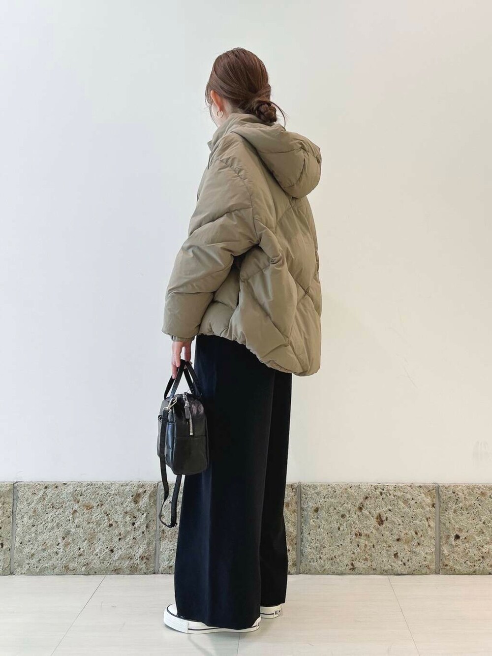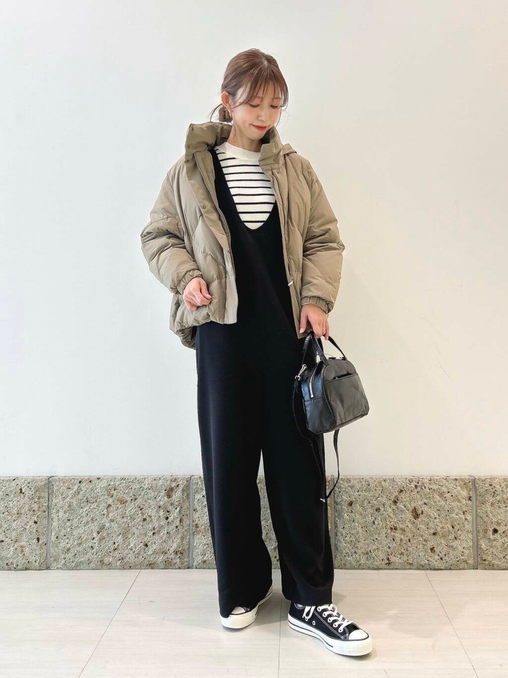 アウターには柔らかなカーキ色が可愛いダウンを。