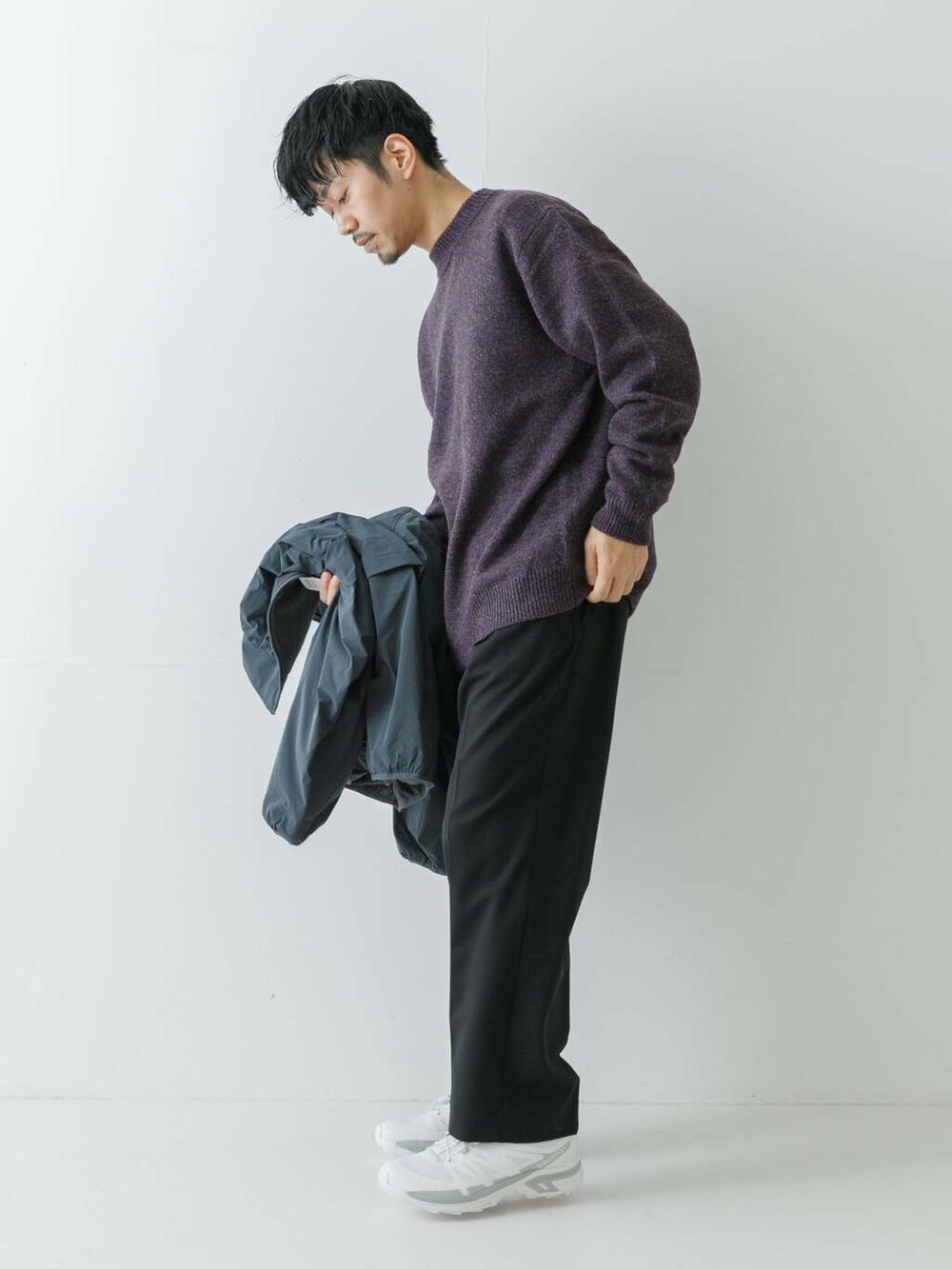 上半身は差し色もパープルで明るい印象にしてシューズもホワイトに。