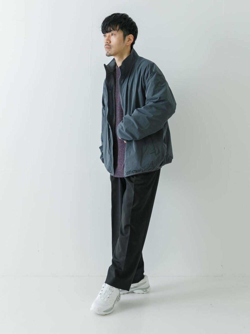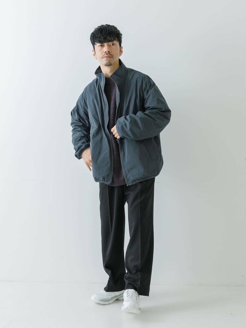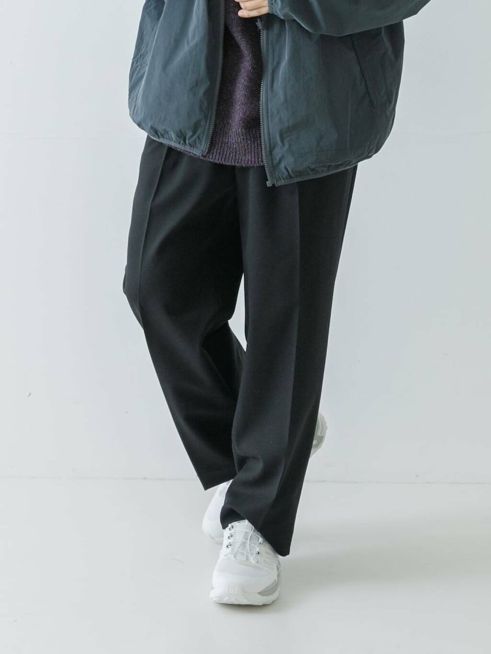 カジュアルコーデにはなかなか難しいスラックスをワイドにすることでコーディネートの幅が広がりますね。