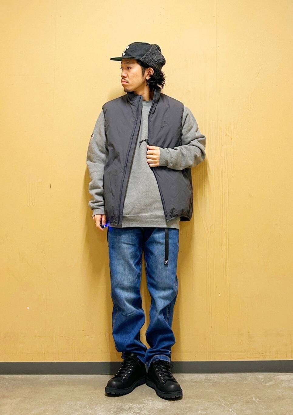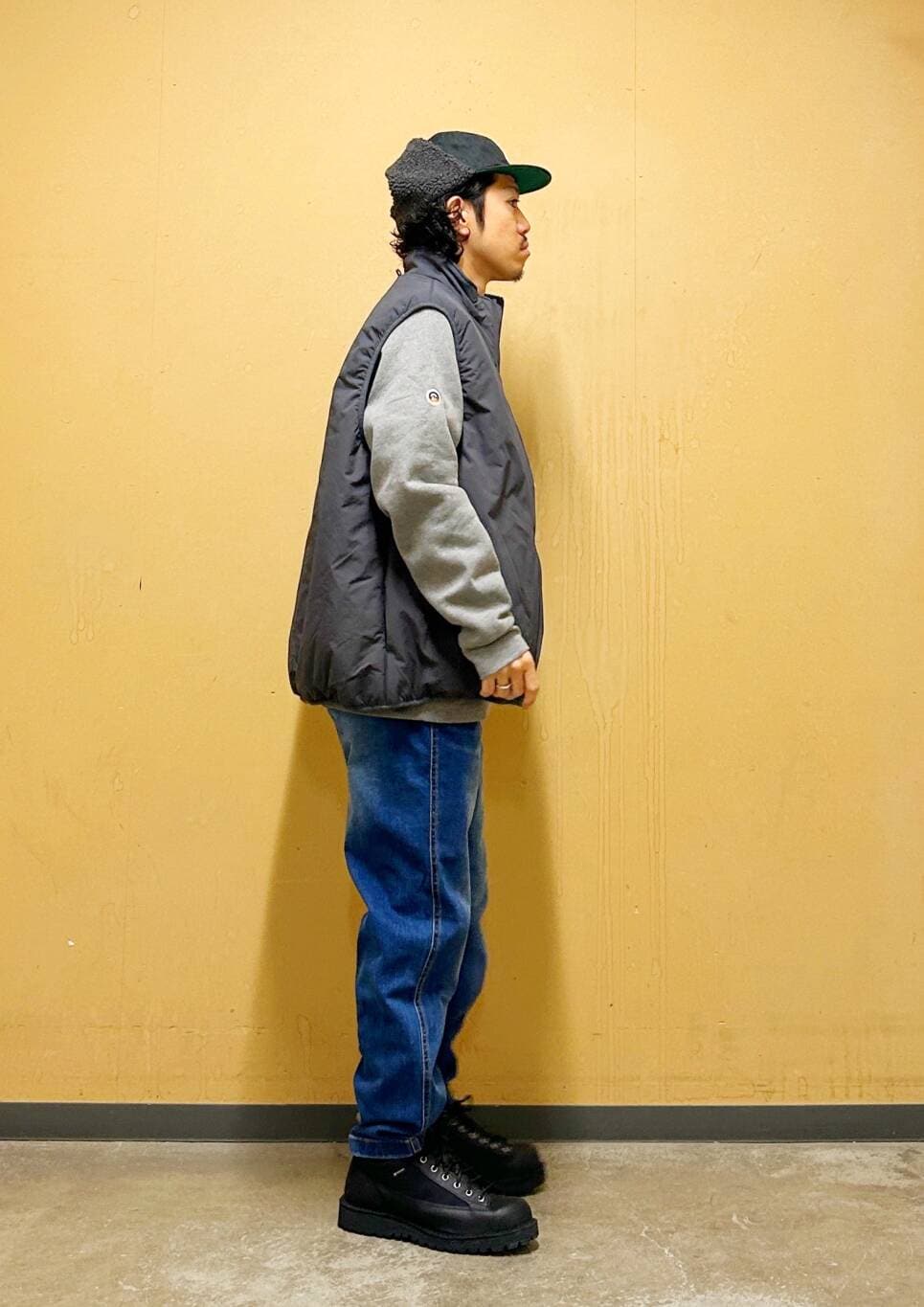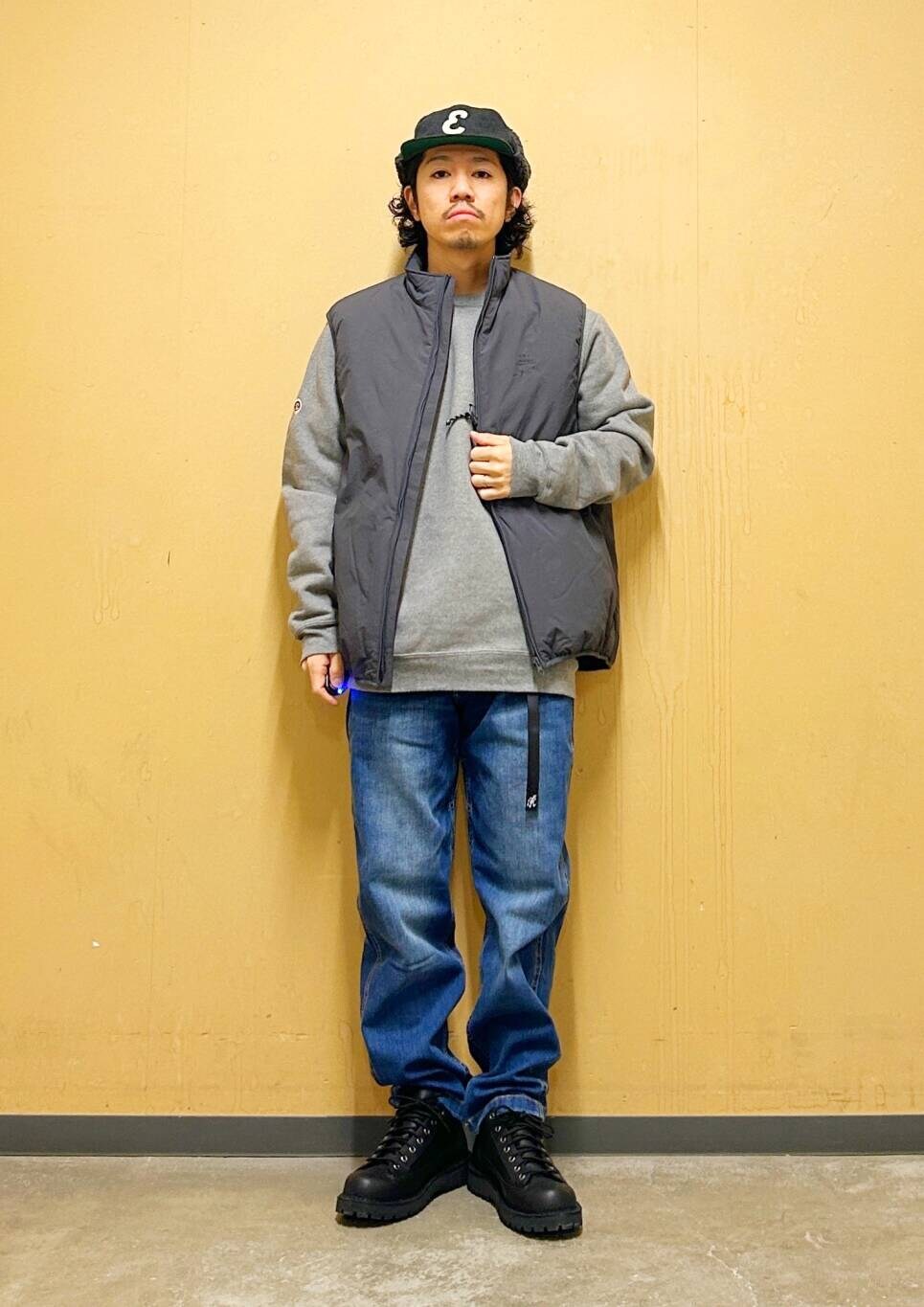 今回はurdベストとグラミチ別注デニムパンツを使用したコーディネート。