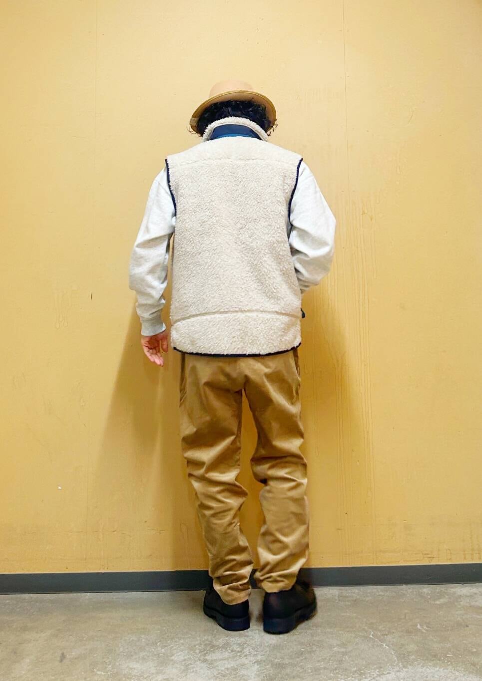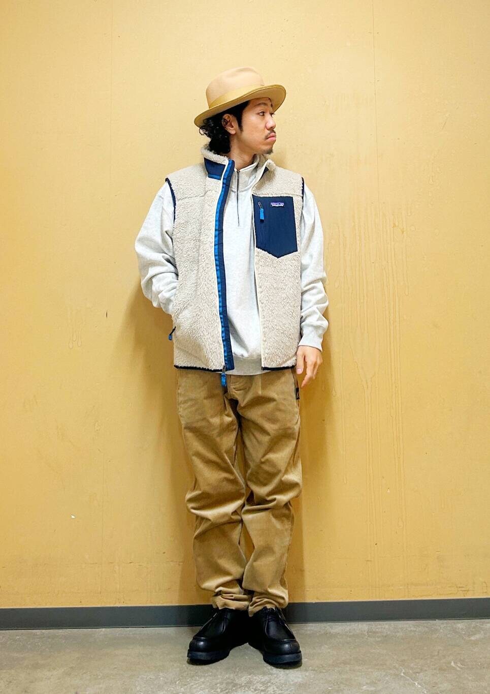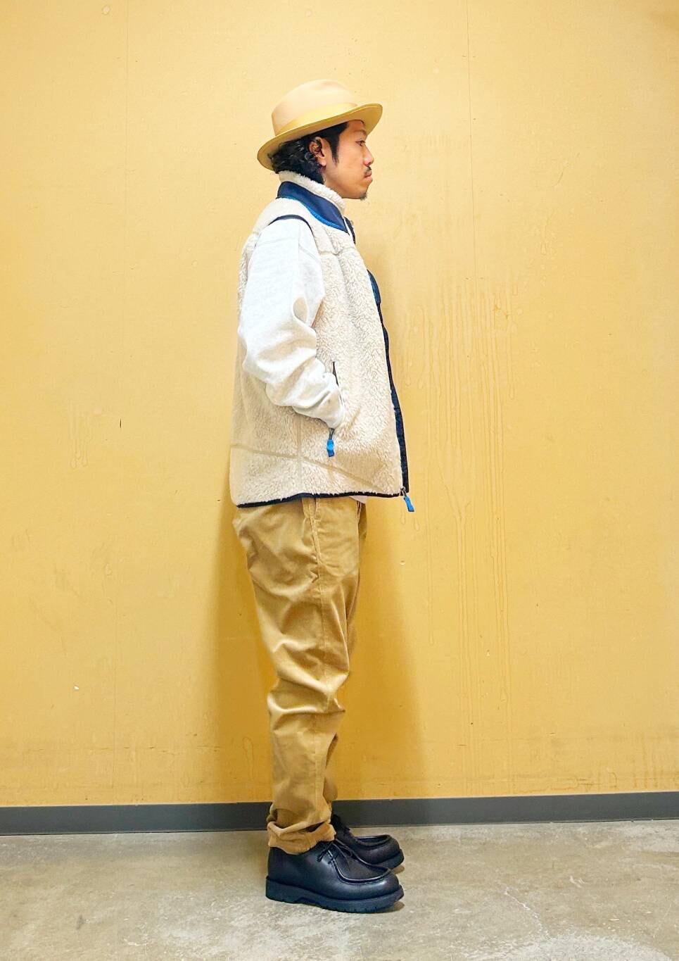 今回はPatagoniaボアベストとコーデュロイトラウザーを使用したコーディネート。