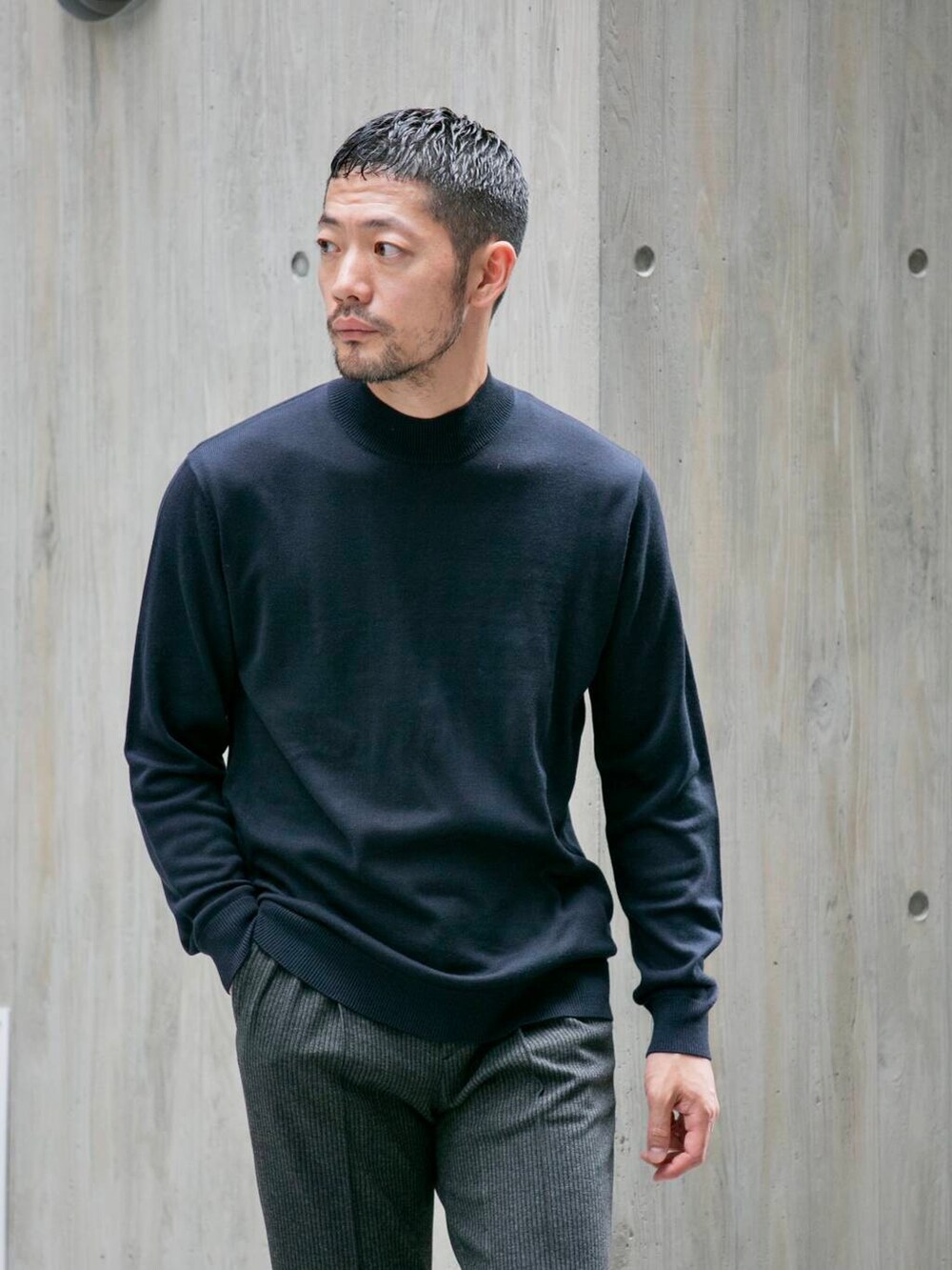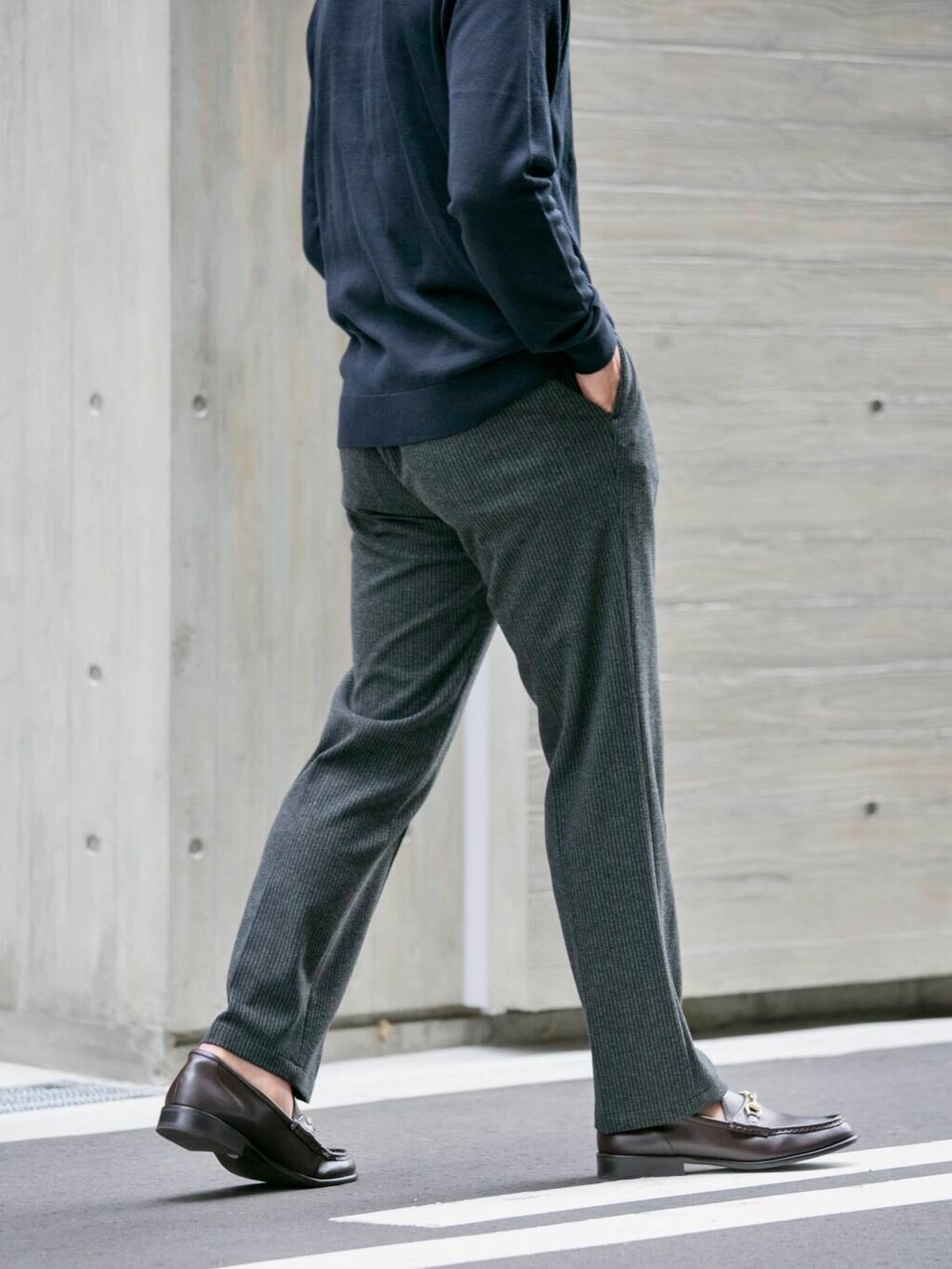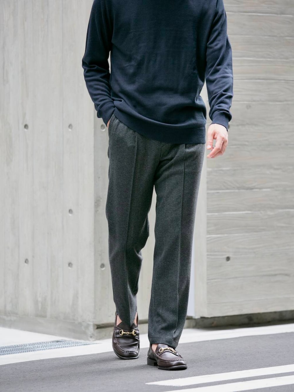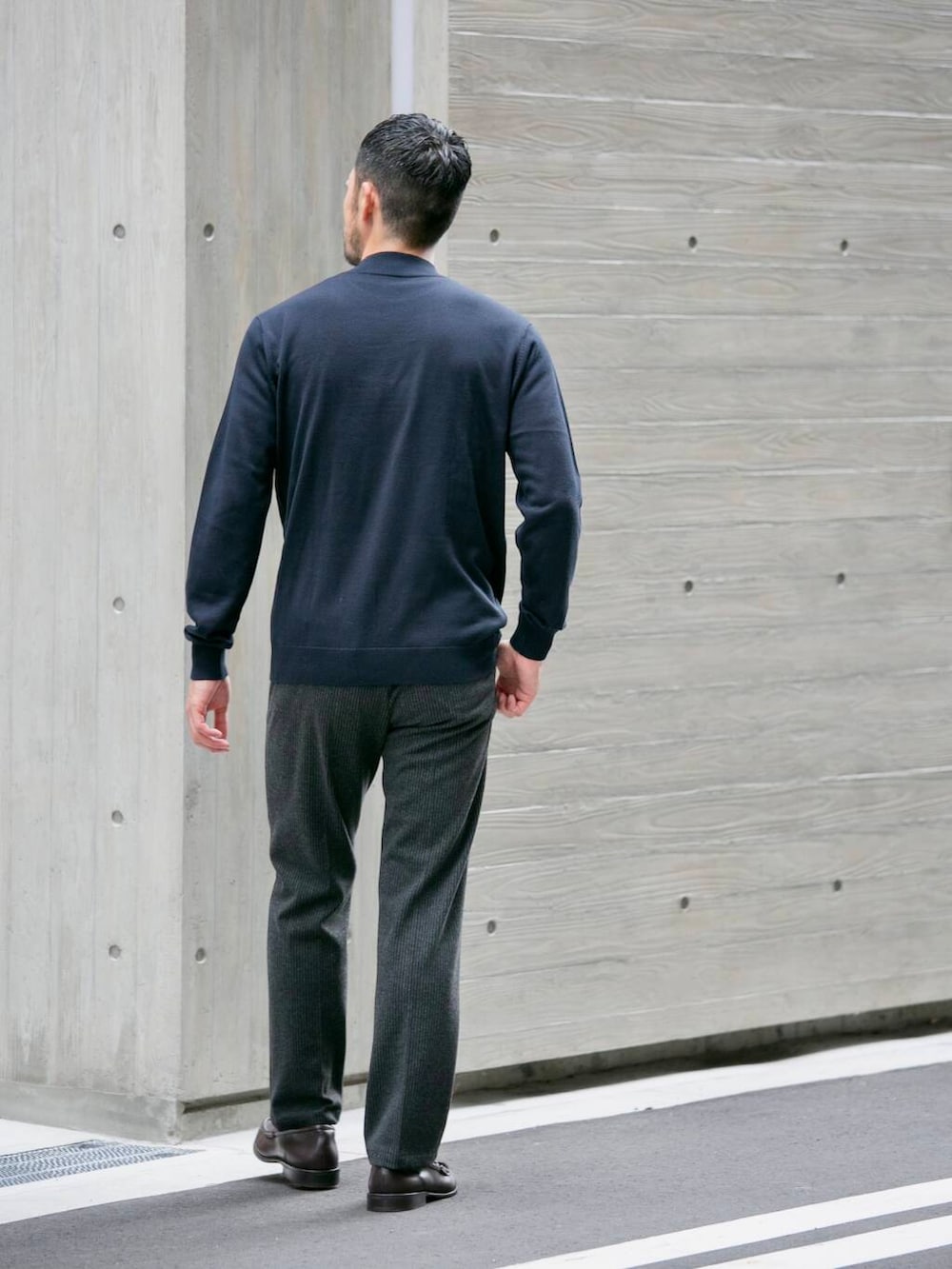 ネイビー×グレー。どの場面でも情緒を崩さない配色。