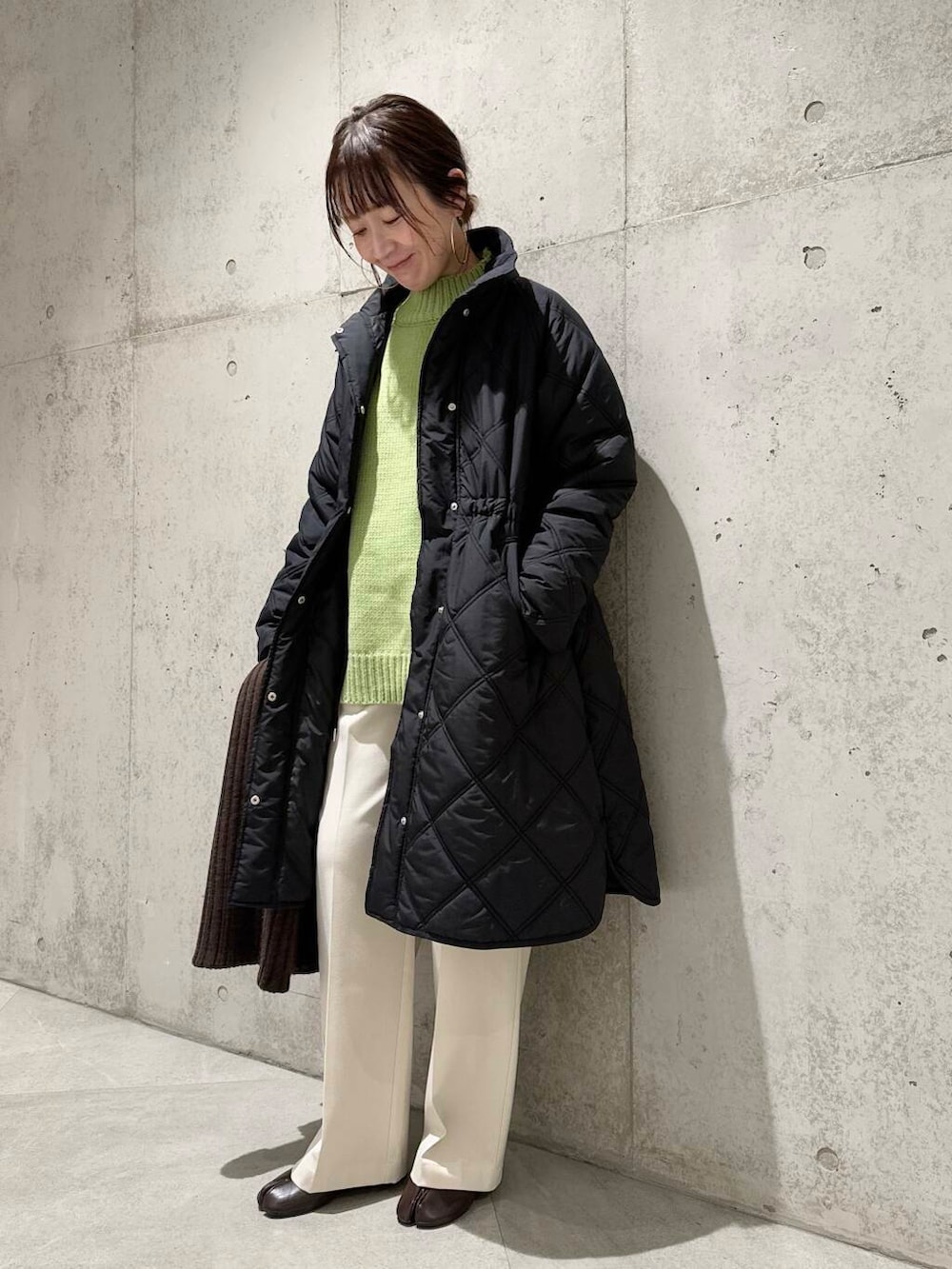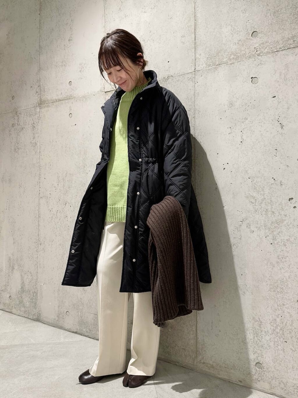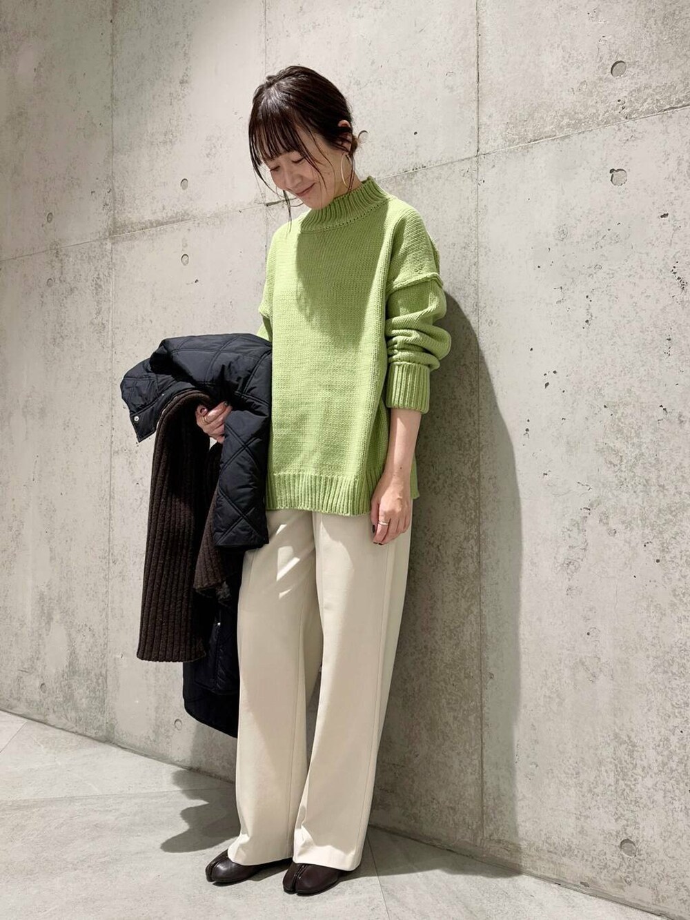 今回は、ホワイトのパンツに、グリーンのニットを差し色にしてみました。