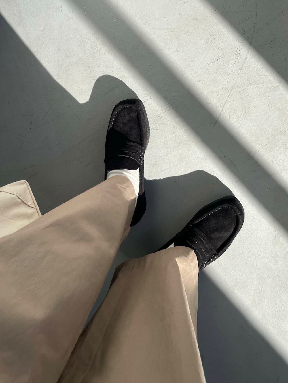 着崩れないよう、ボトムにはシルエットがきれいなコクーンパンツをON。