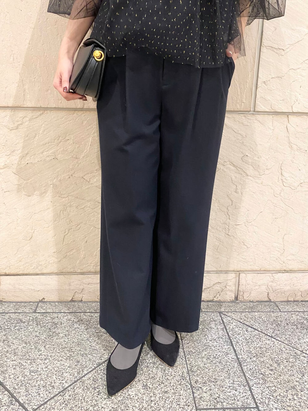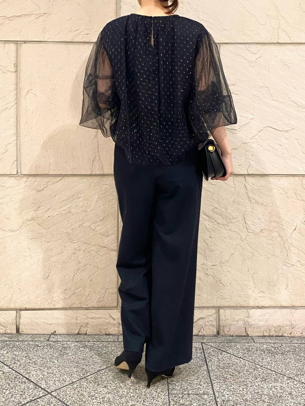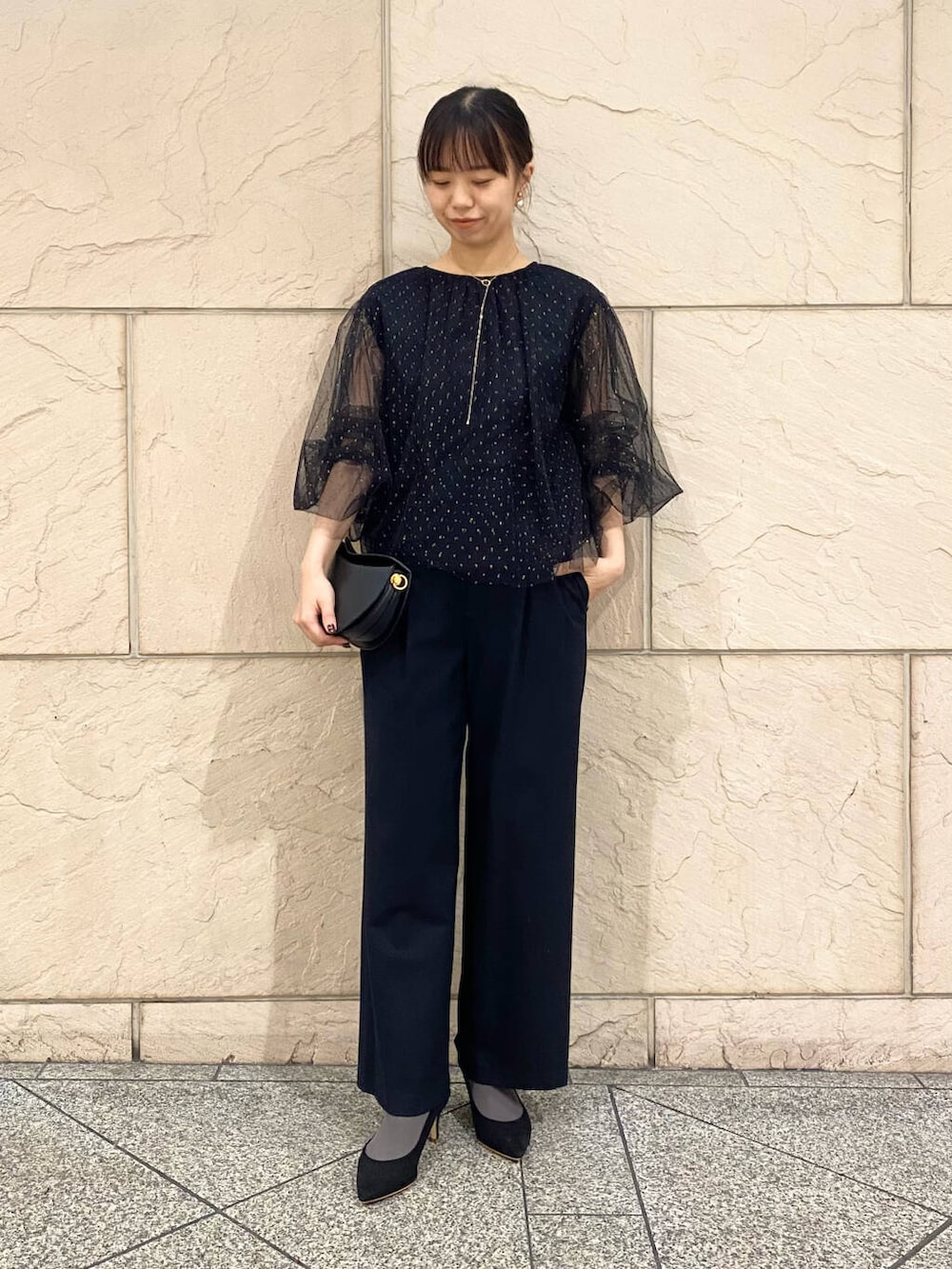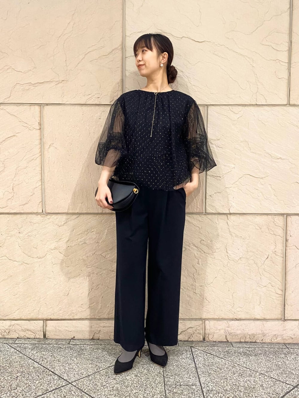 ブラックコーデでもとても華やかに見えるお洋服です。