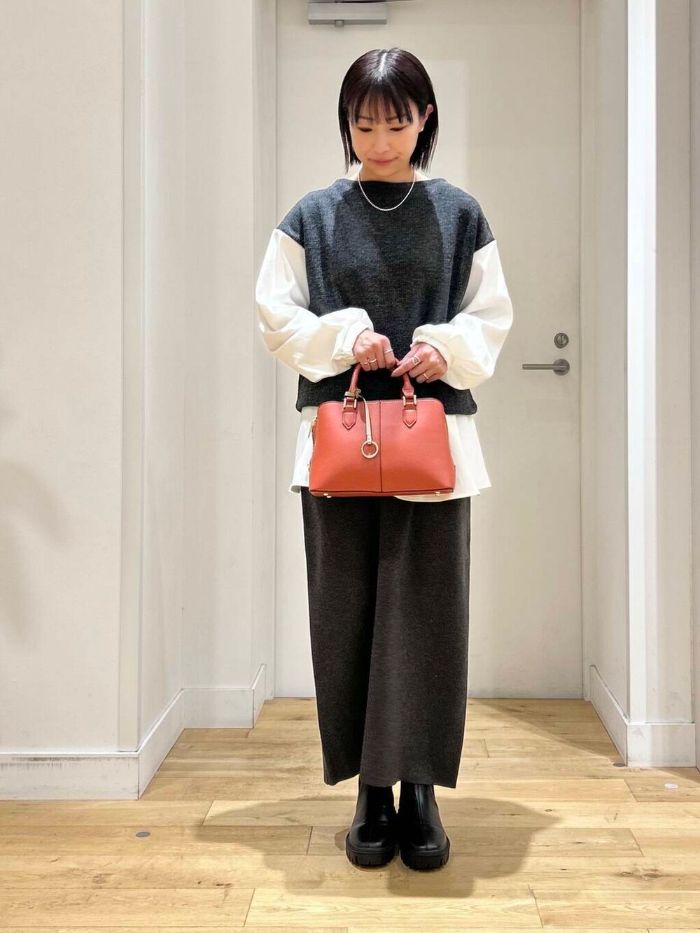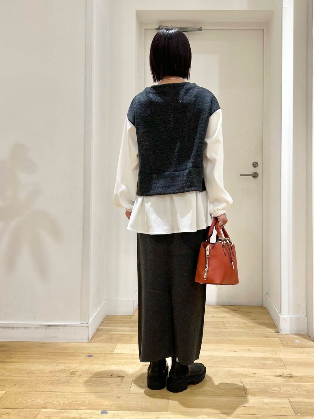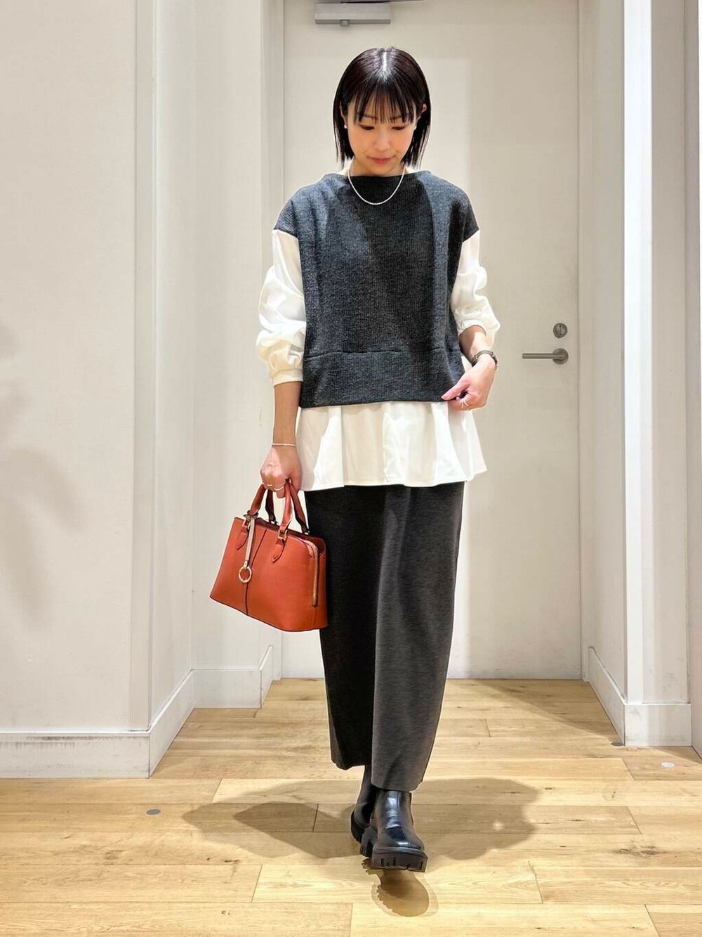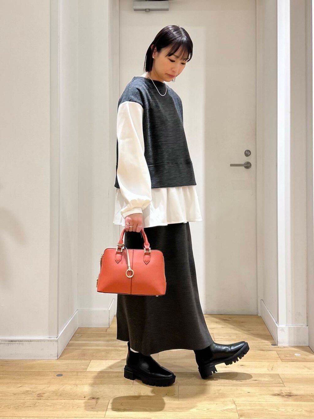 今回は、ボトムスにも同色のニットのスカートを合わせてセットアップ風に合わせました。