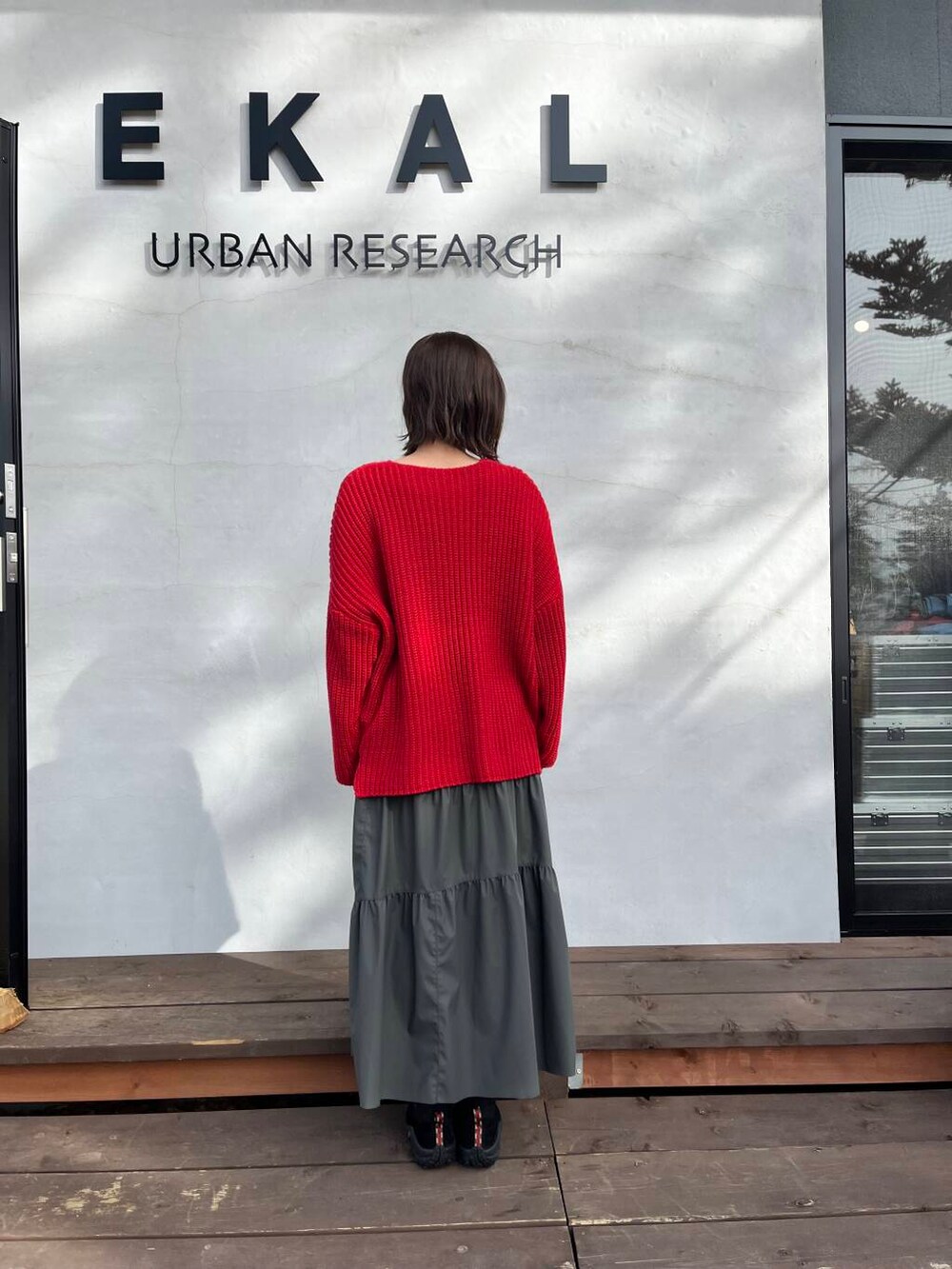 赤のボードネックニットは冬に最適な素材ながらも、パンツスやスカートどちらでも着回しが効きそうです!