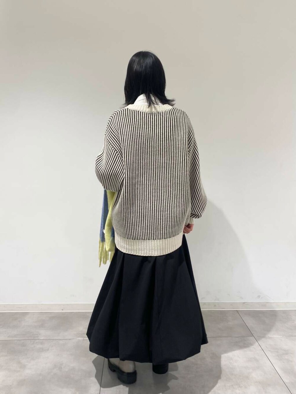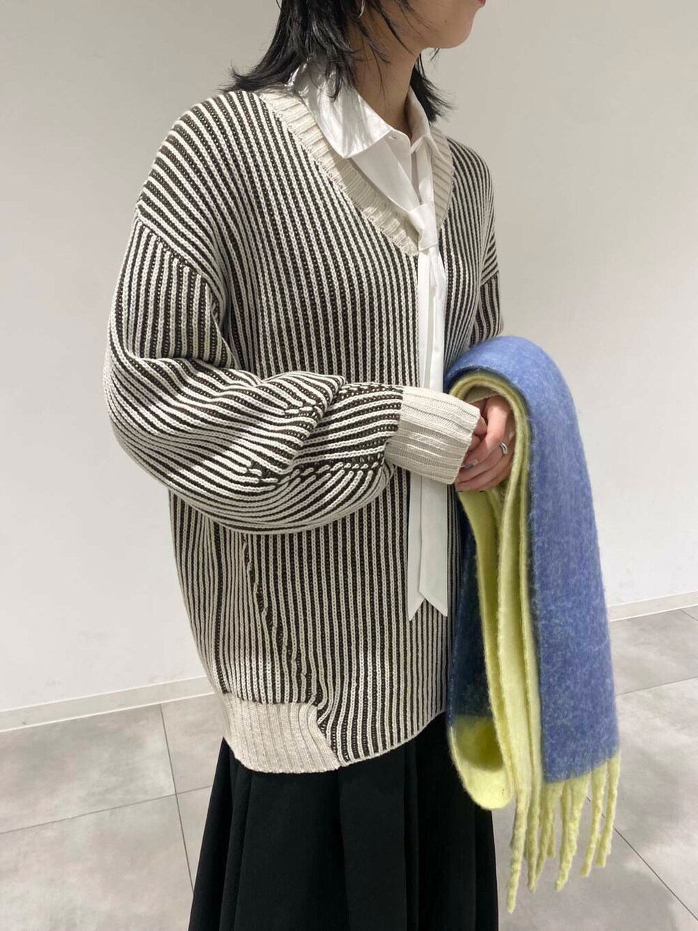 KBFのニットは、深めVネックになっているのでシャツをレイヤードする着方もおすすめですよ◎