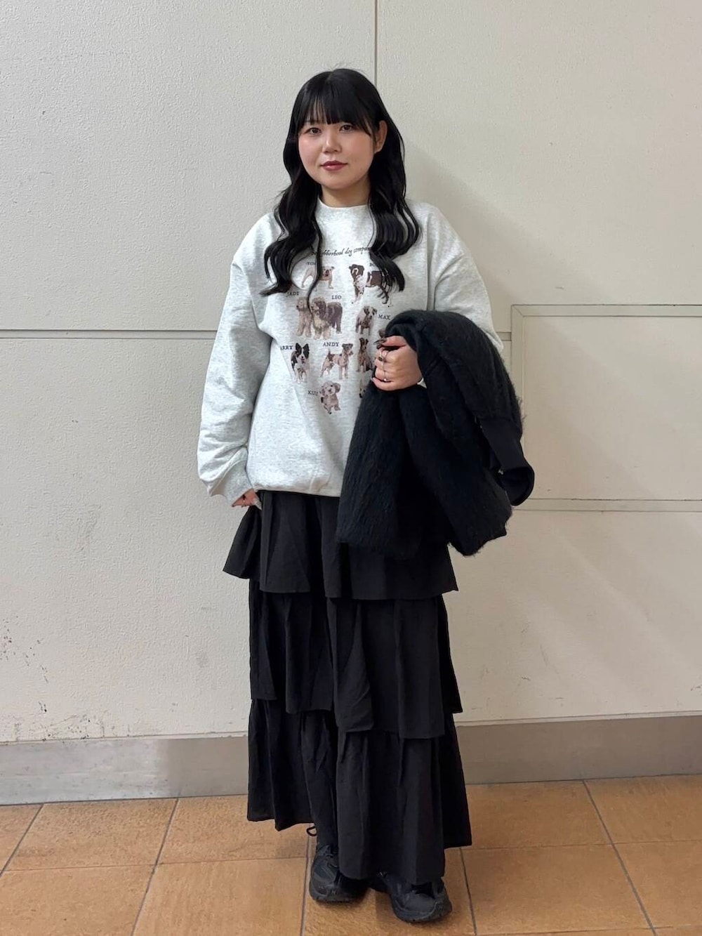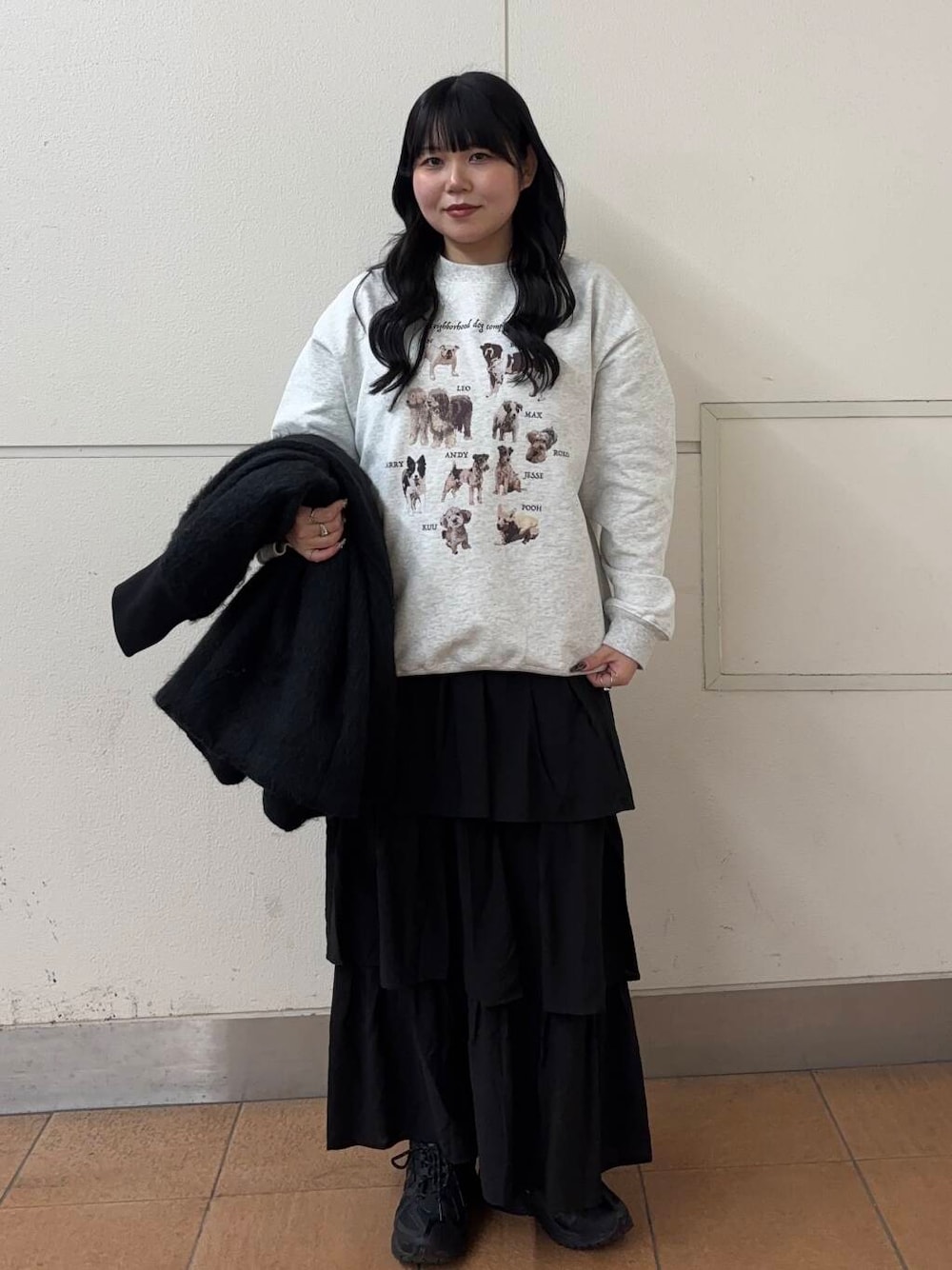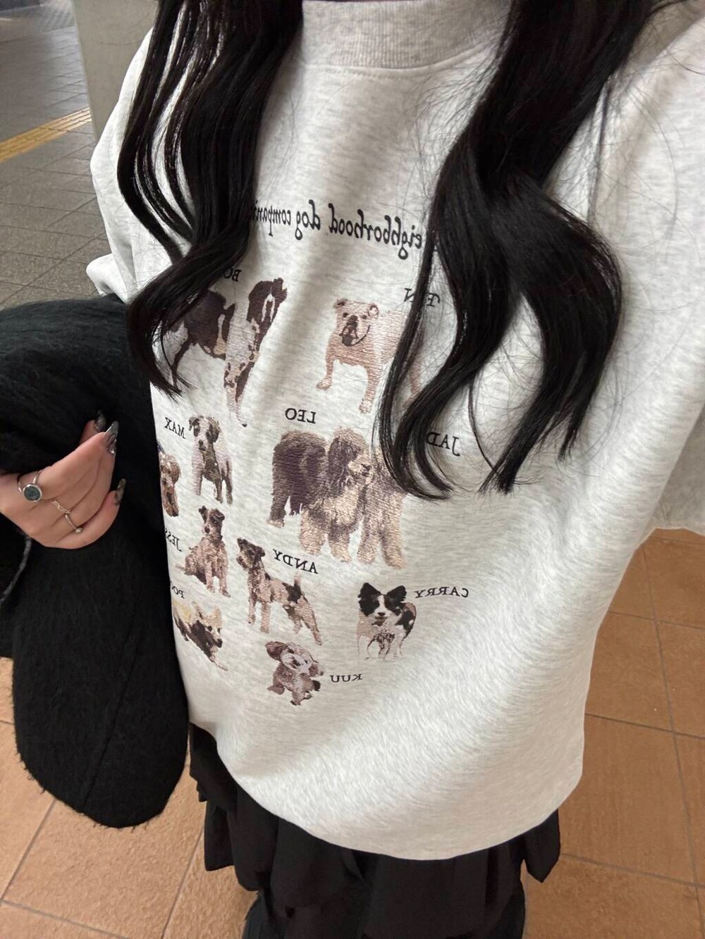 わんちゃんがたくさんプリントされた個人的イチオシアイテムです🫶🏻しっかりとした裏起毛を使用しているので冬の寒さにも耐えれますし、オーバーサイズなシルエットが今っぽくて可愛いです!