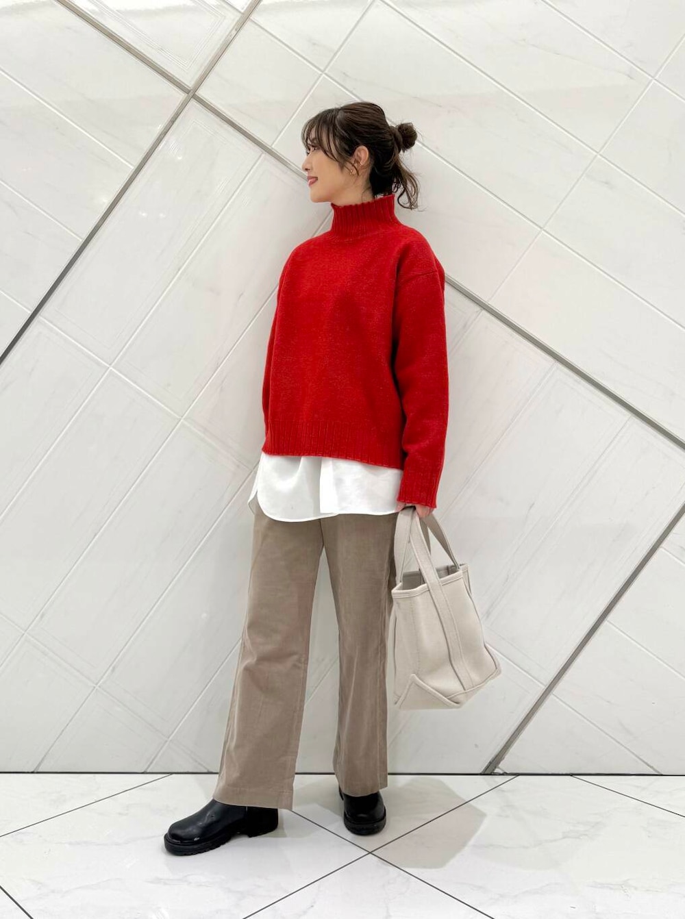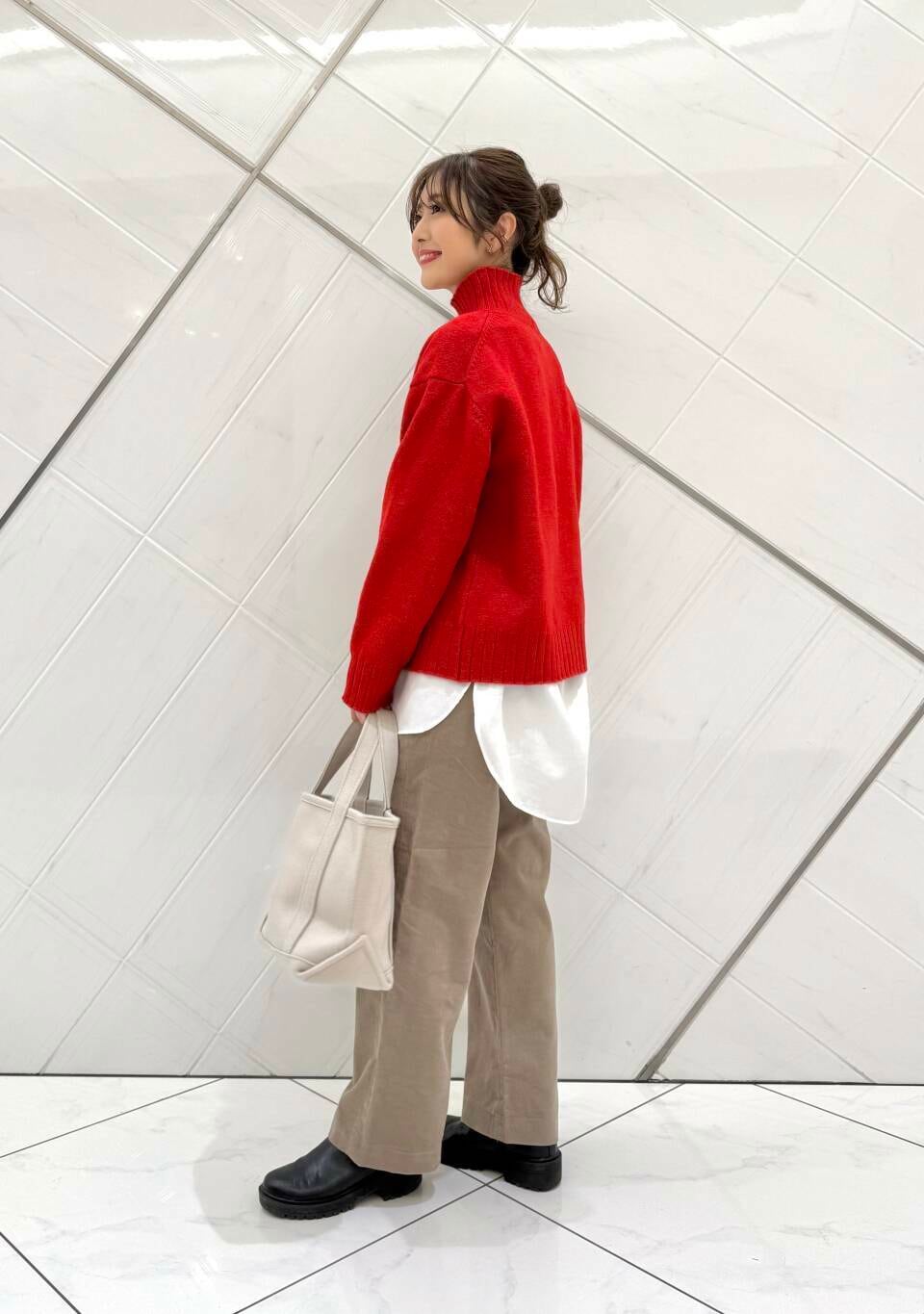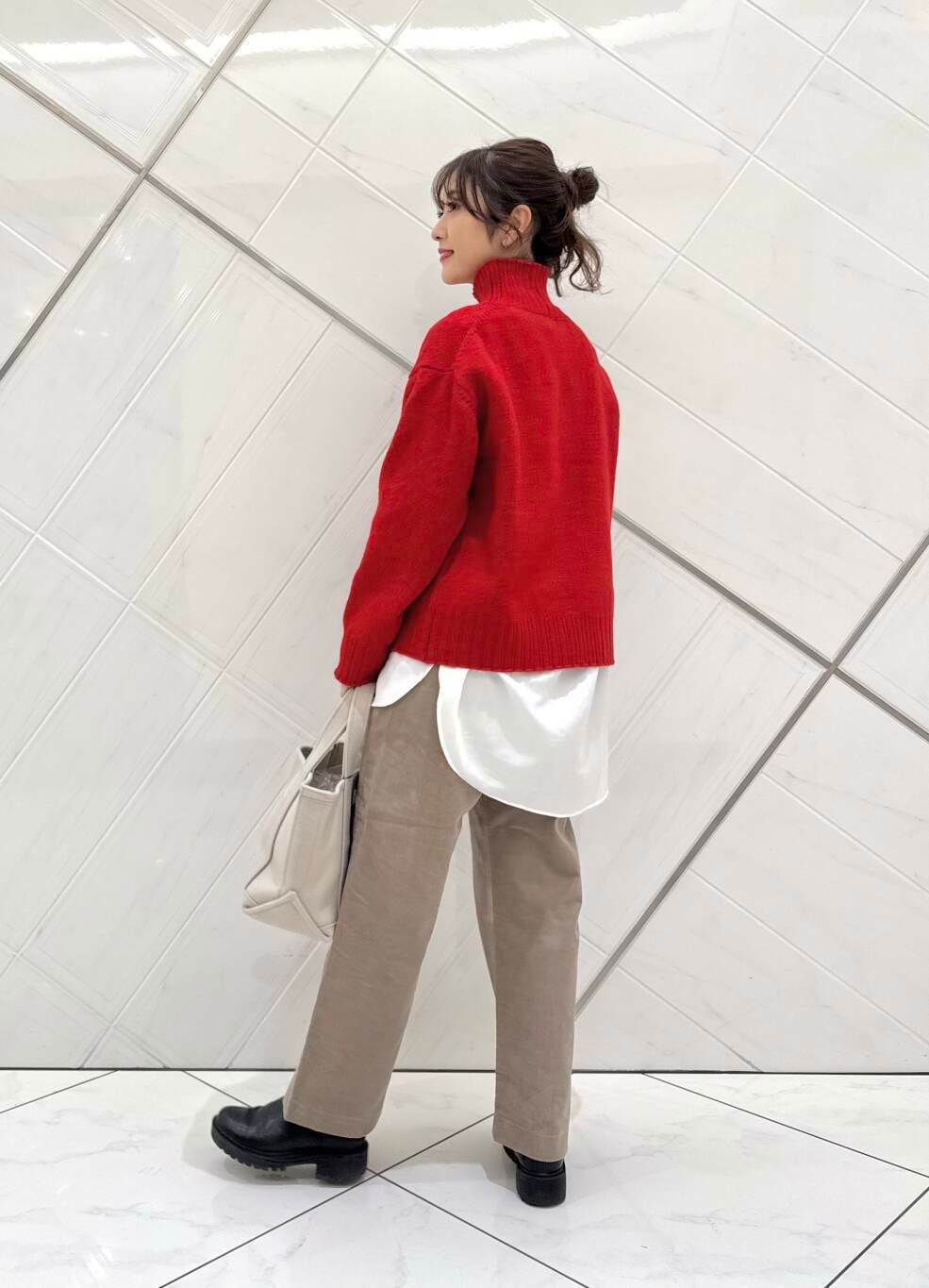 今回はニットにシャツをレイヤードし、アクセントを付けました(^^)