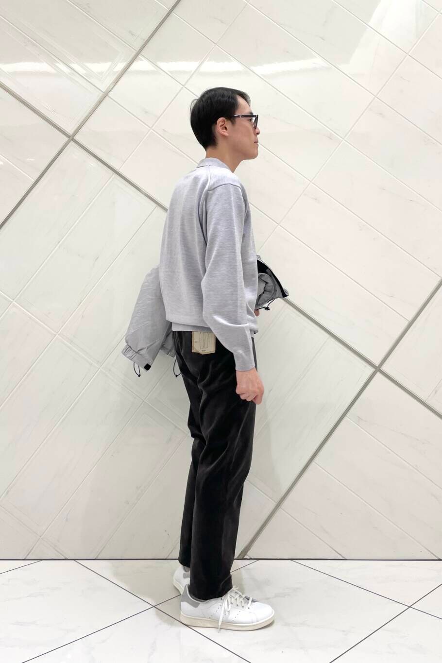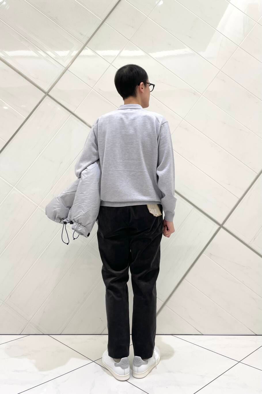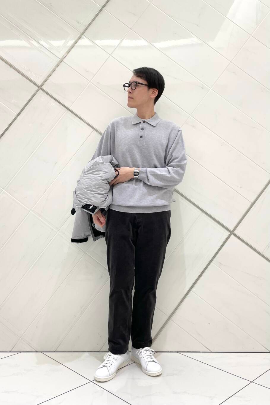 大好評により、新色が追加された200ニットアイテムから今回はポロシャツを着用させて頂きました。シルバーっぽい色味で、ハイゲージニットの光沢のある素材感が生かされたカラーだと思います。