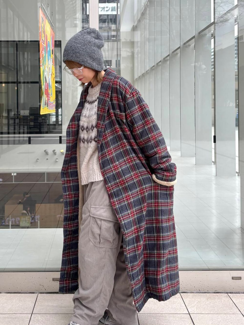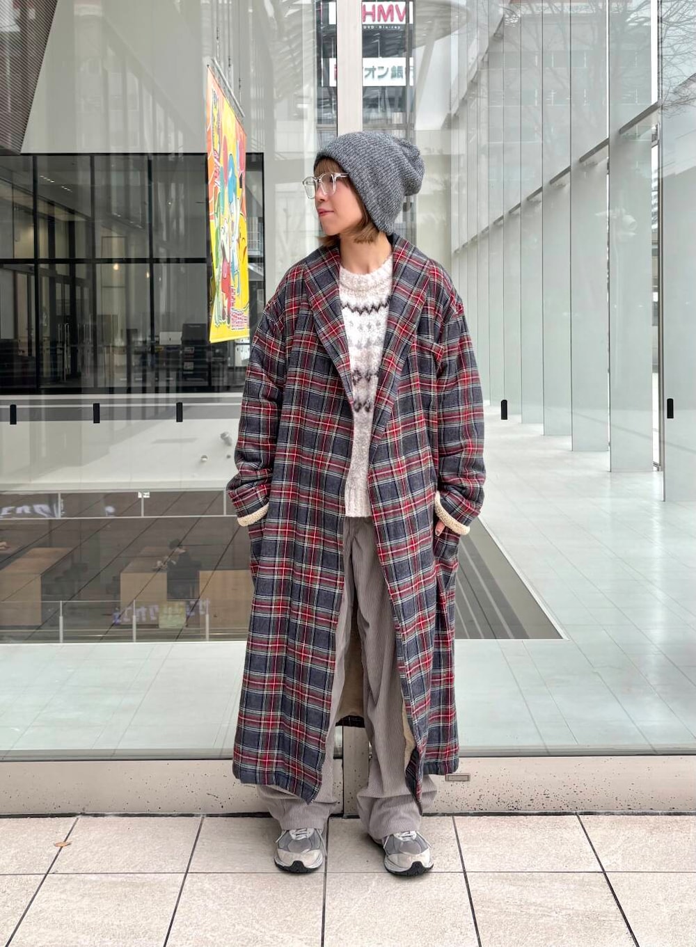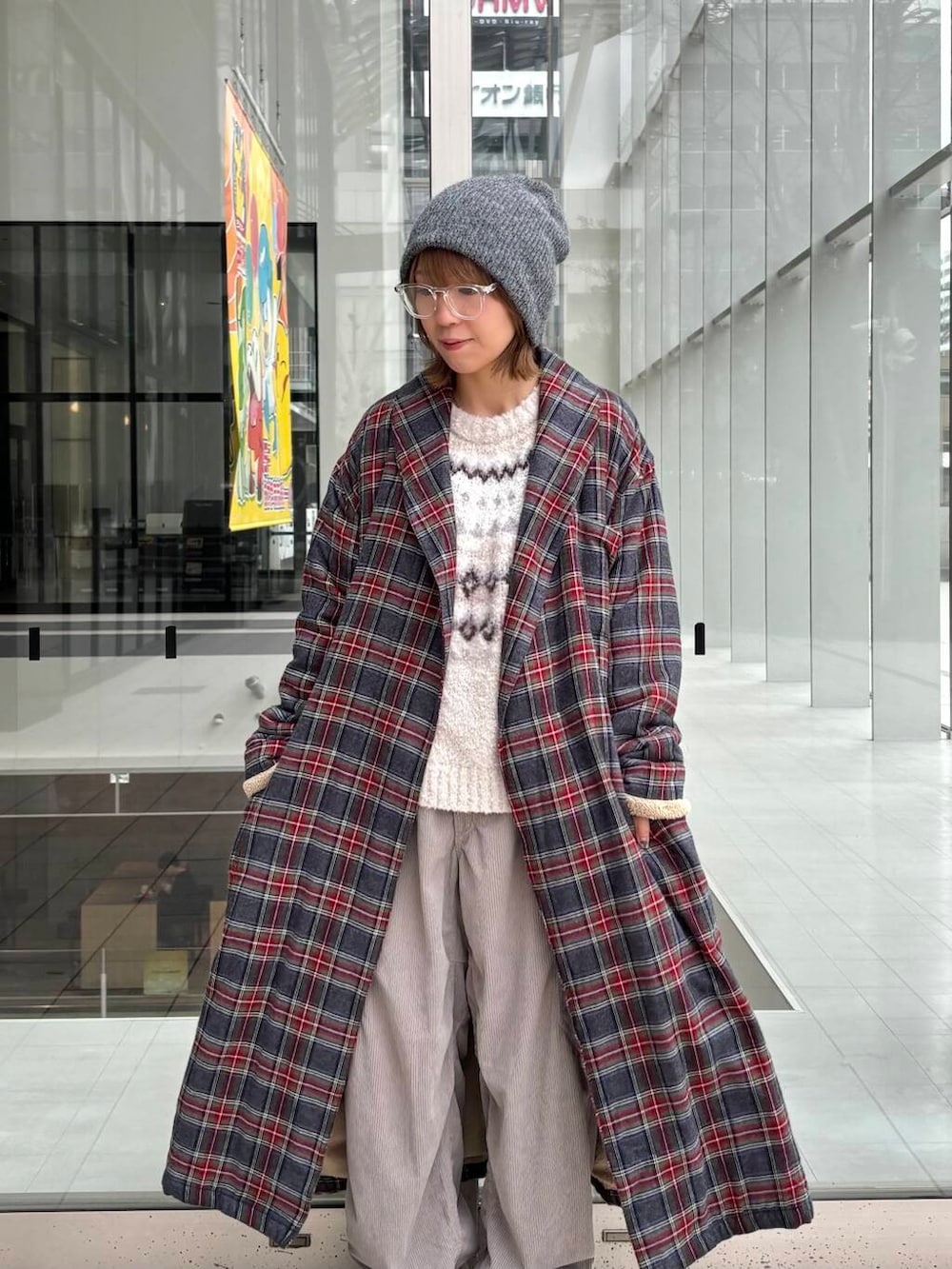 赤チェックのローブに、ノルディック柄のニットを合わせてホリデーコーデを組んでみました🎄🎅🏼