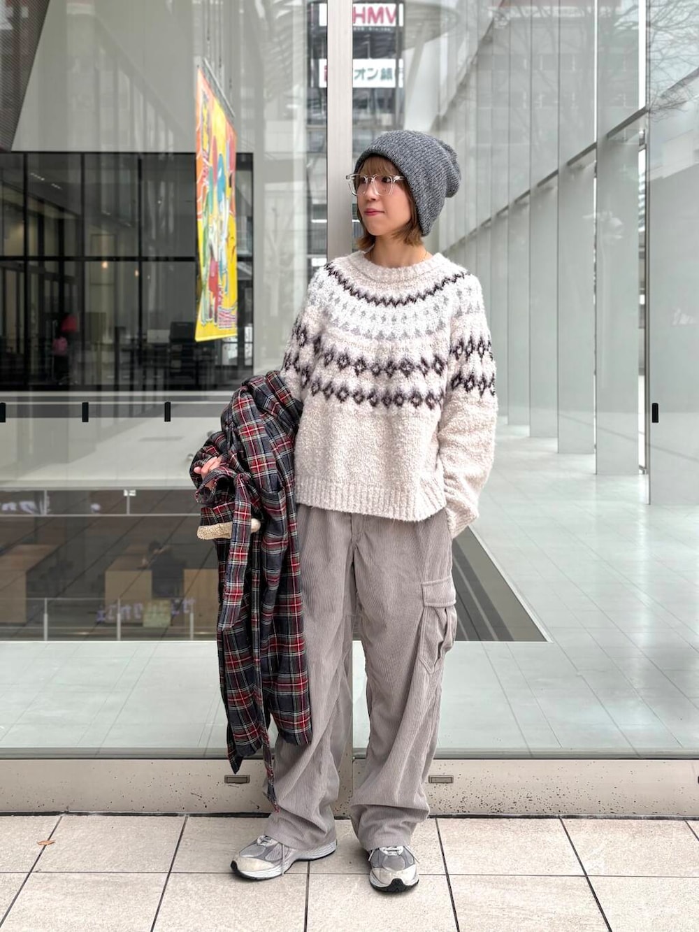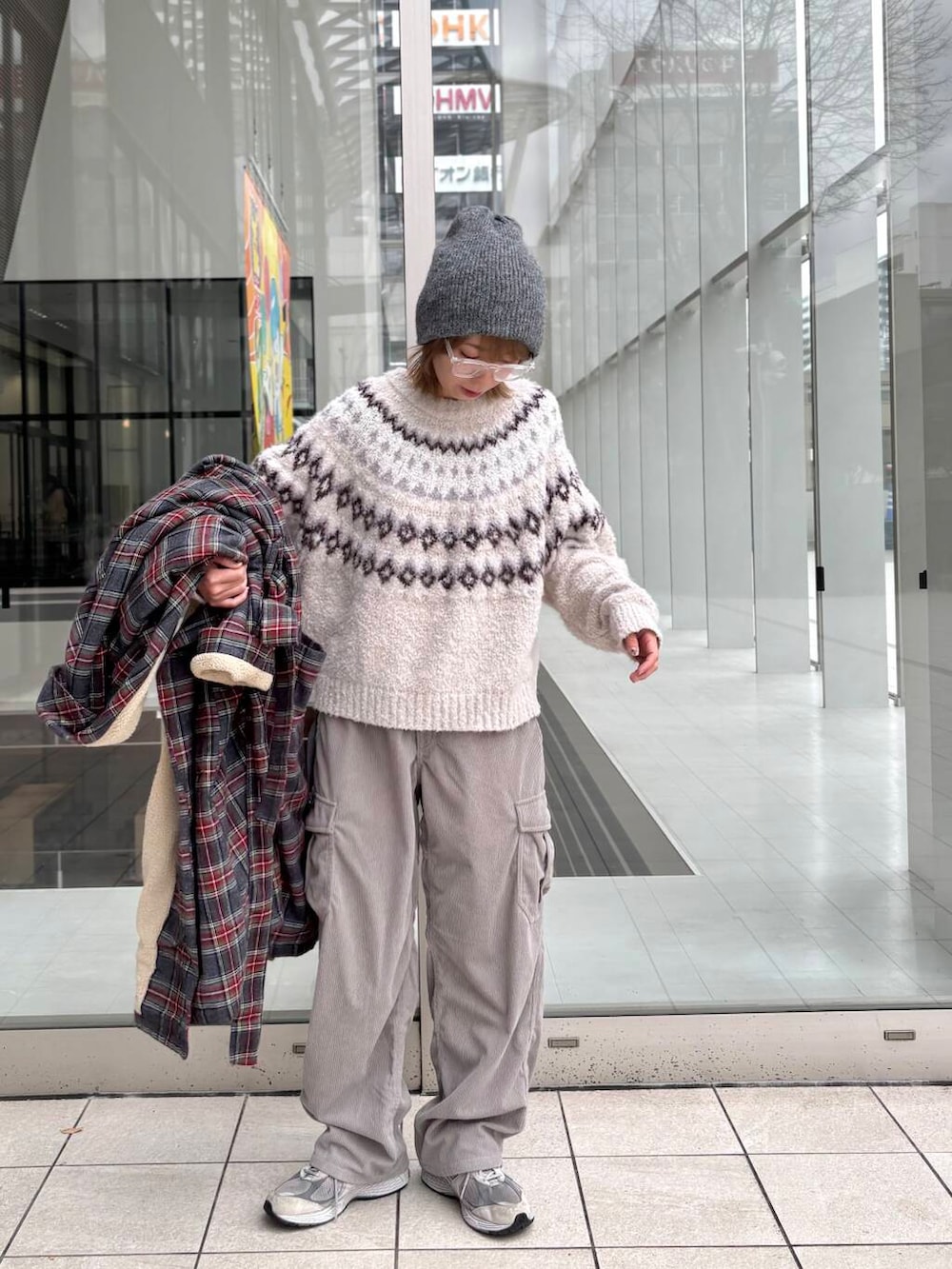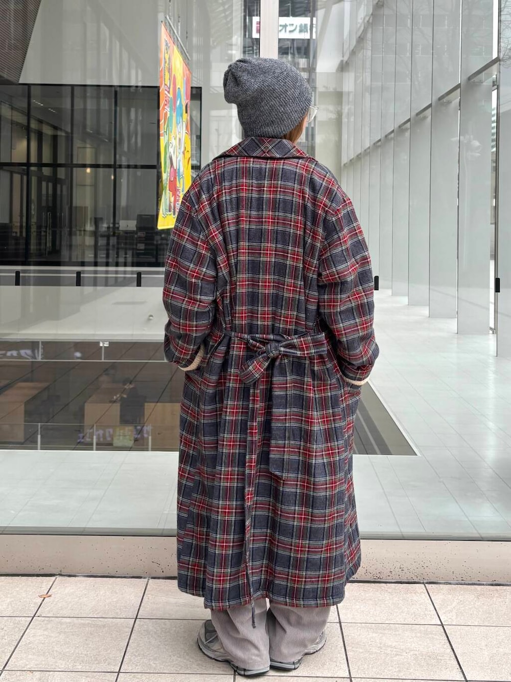 赤チェックのローブに、ノルディック柄のニットを合わせてホリデーコーデを組んでみました🎄🎅🏼