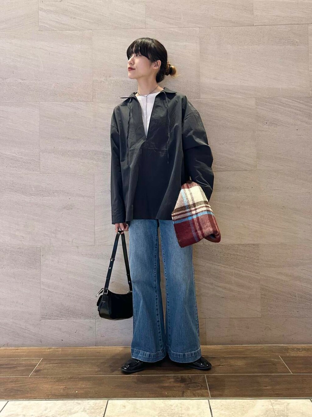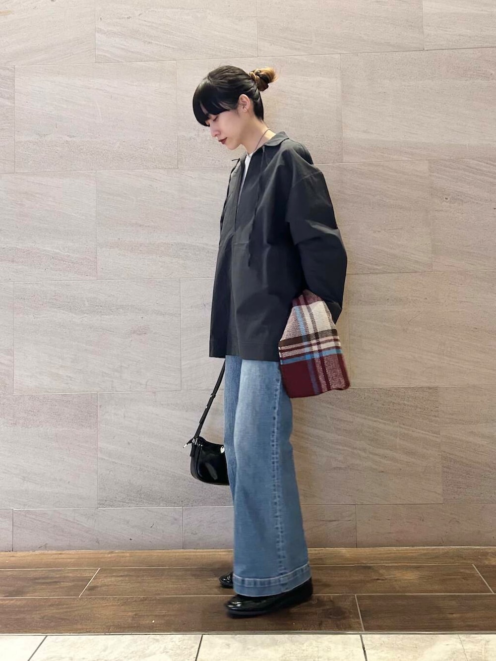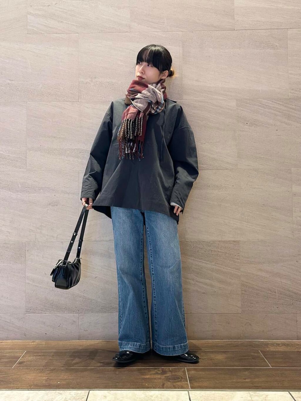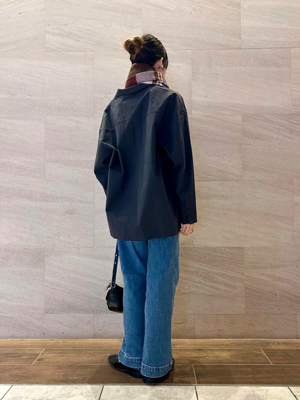 ゆるっとシルエットのシャツは、インナーにタートルネックをいれても◎