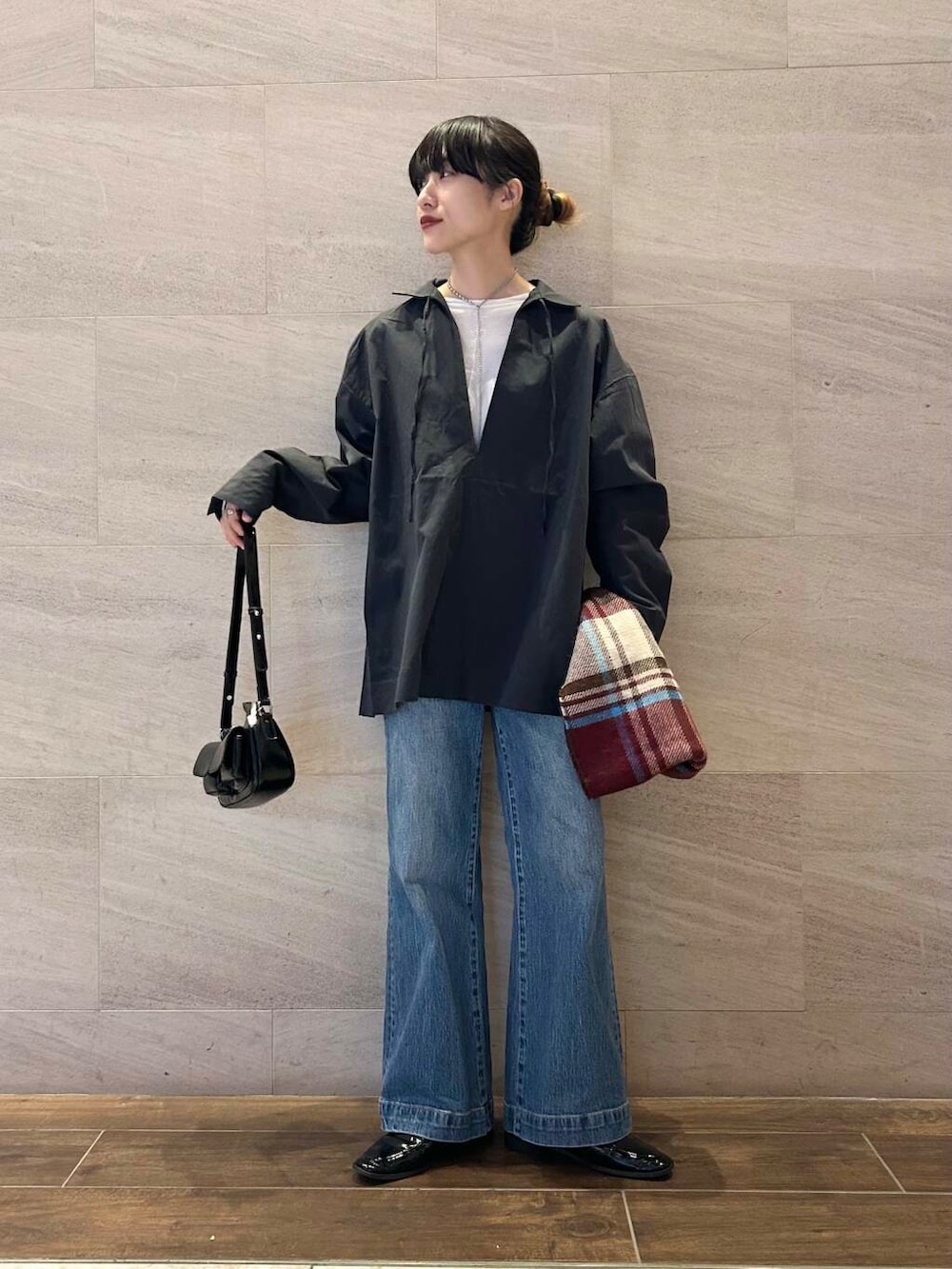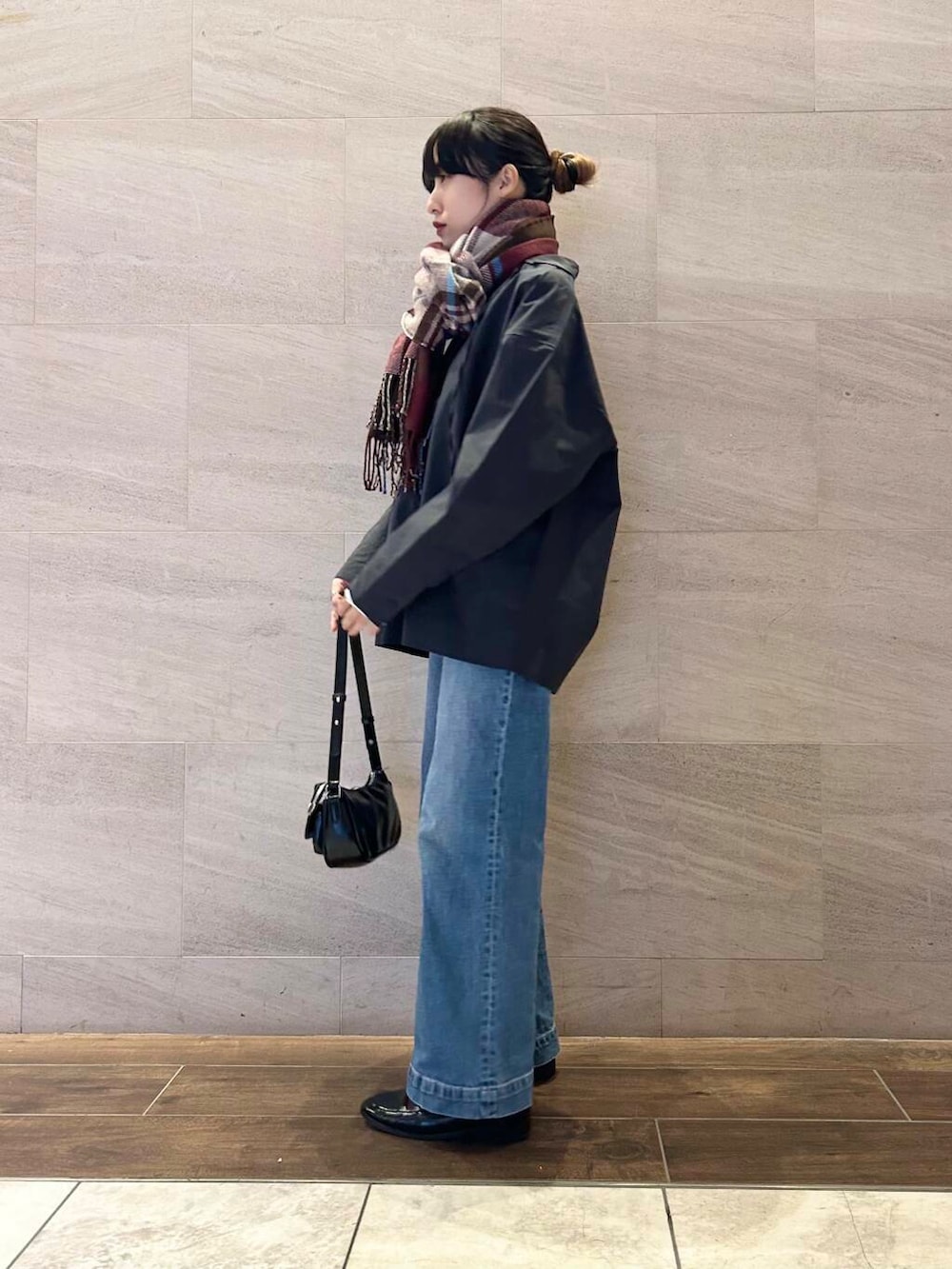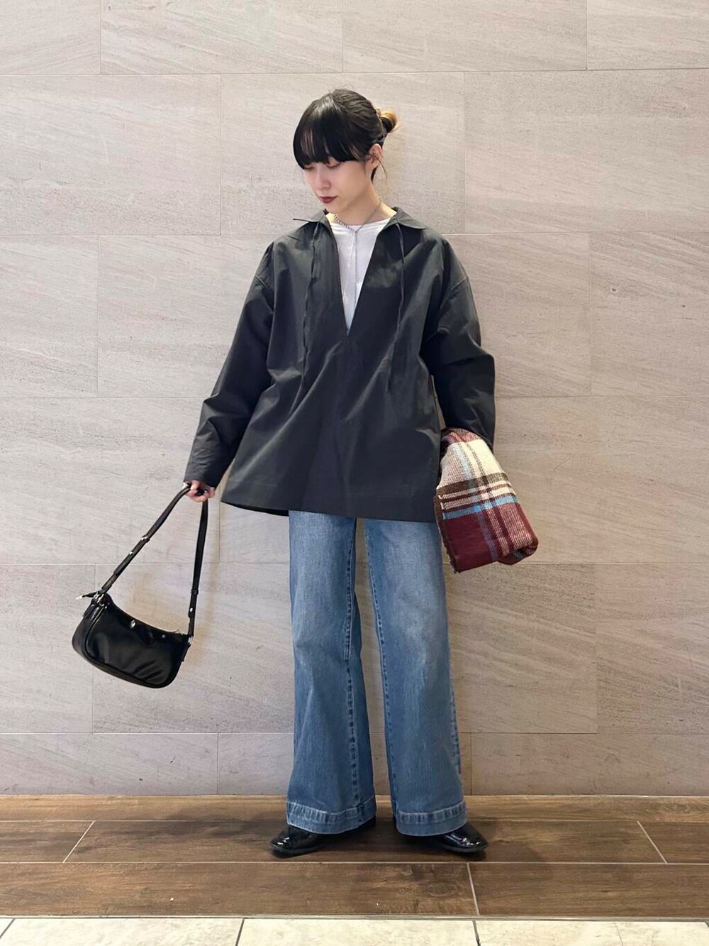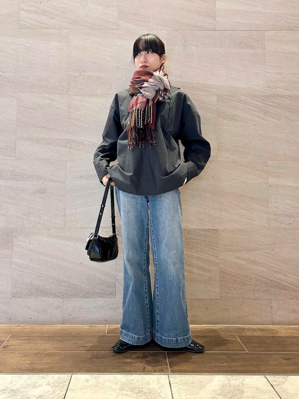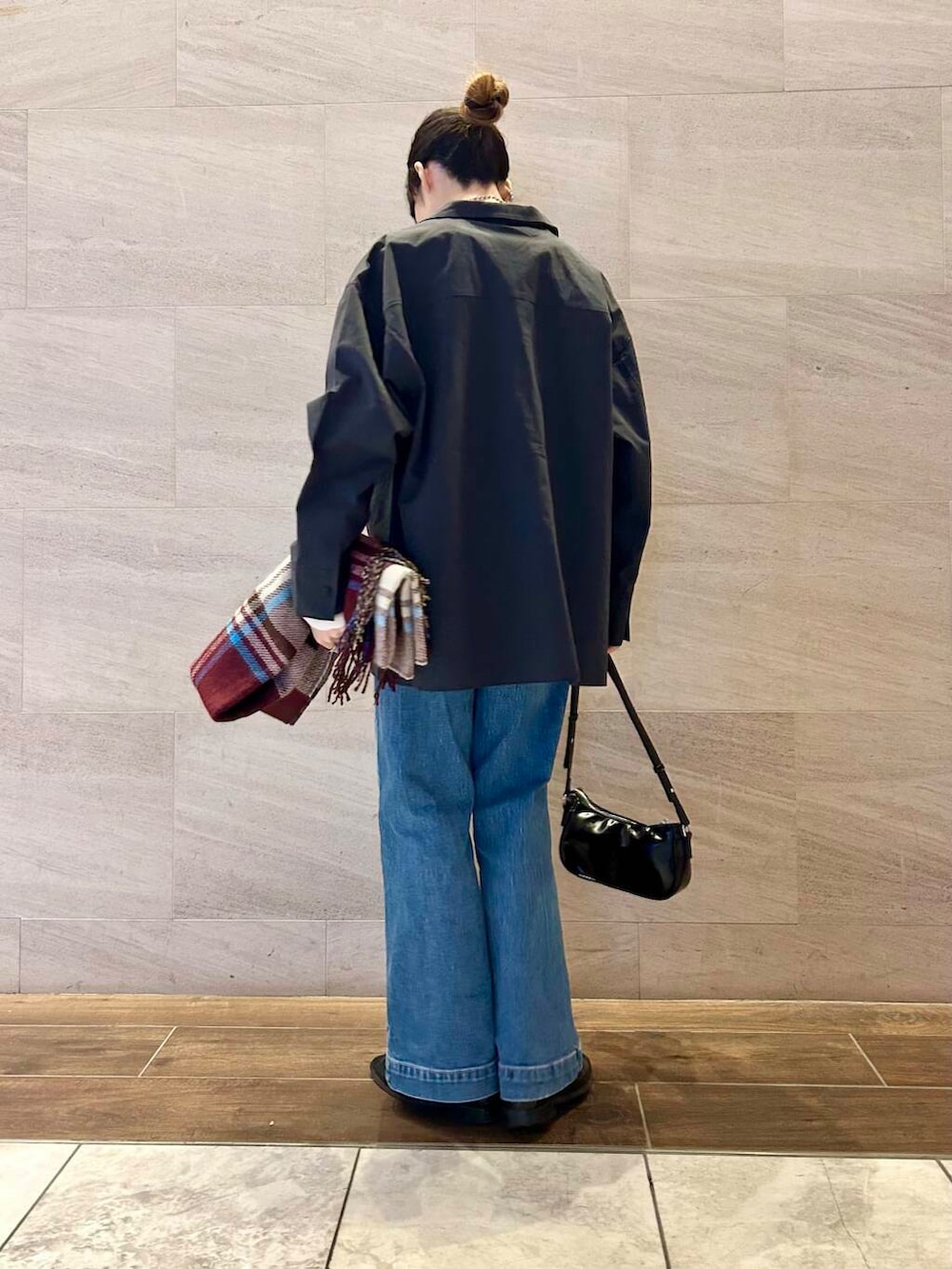 ゆるっとシルエットのシャツは、インナーにタートルネックをいれても◎