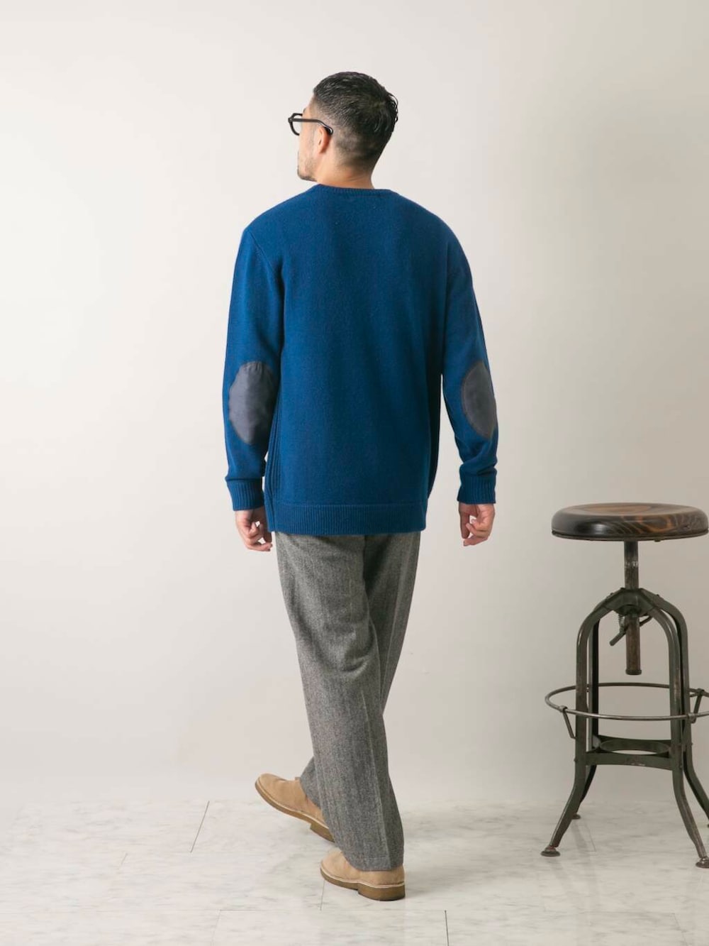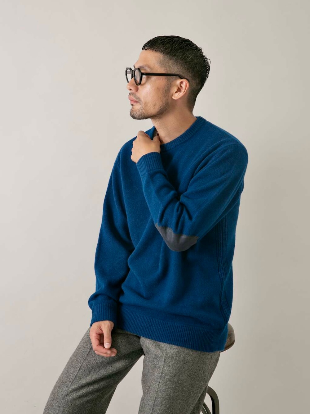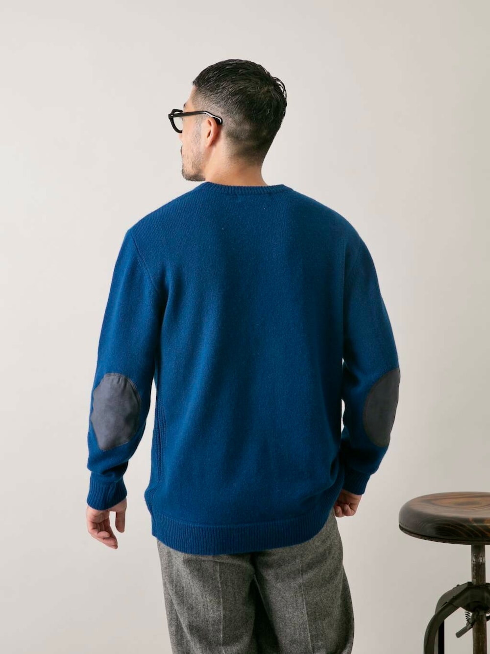 発色の良いハミルトンウール素材にエルボーパッチ、1枚でも様になるイチ押しニット。