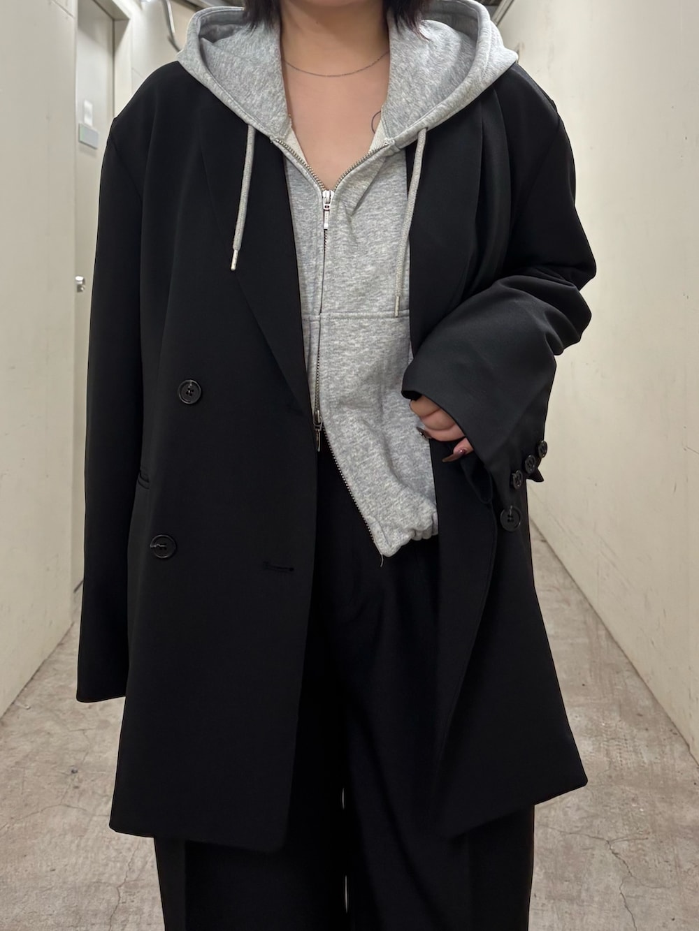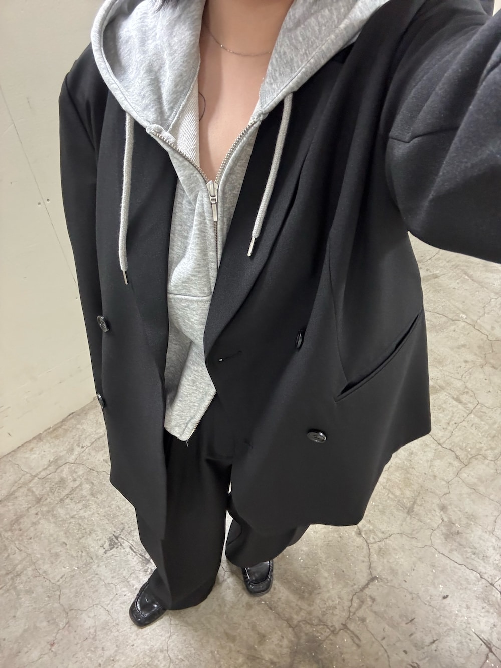 ・カチッとしたジャケットのセットアップにパーカーを挟むことで、キレイめ感は残しつつも少しカジュアルな雰囲気を演出!