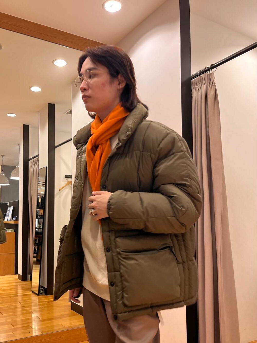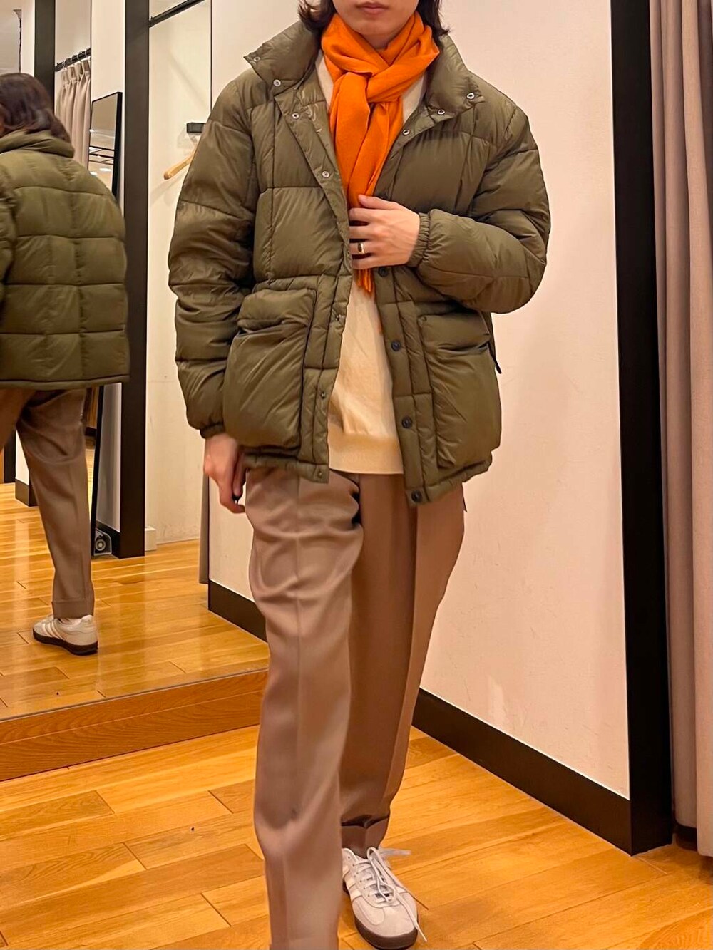 taionの800フィルパー、明るいオリーブを着用、インナーもニットを着て、テーパードパンツ合わせ。