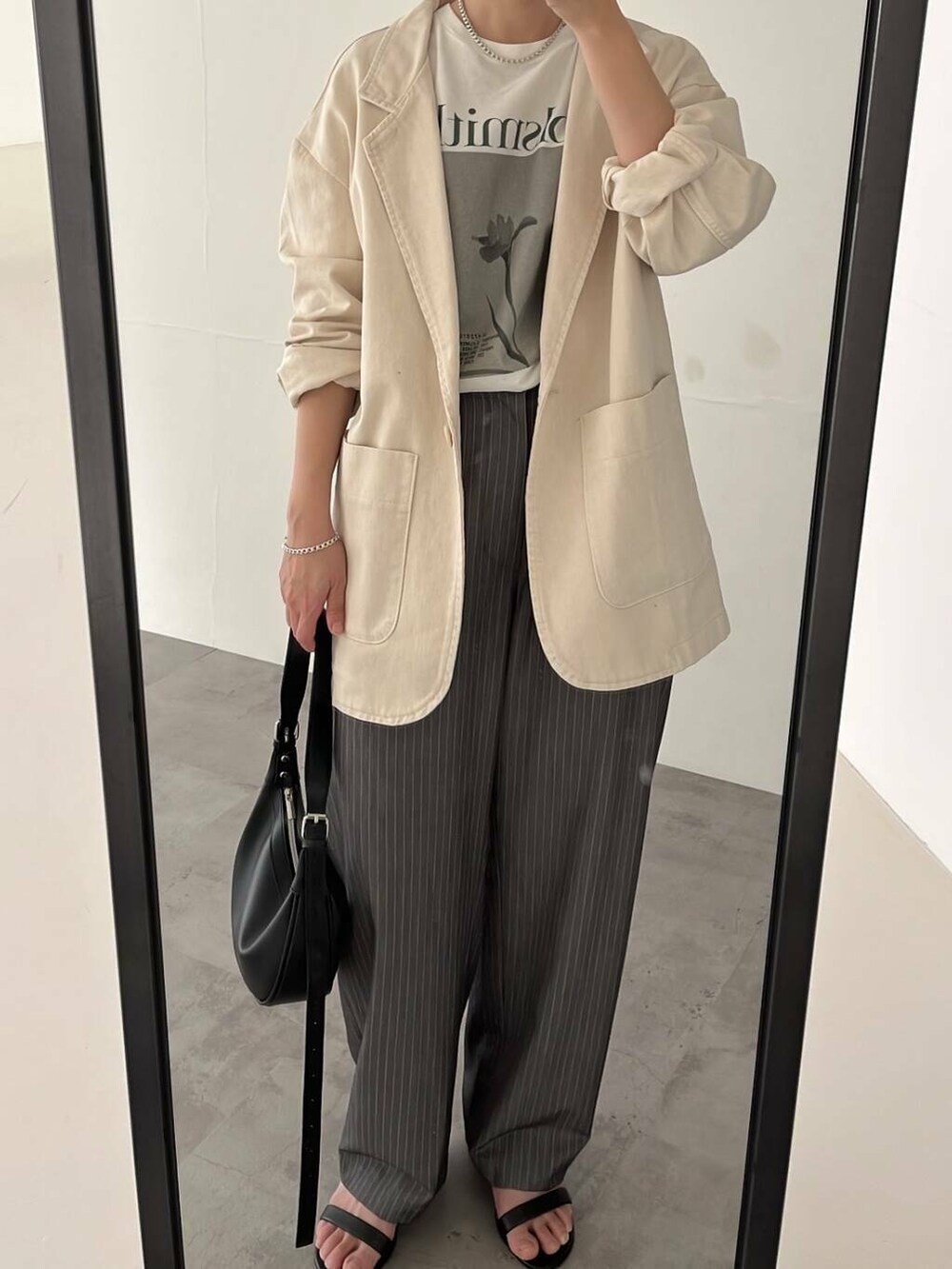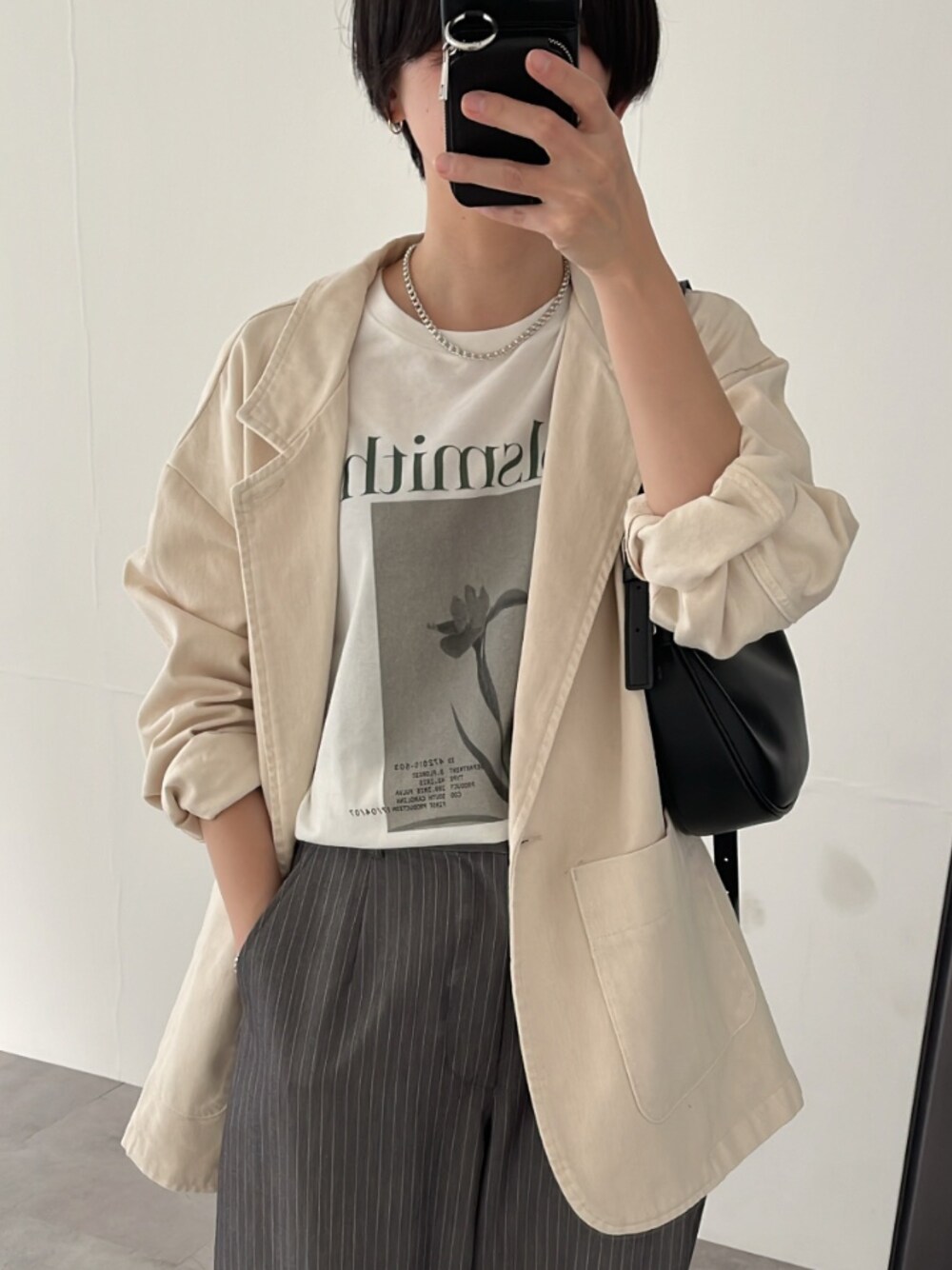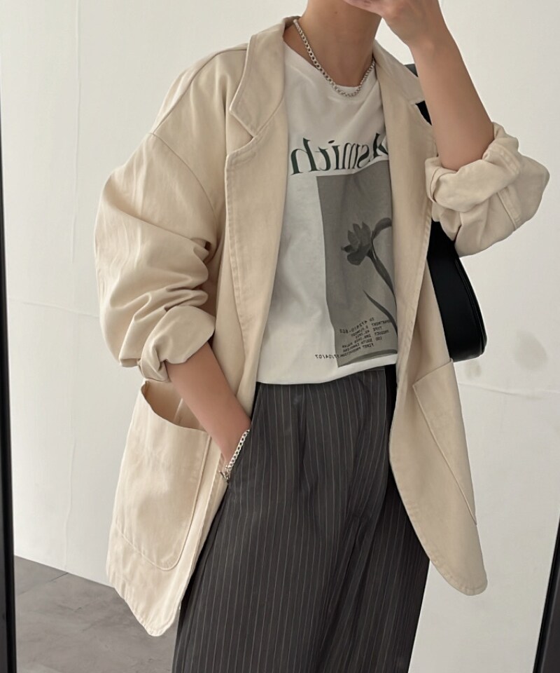 シルエットは着丈が長めのオーバーサイズに、下がった衿とワンボタンデザインが、メンズライクでルーズな雰囲気を演出。
