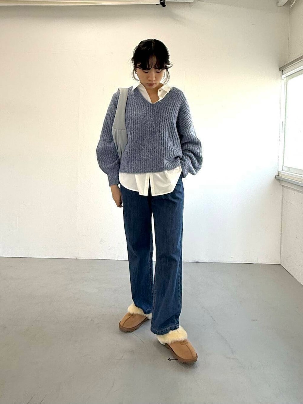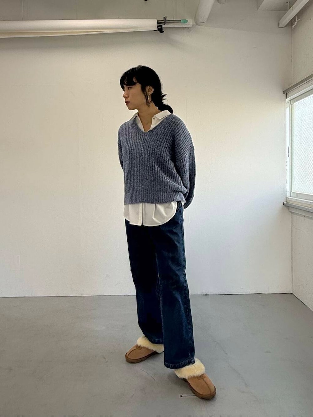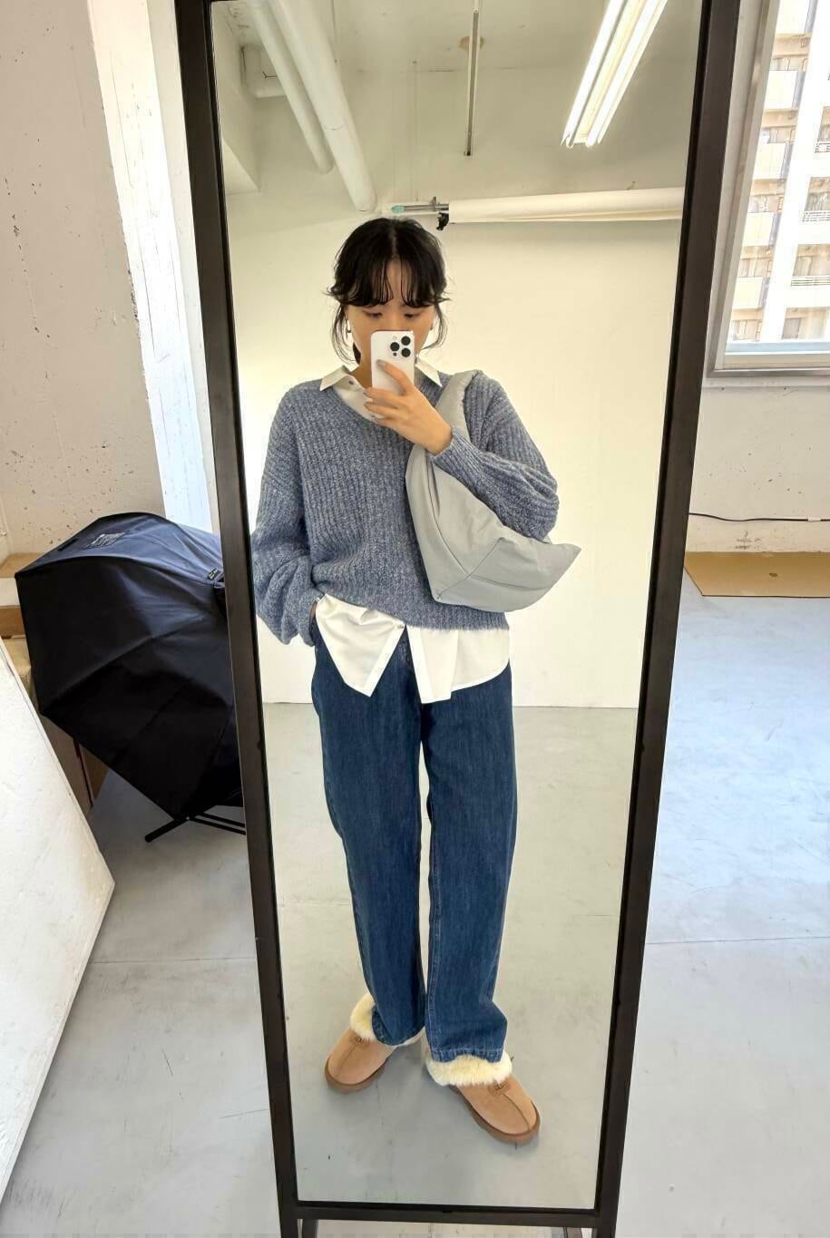 野暮ったくならないようにニットのなかにゴールドボタンのシャツをレイヤードしました。