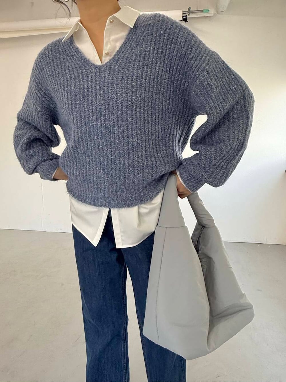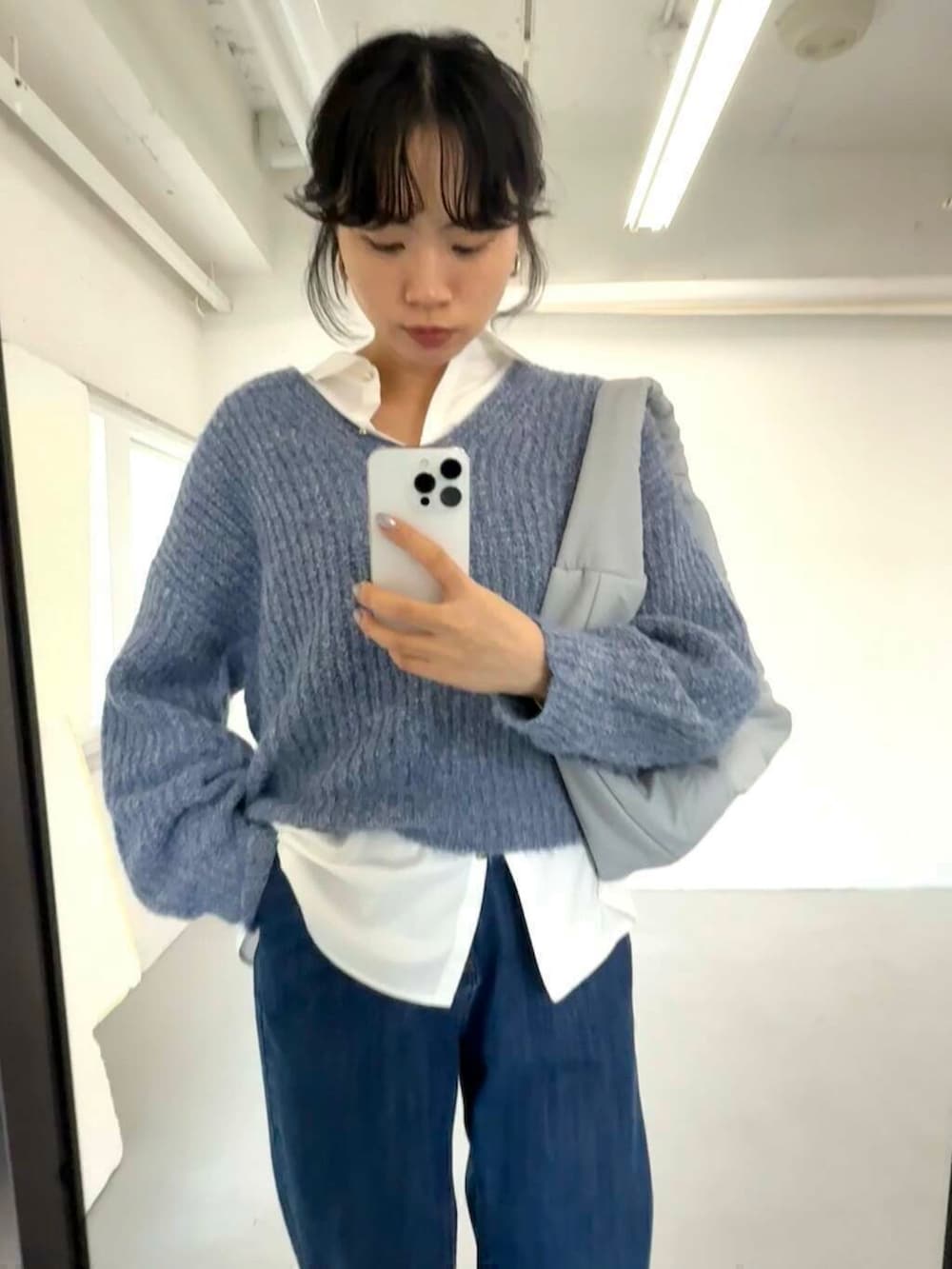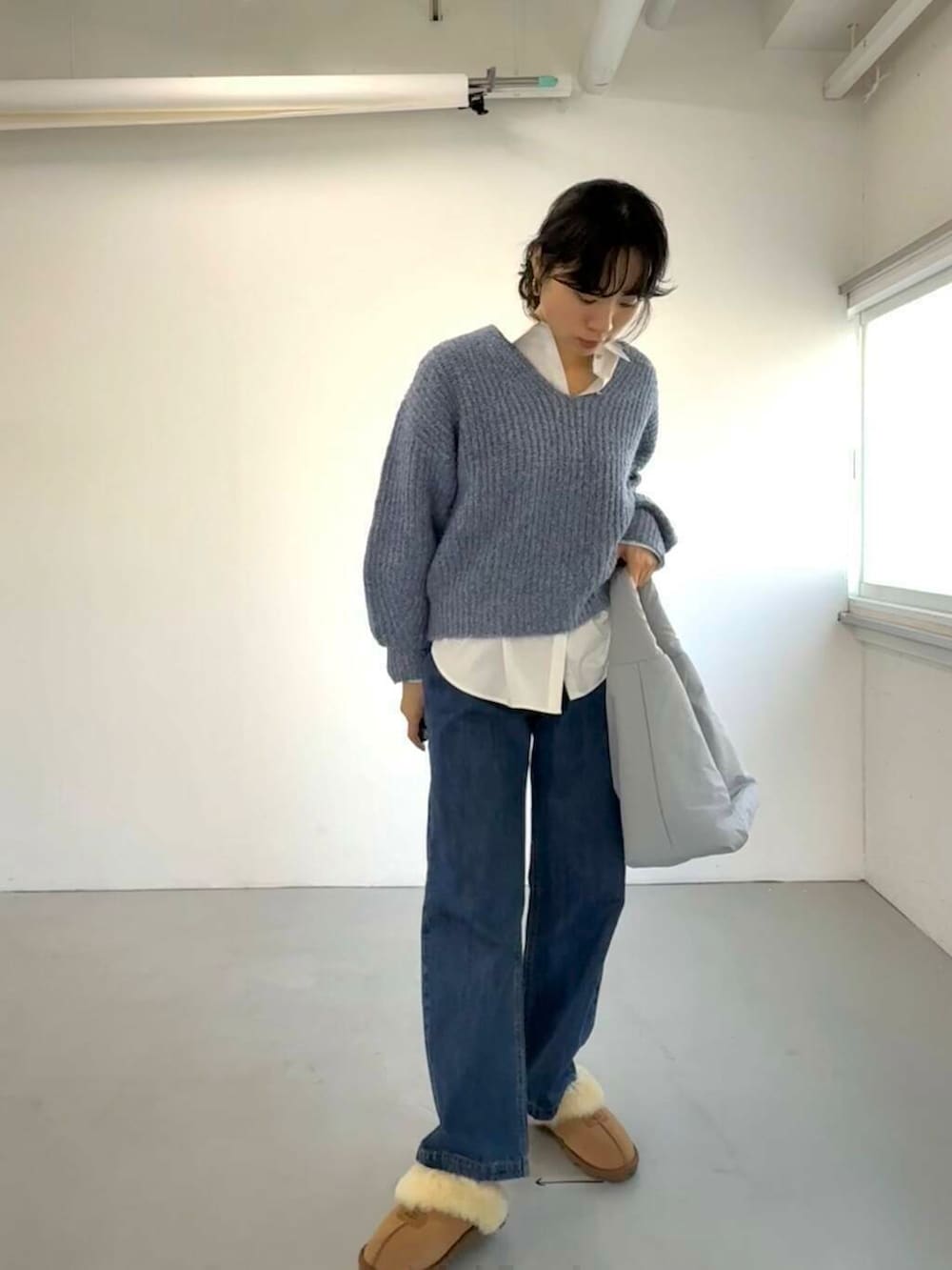 野暮ったくならないようにニットのなかにゴールドボタンのシャツをレイヤードしました。