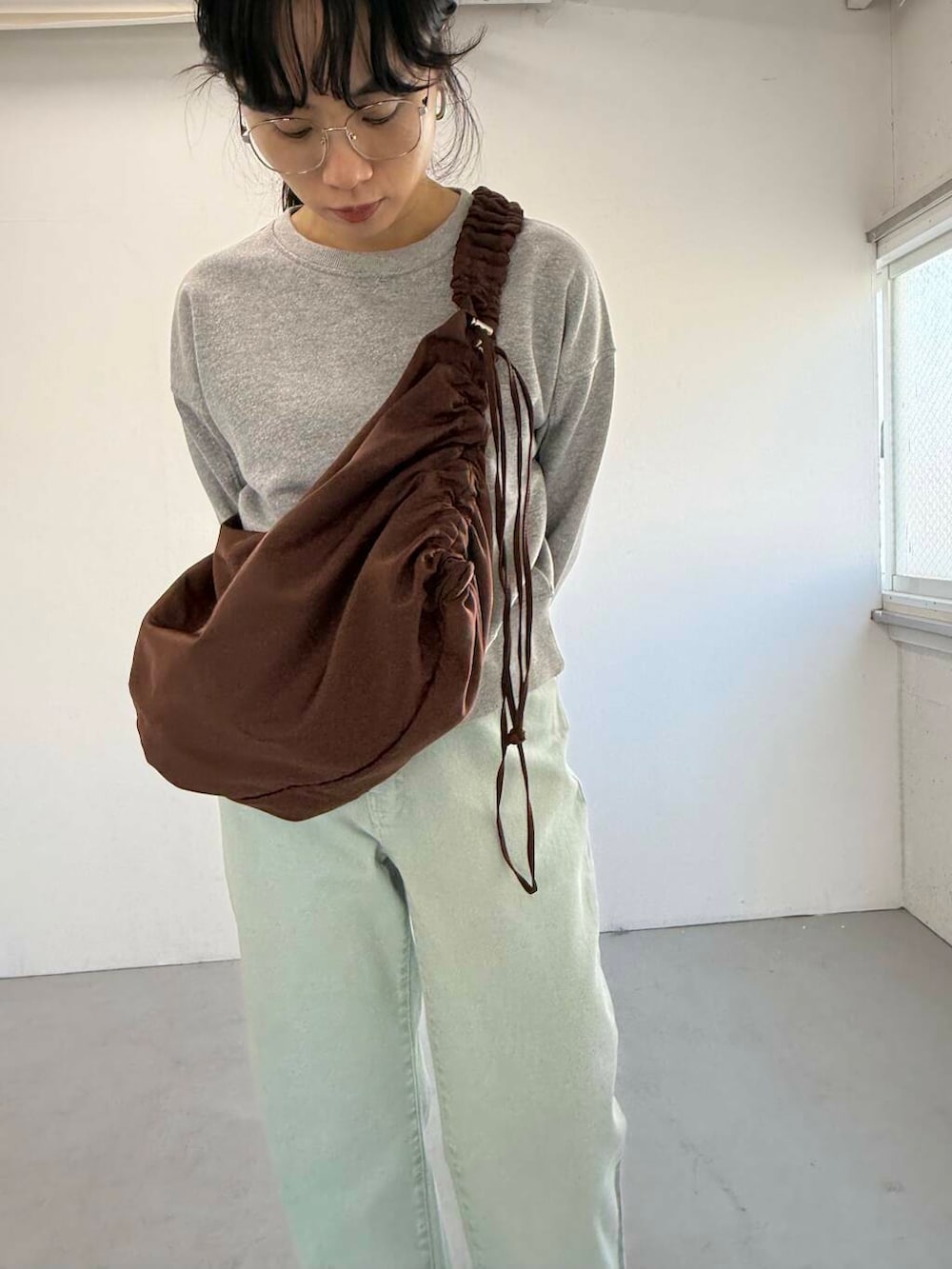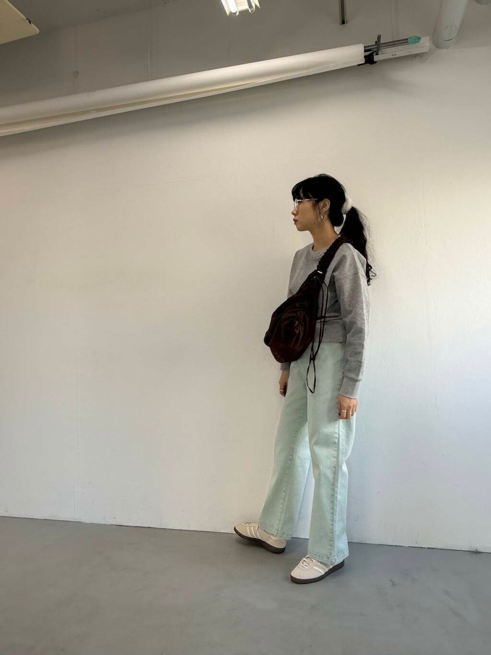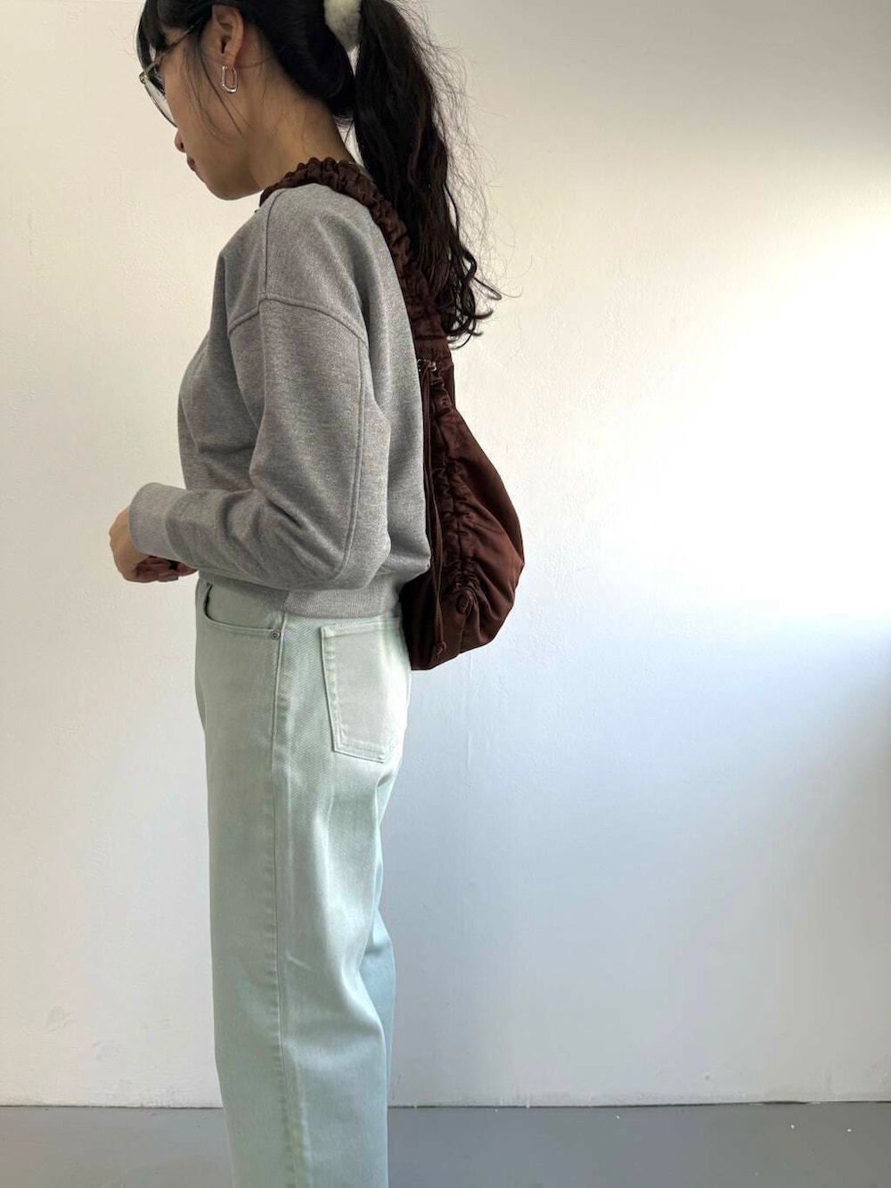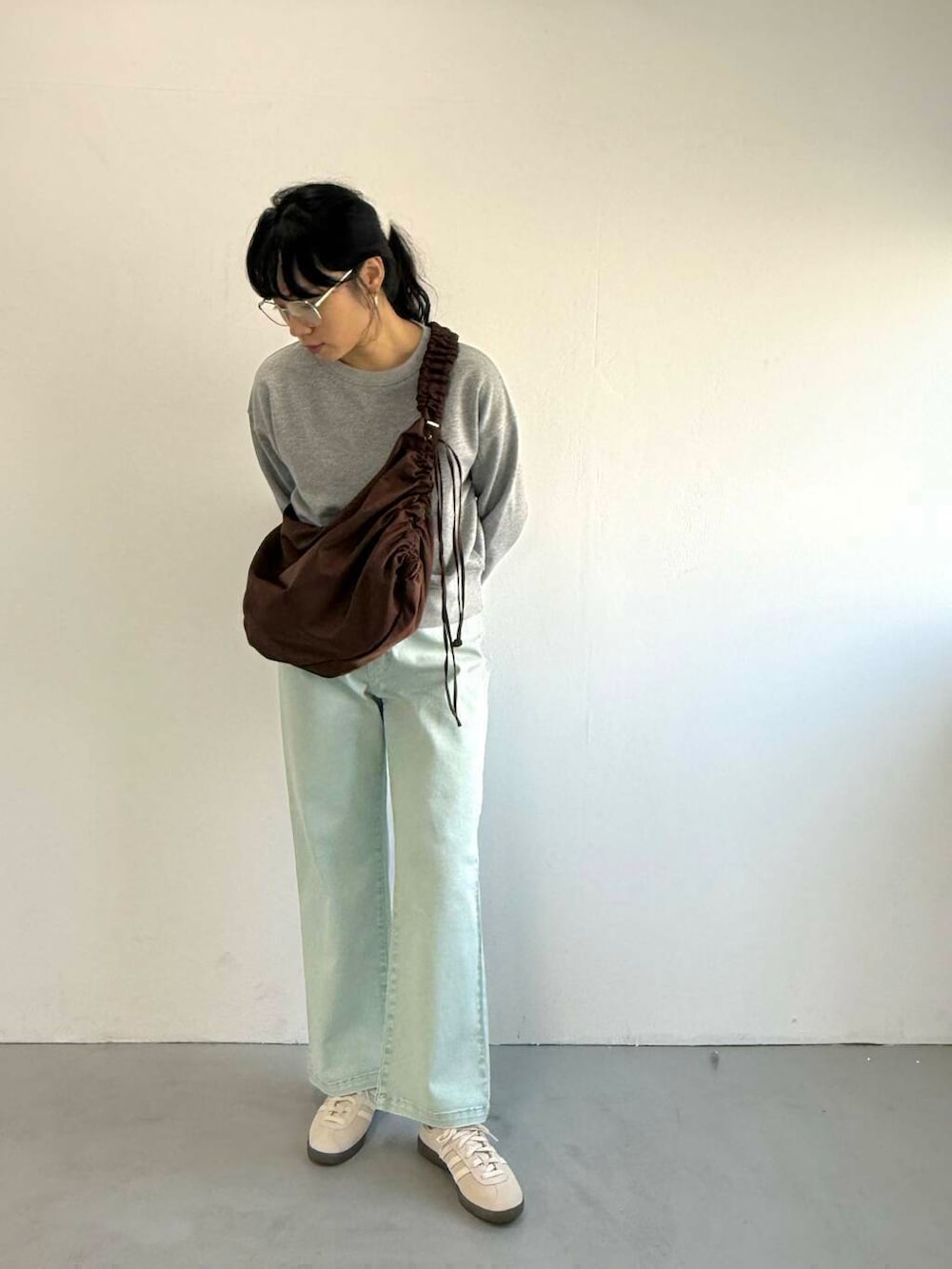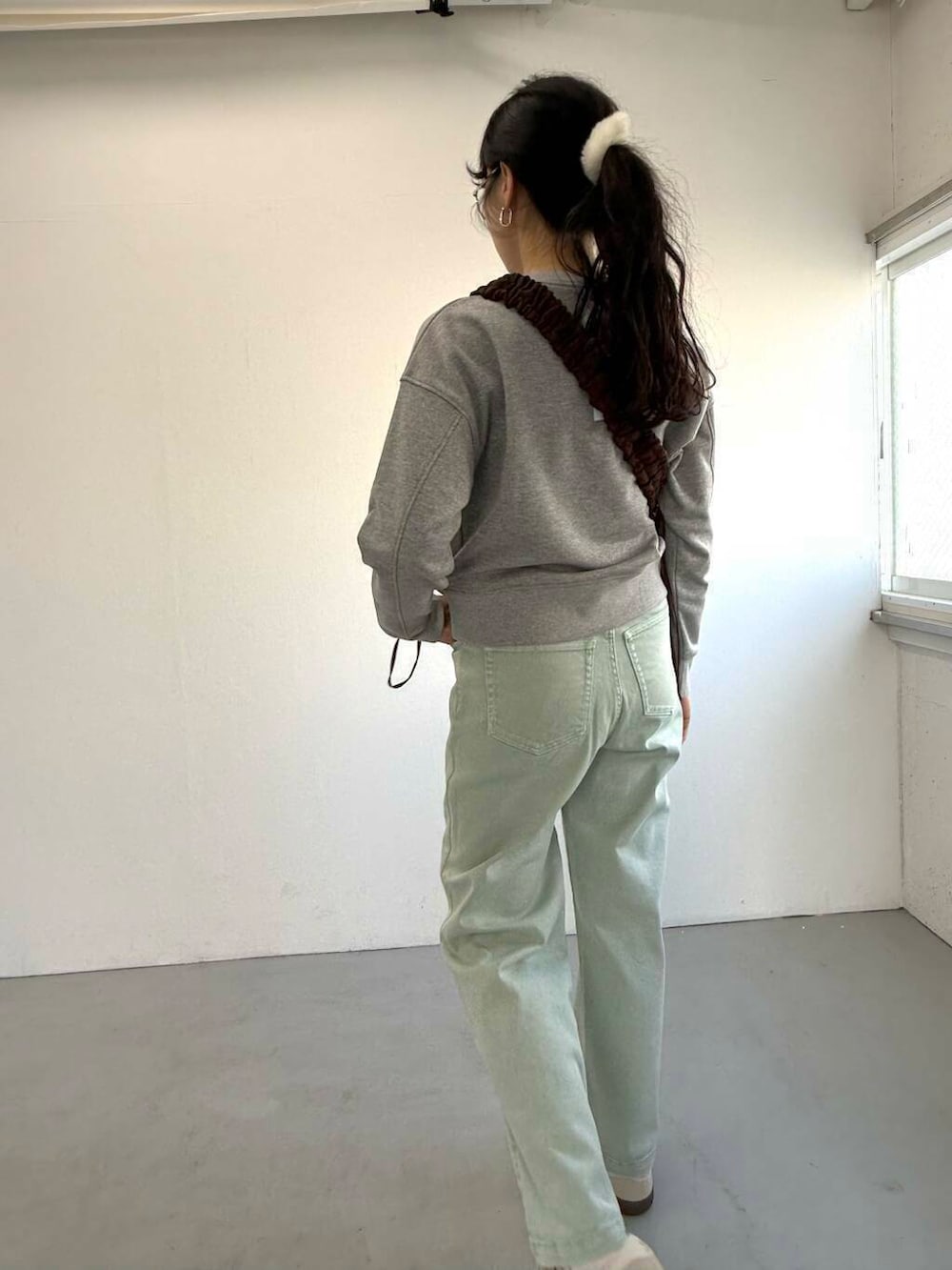 カラーパンツはセミワイドの程よいルーズ感が合わせやすく、製品染めの派手すぎないミントカラーがとてもかわいいです。
