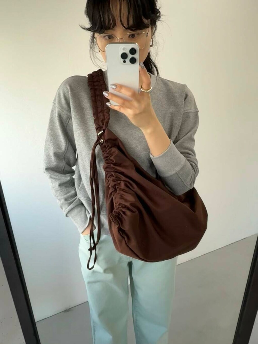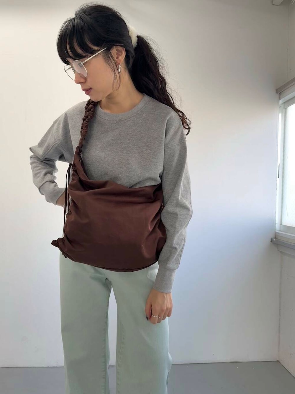 グレーのシンプルなスウェットですが、細かなラメが上品で華やかになるので、パンツ合わせでも野暮ったくなりません。
