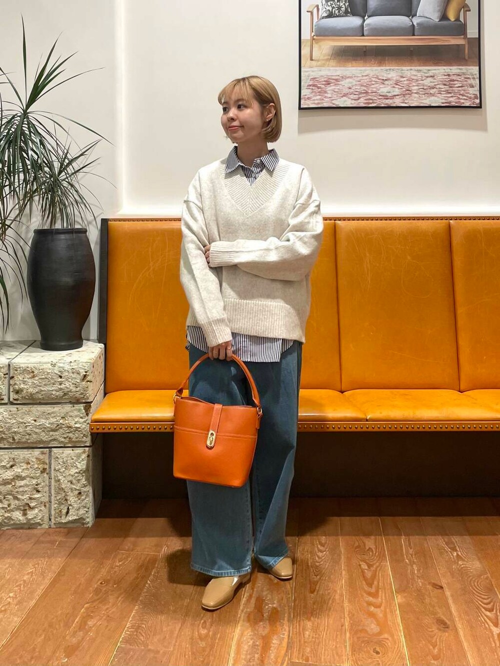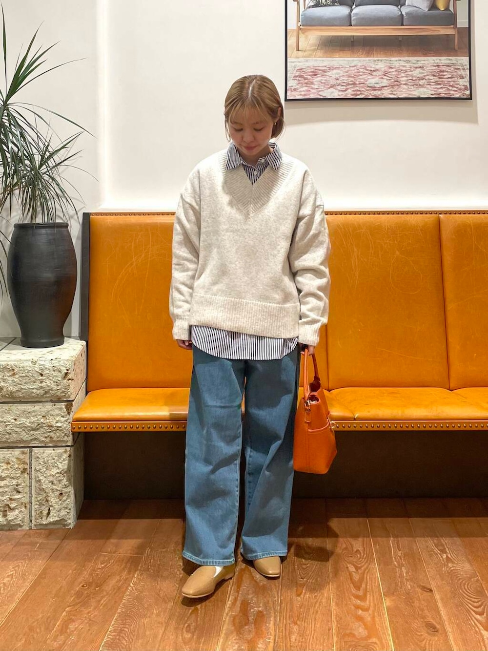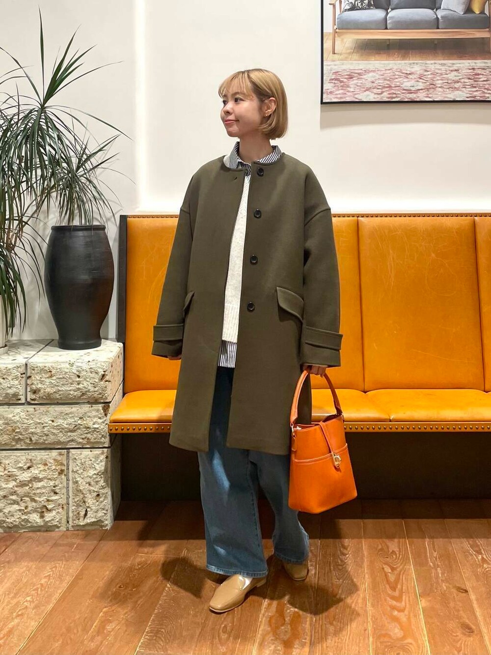 今回はカーキのコートに合わせてコーデを組みました。