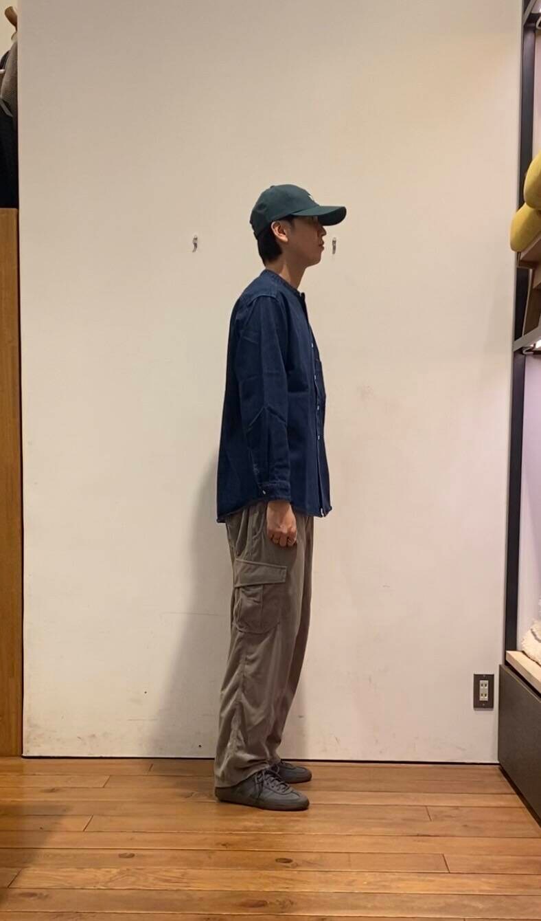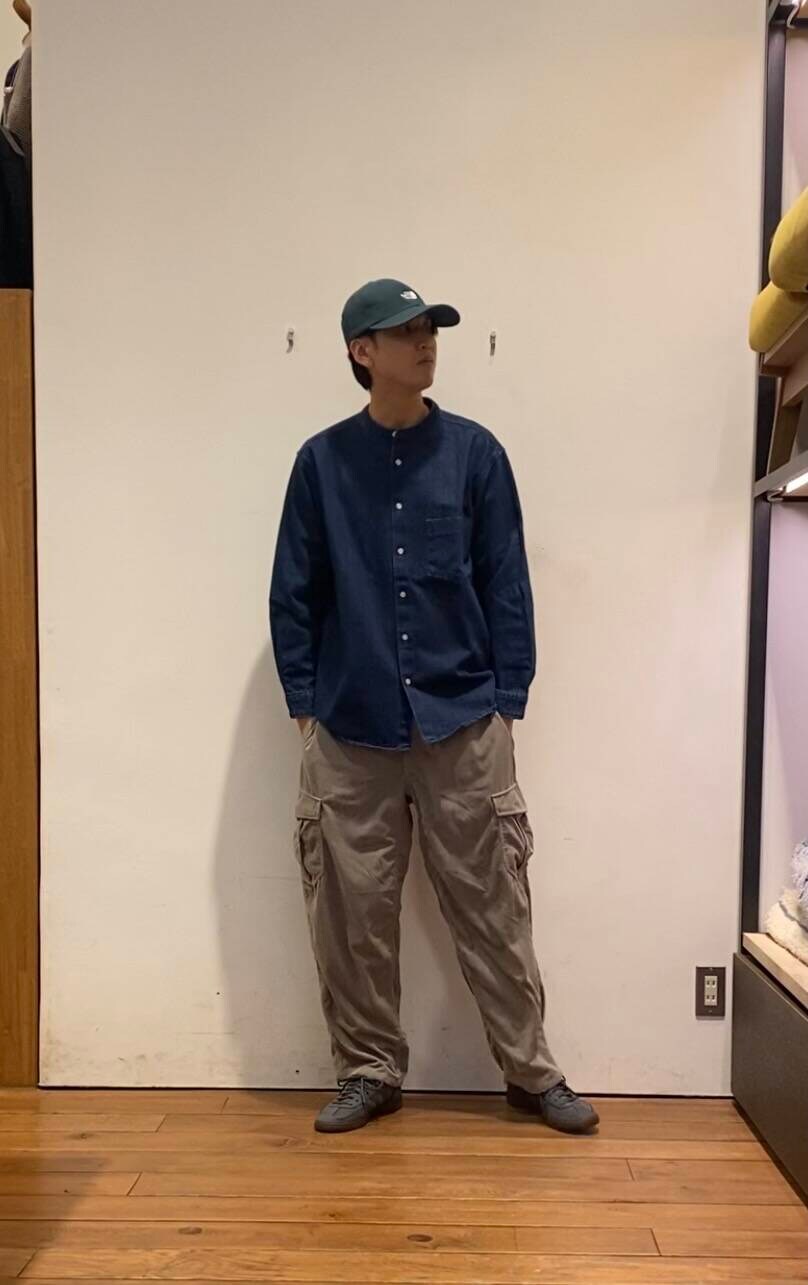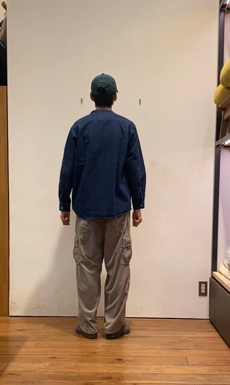 デニムのバンドカラーシャツは、シャツならではのきちんと感がなく決まりすぎないので何にでも合わせやすくなっております!
