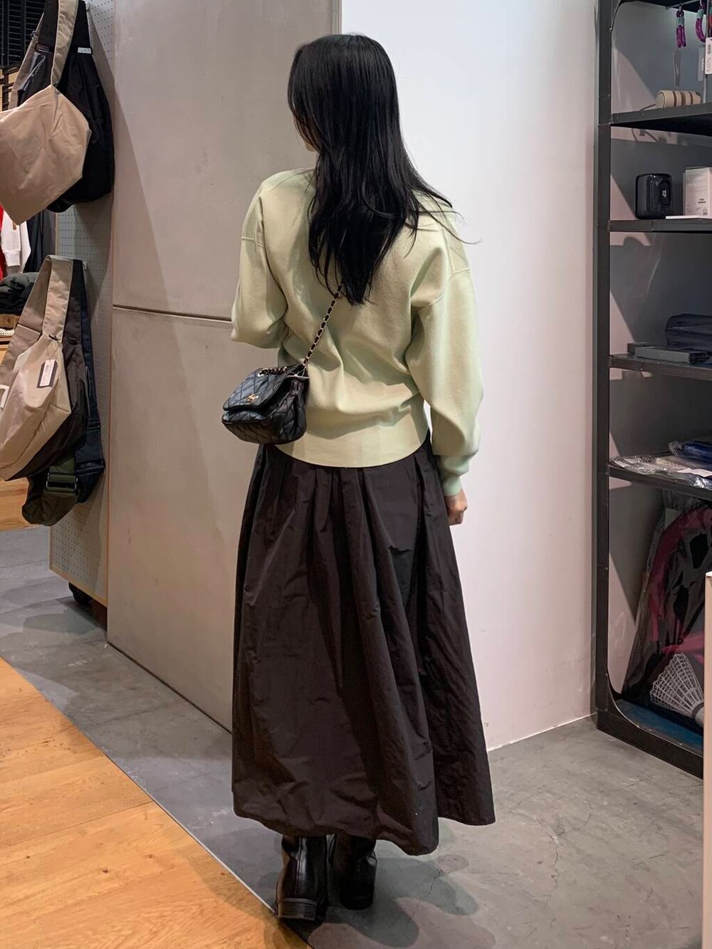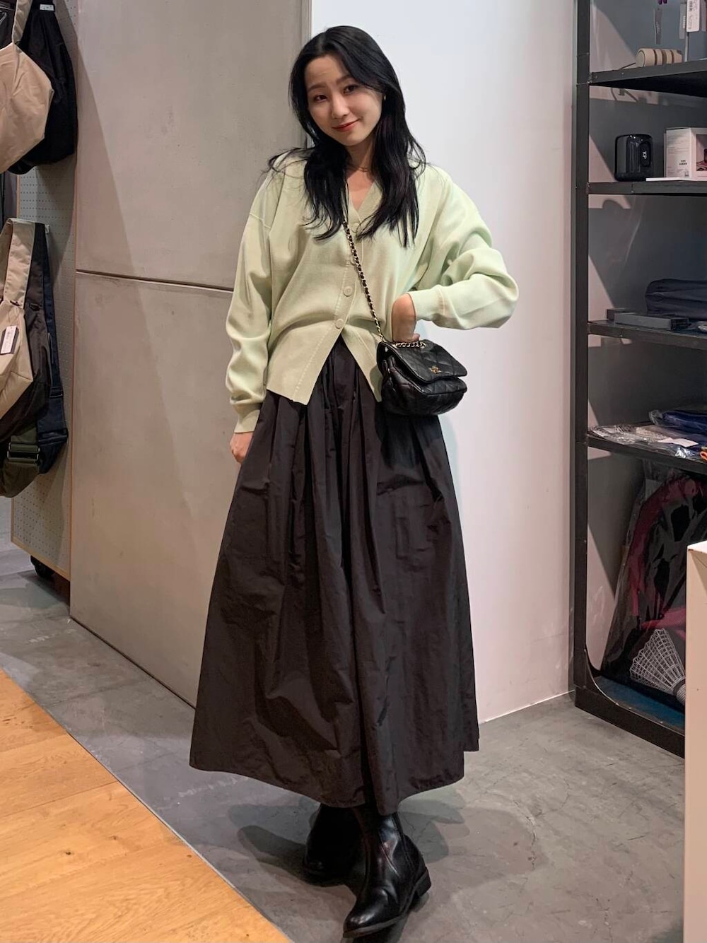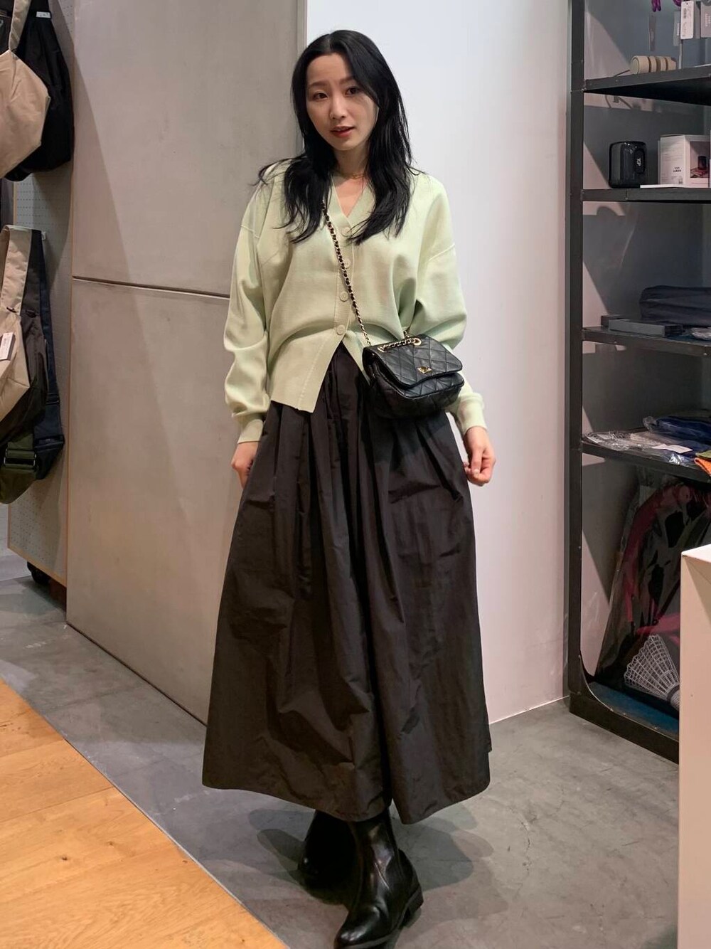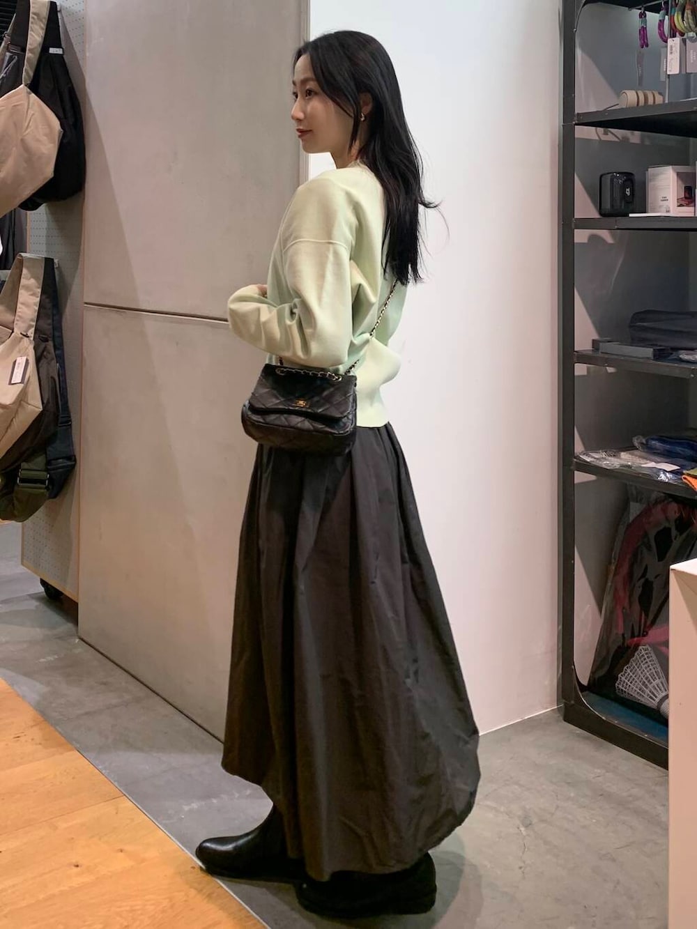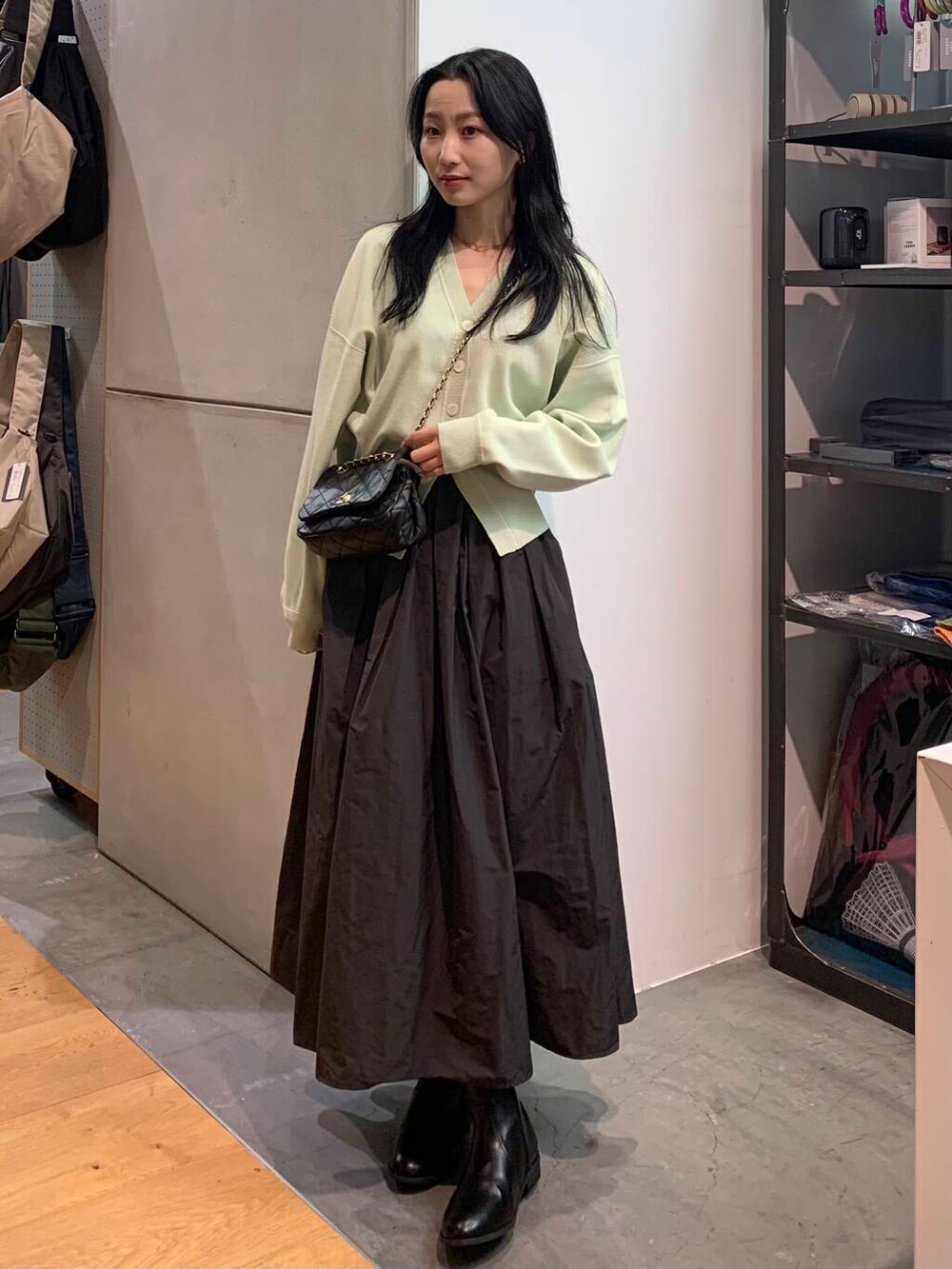 ただ、ボトムも同じ明るい色で合わせてしまうと、春すぎるので、チャコールのスカートで合わせ、バランスをとりました~~~!